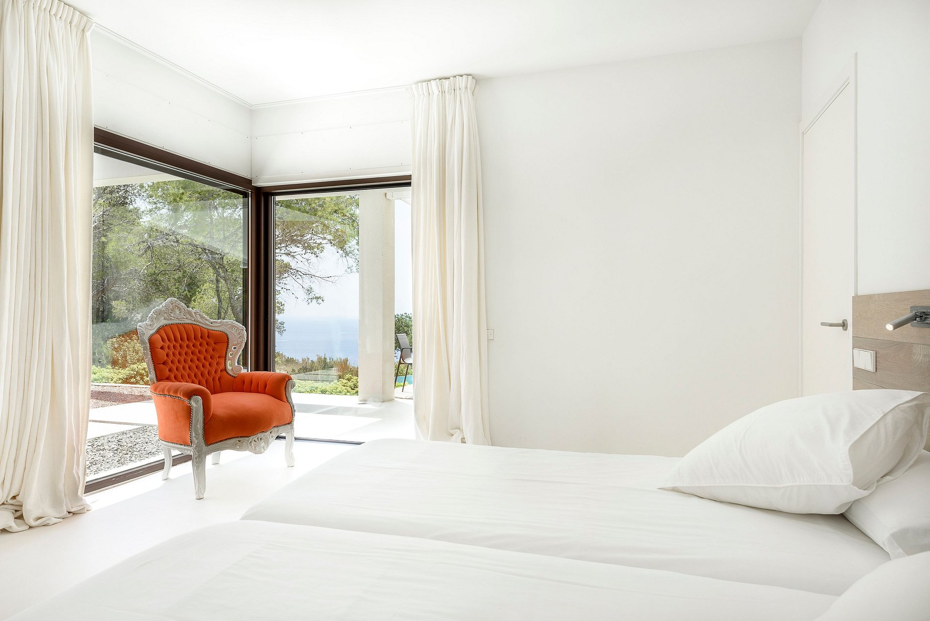 As linhas geométricas e os cubos coloridos da Vila Viola destacam-se entre a vegetação verde. A luz reflete no terraço que parece flutuar sobre a piscina. Com grandes janelas, a luz natural entra pela sacada e em todos os lados da sala de estar. A decoração minimalista branca cria um ambiente zen com velas espalhadas pela decoração. Nos quartos, você encontrará a mesma decoração clean com um toque adicionado pelo fúcsia barroco e poltronas laranja brilhante.