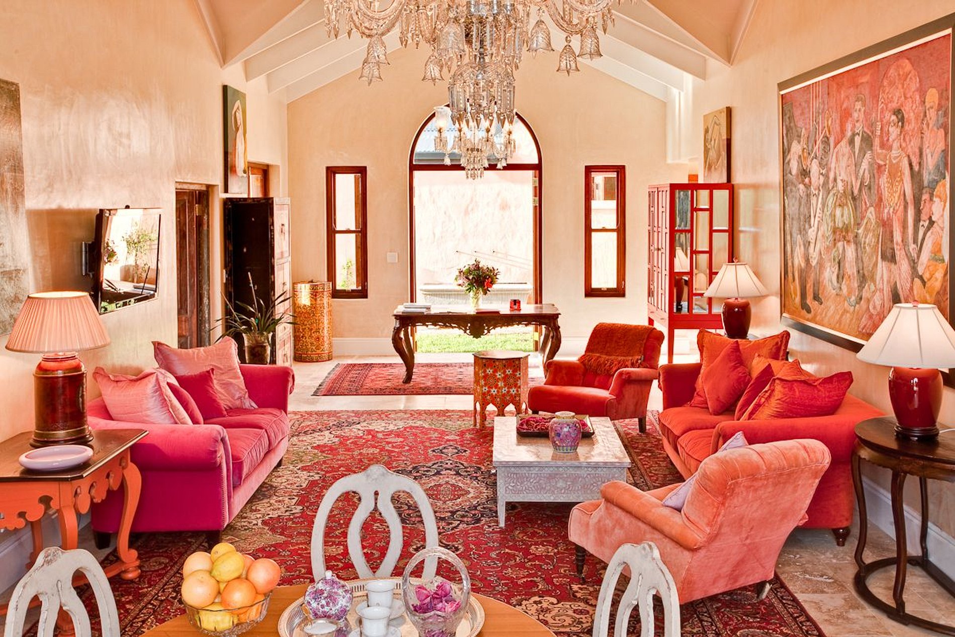 Brilhantes lustres indianos pendem do teto abobadado, obras de arte originais e grandes espelhos enfeitam as paredes, enquanto os móveis de Liz Biden são macios, coloridos e elegantes. Antiguidades elegantes e flores requintadas criam uma sensação de refinamento e sofisticação.