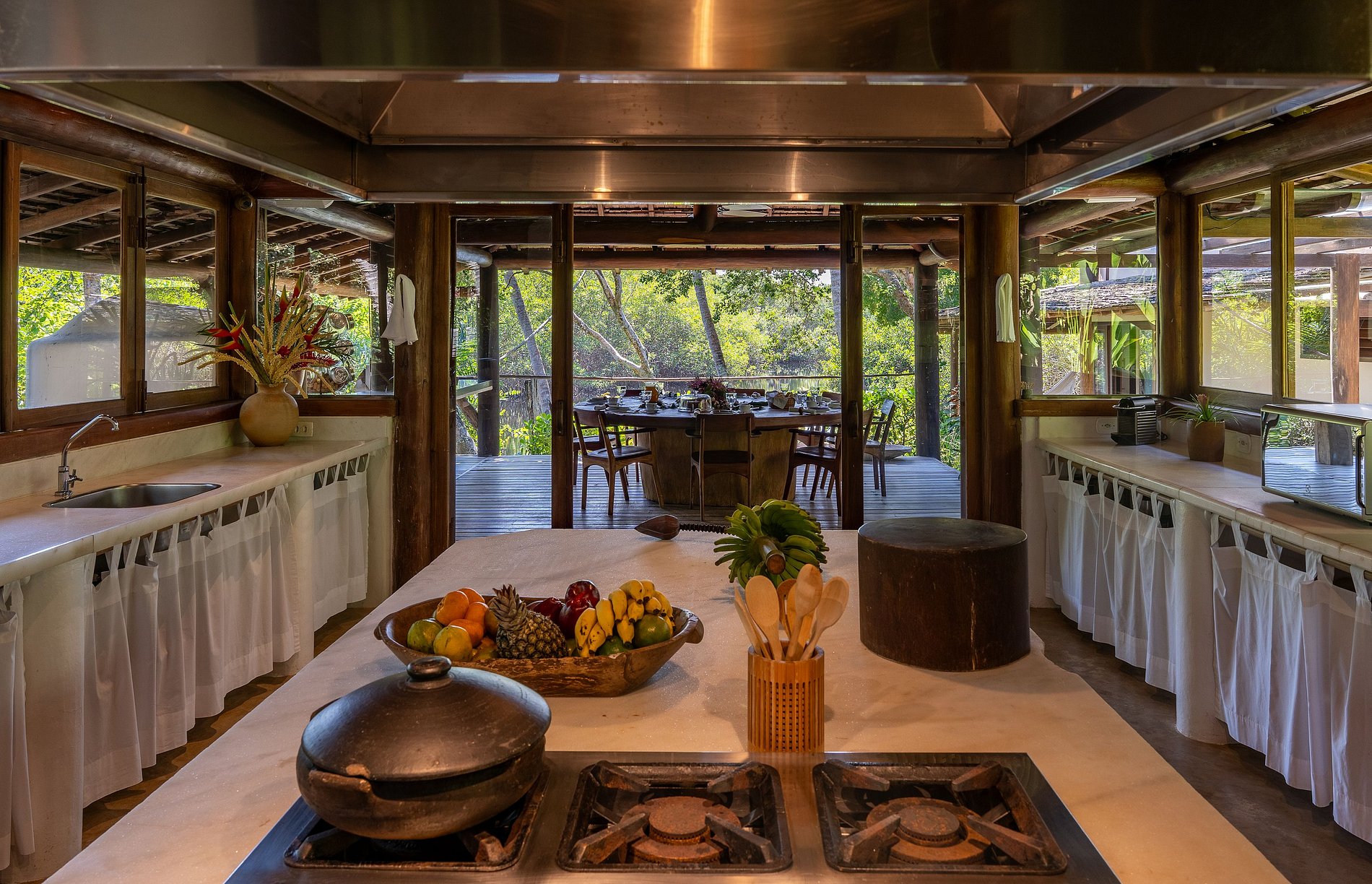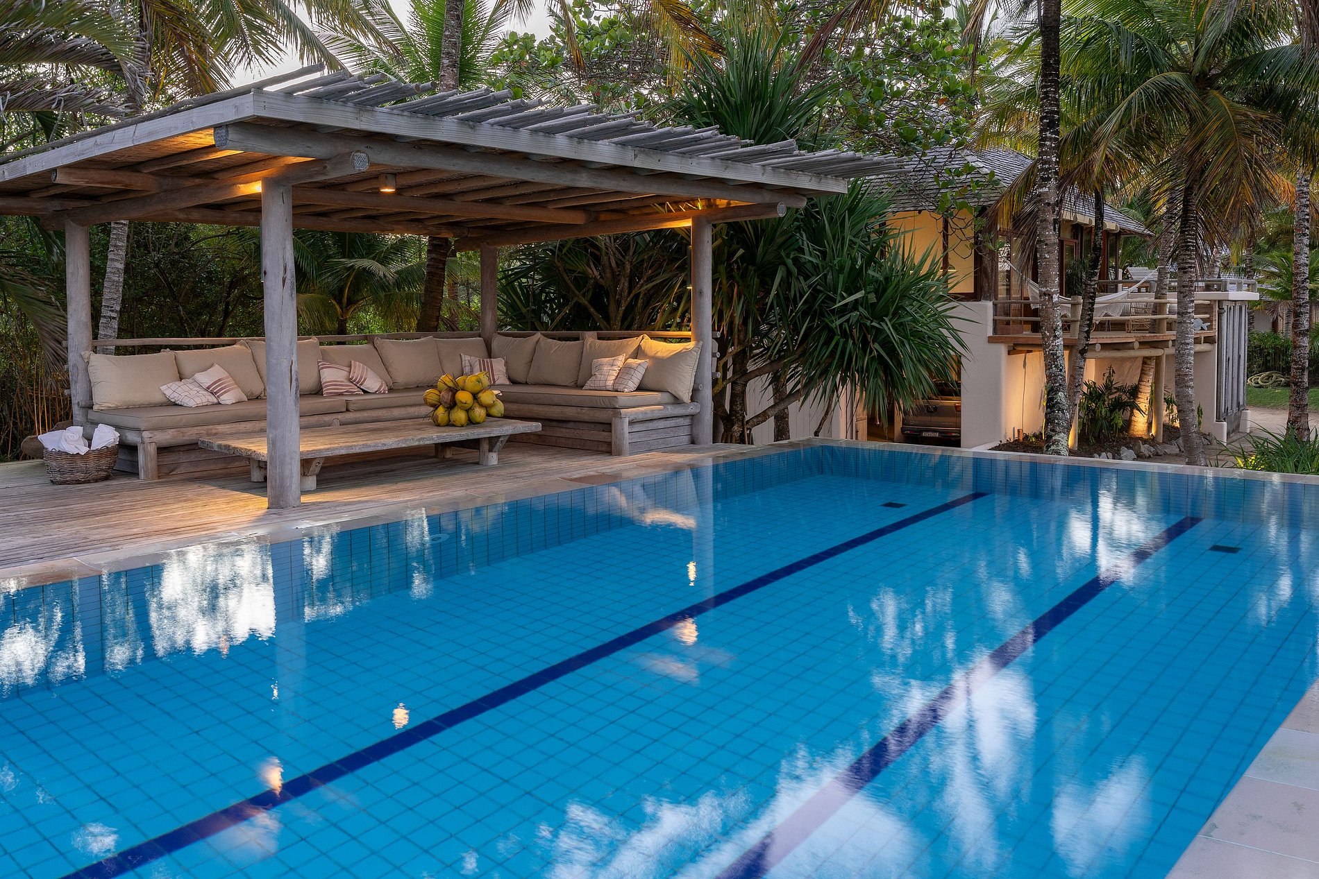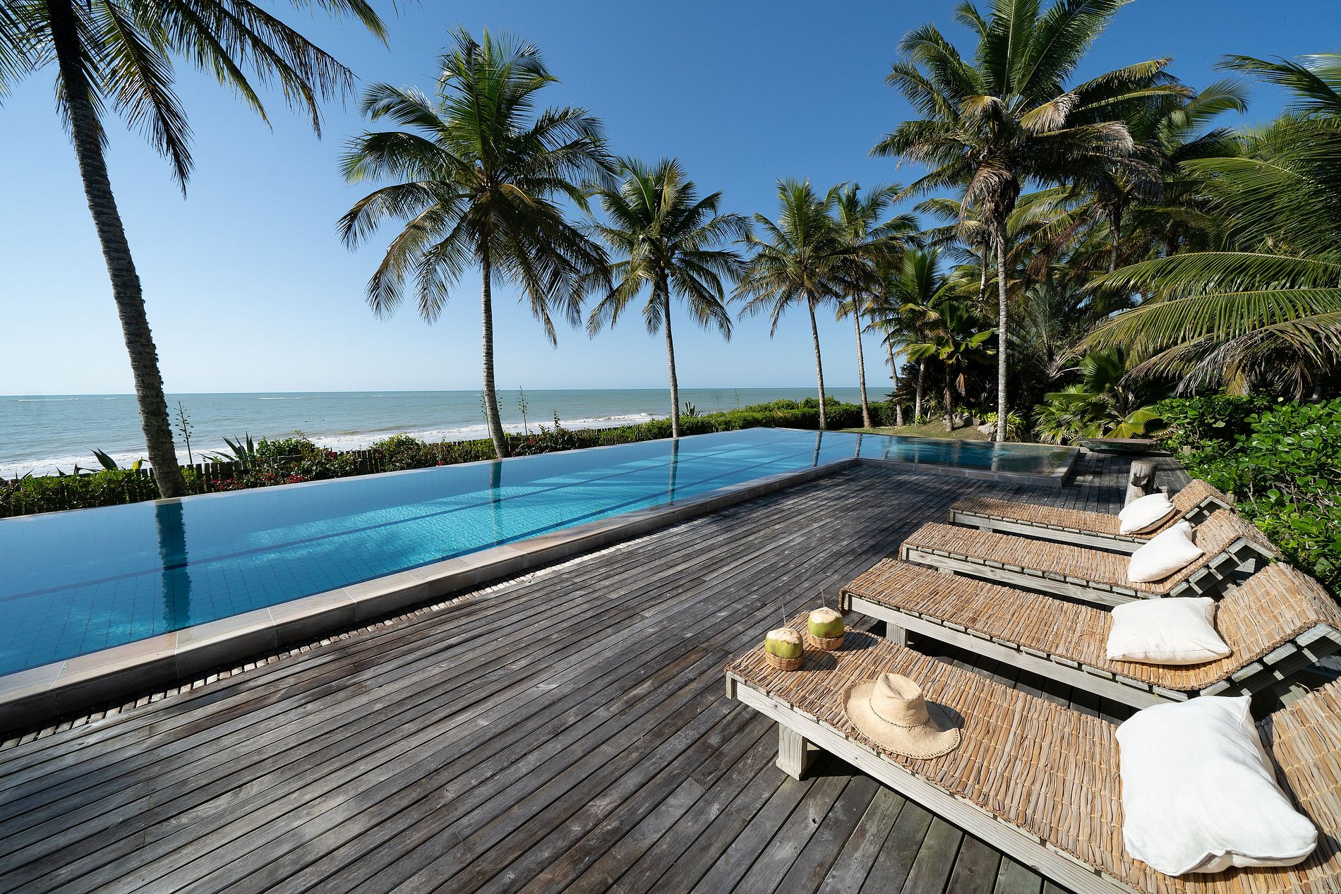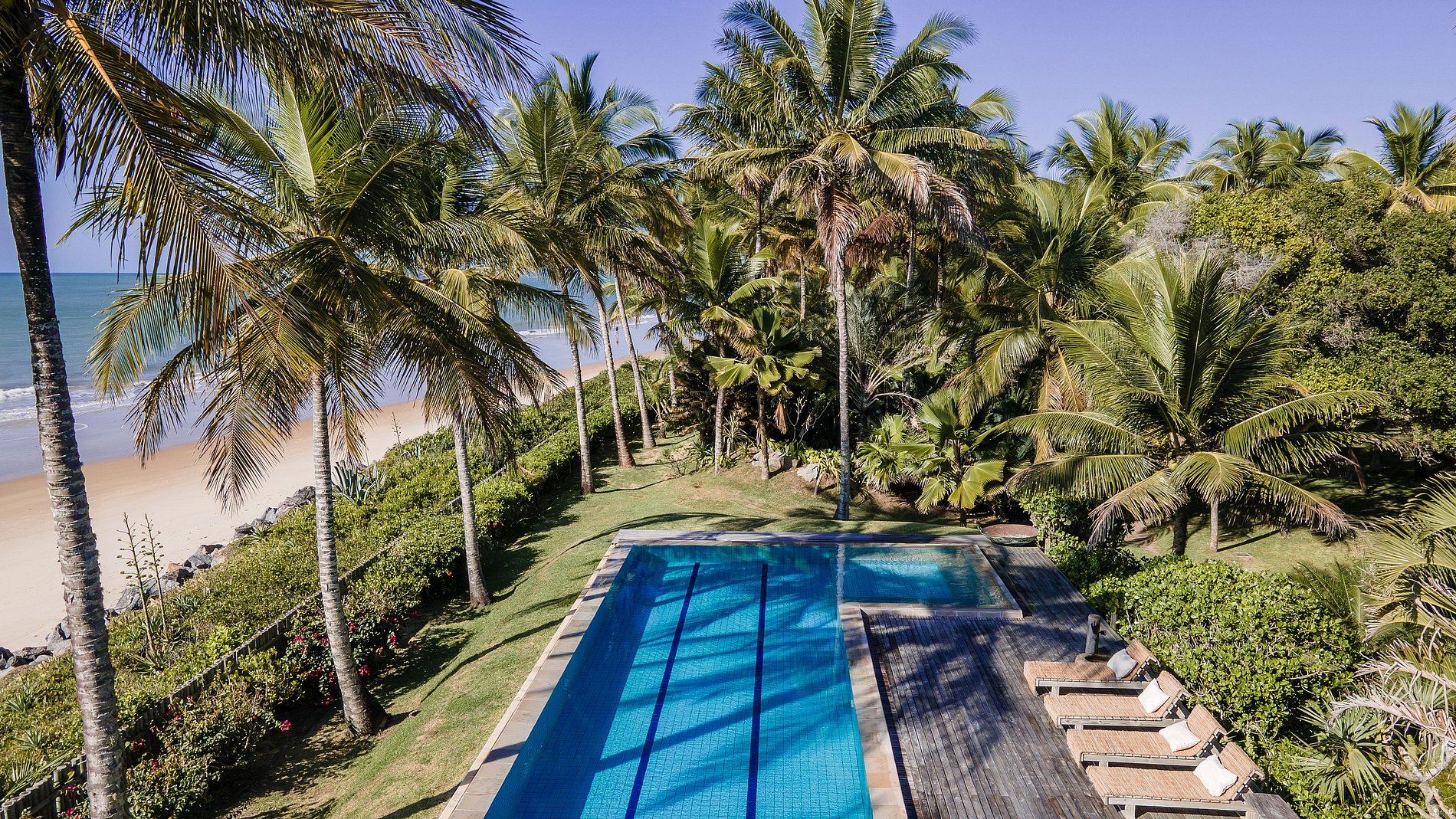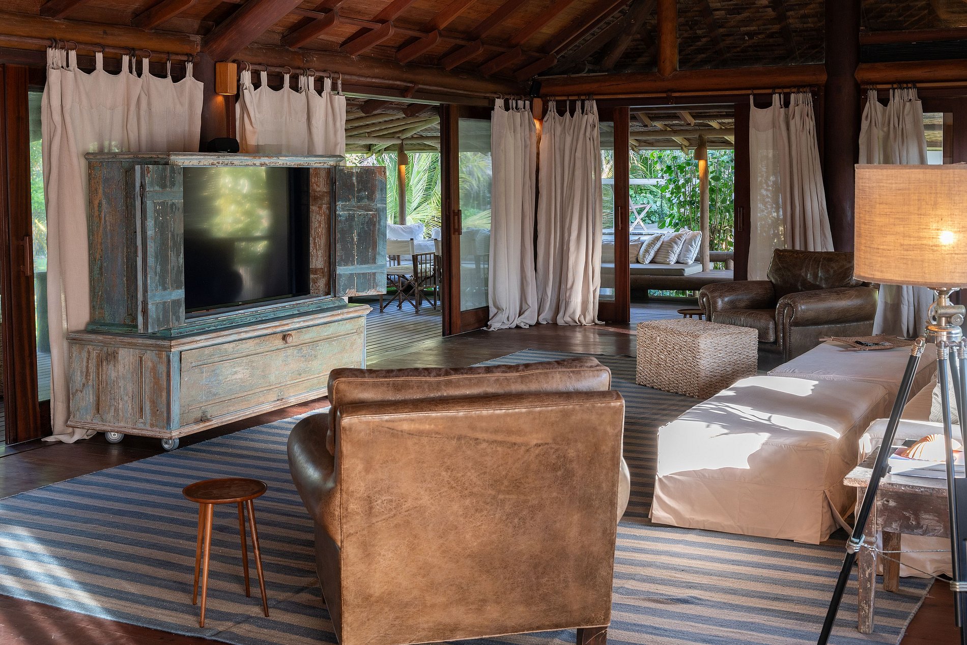 SUÍTE 1 - MASTER com vista para a lagoa, cama king size, mosquiteiro, sala íntima e deck com vista mar, banheiro amplo, closet, secador de cabelo, AC, TV 60”, frigobar, cofre;