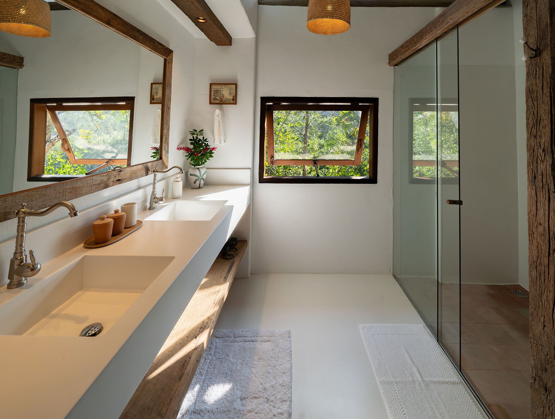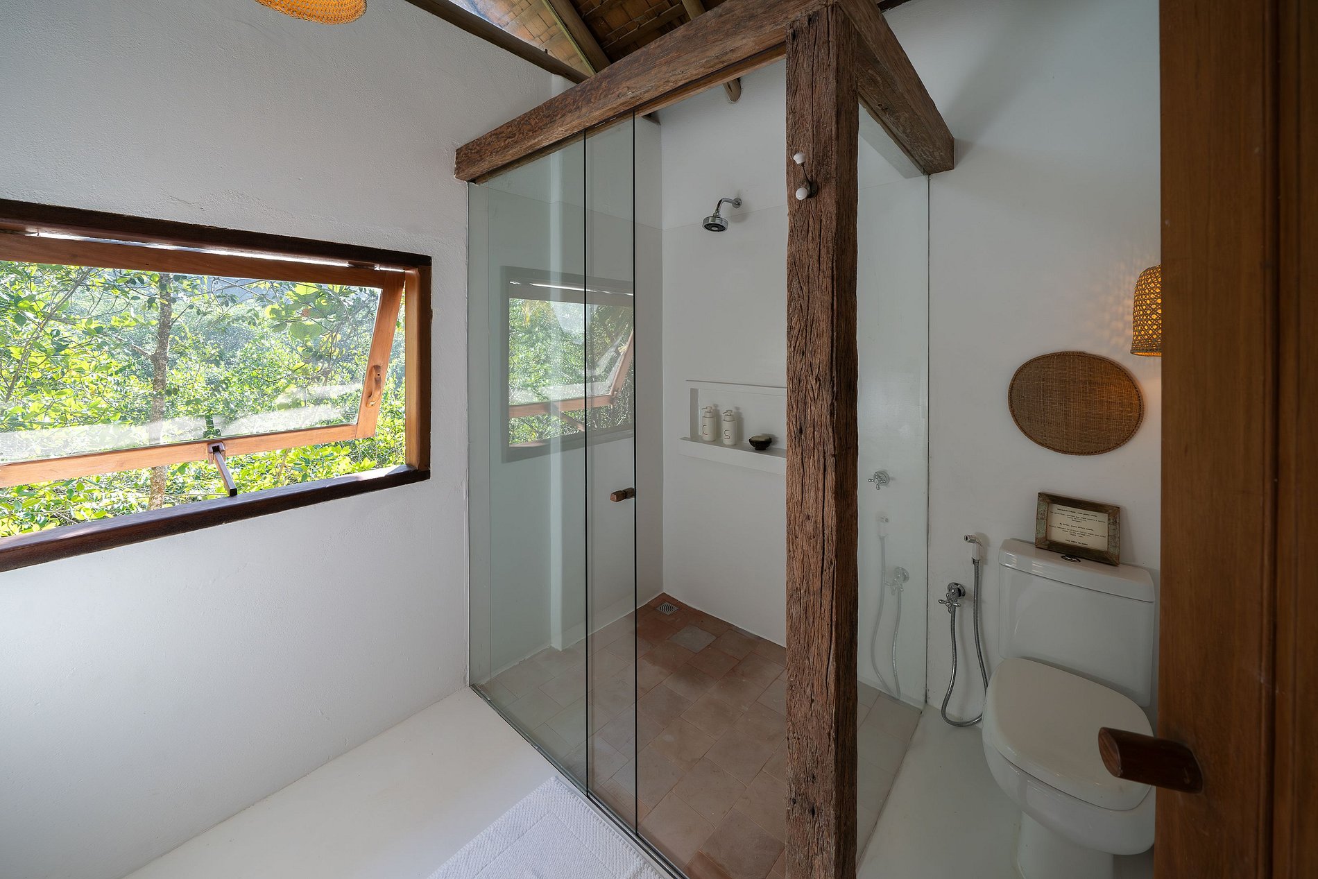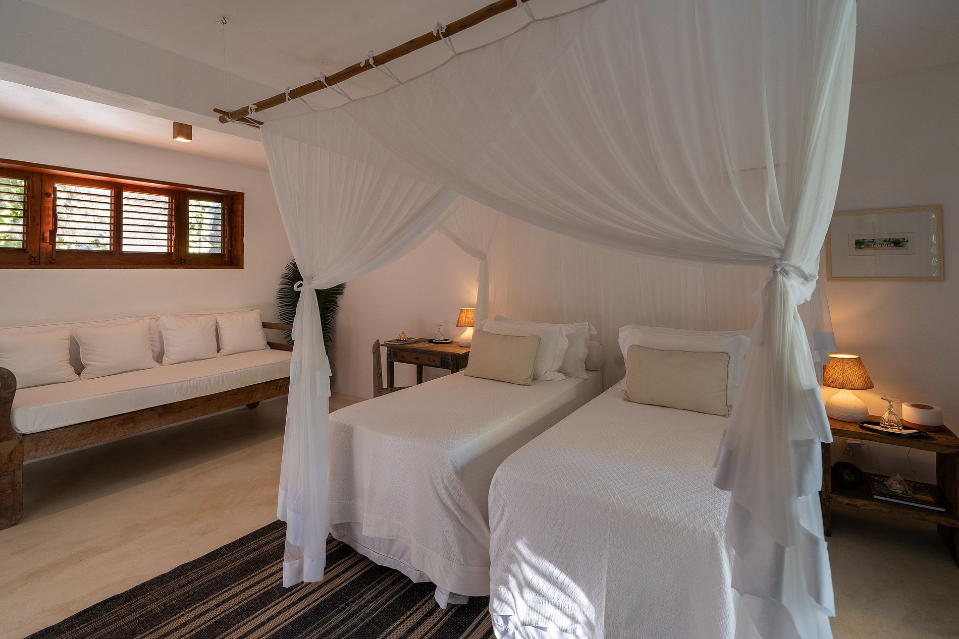 SUITE 3 - JARDIM TÉRREO com vista jardim, 2 camas de solteiro ou 1 cama casal ( camas de solteiro juntas com Pillow top), mosquiteiro, varanda, closet, banheiro, secador de cabelo, AC, TV 50”, cofre;