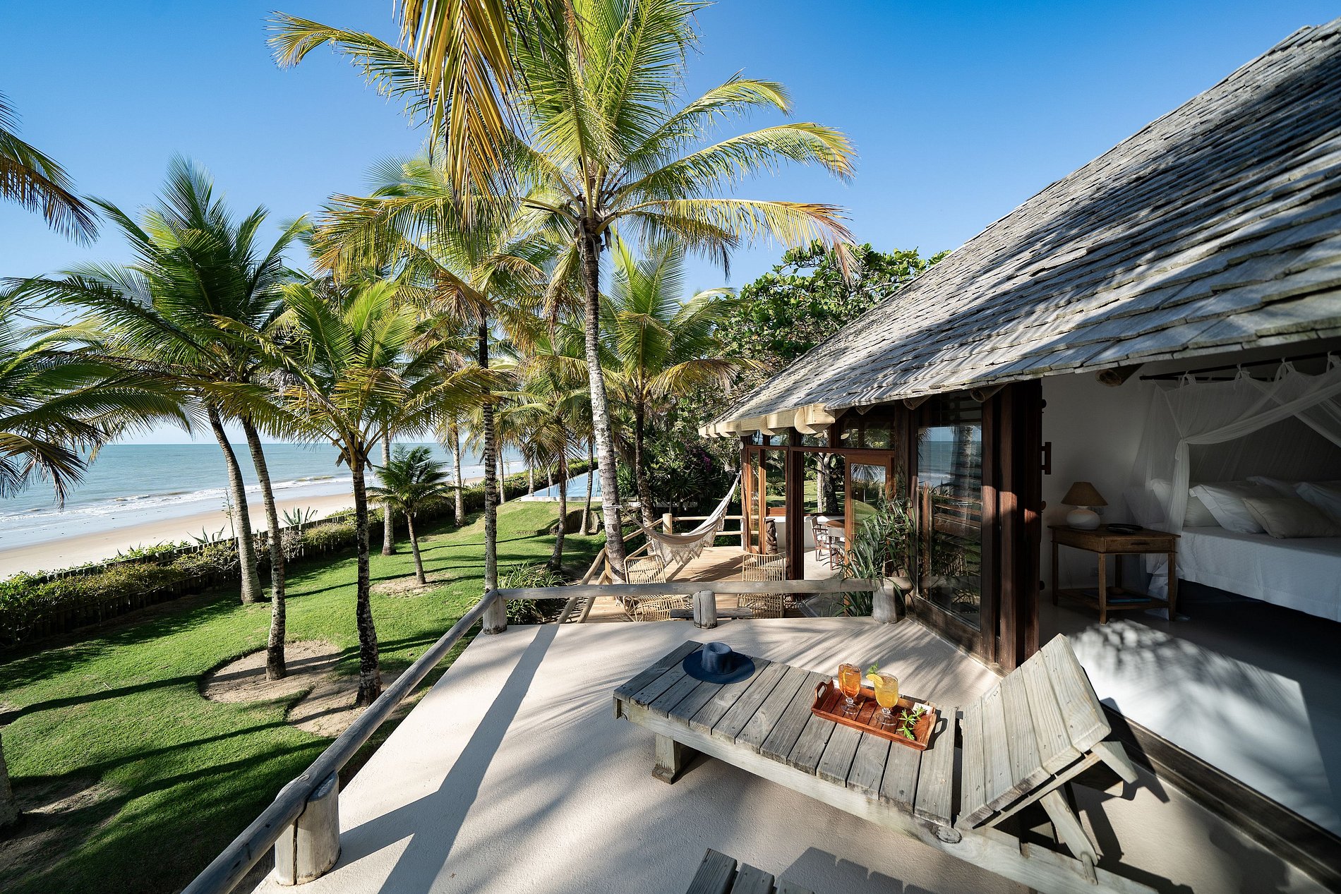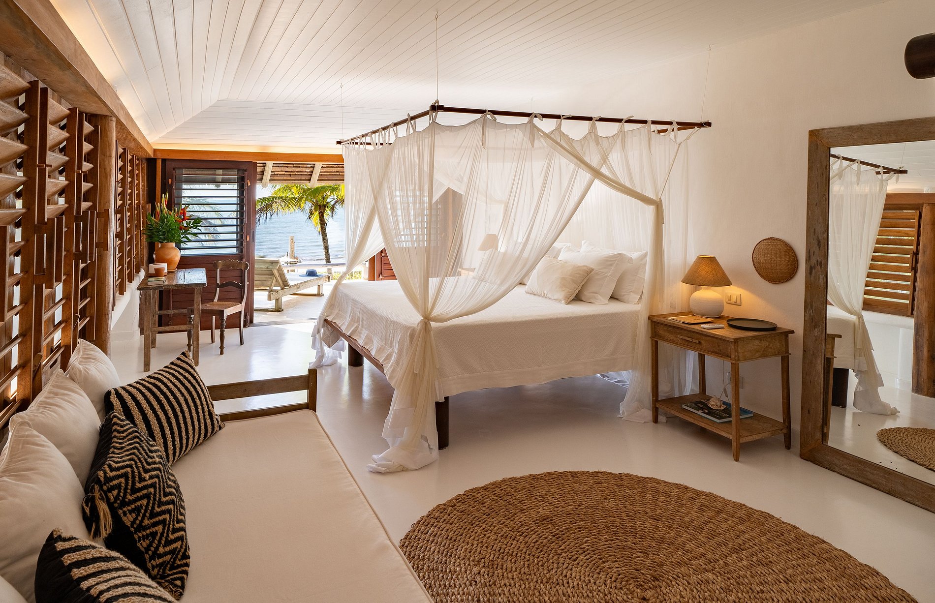 SUÍTE 5 - PRAIA com vista mar, cama king size, mosquiteiro, banheiro amplo, varanda, armário com cabideiro, secador de cabelo, AC, cofre;