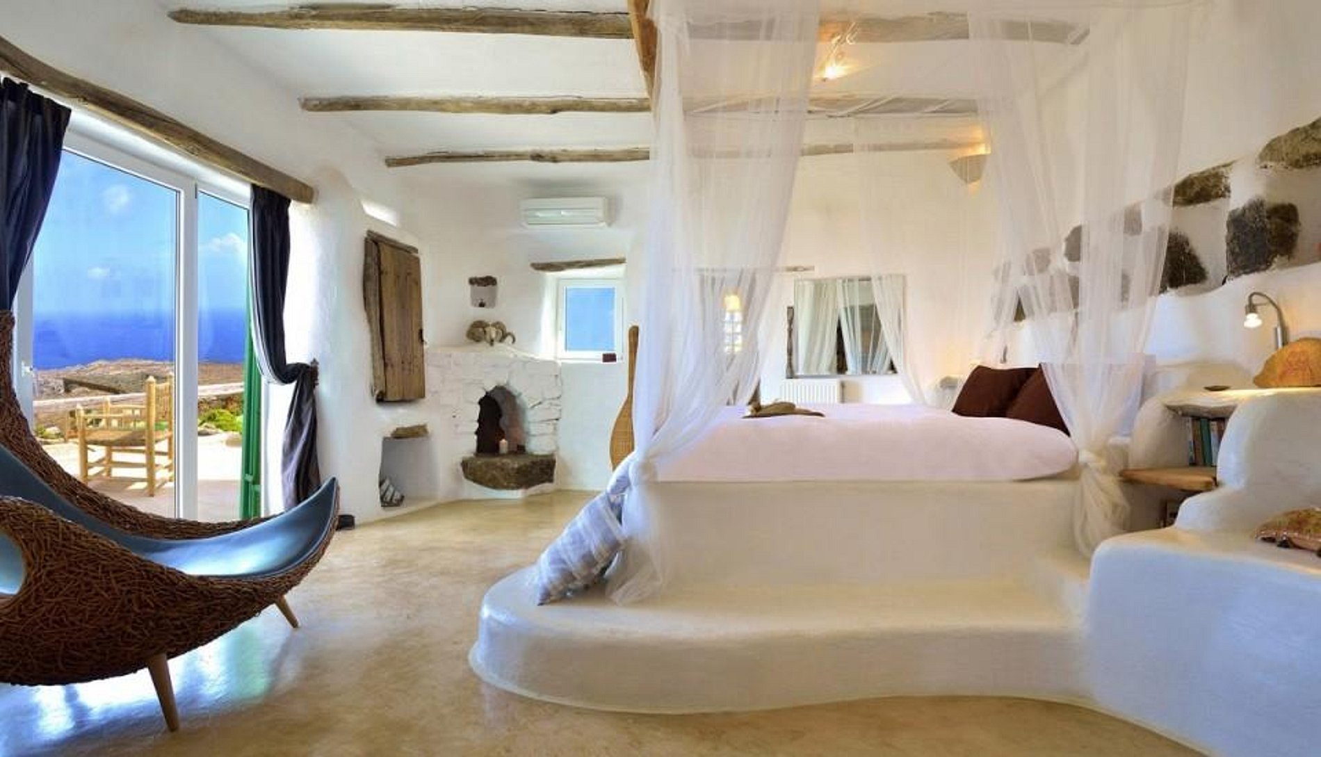Cada um dos três quartos principais da villa tem uma varanda ou terraço privado com vistas deslumbrantes, bem como uma lareira. O quarto principal no piso superior contém uma cama king size e área de vestir, e seu banheiro tem um teto de cúpula com pequenas clarabóias coloridas. O efeito é espetacular. O segundo quarto principal é no nível mais baixo e apresenta uma cama king size, área de vestir e banheiro. O quarto no terceiro nível superior hospeda uma cama queen size e banheiro. O quarto quarto, uma suíte com cama queen size se encontra na casa de hóspedes. Há ainda uma quinta suíte em construção.