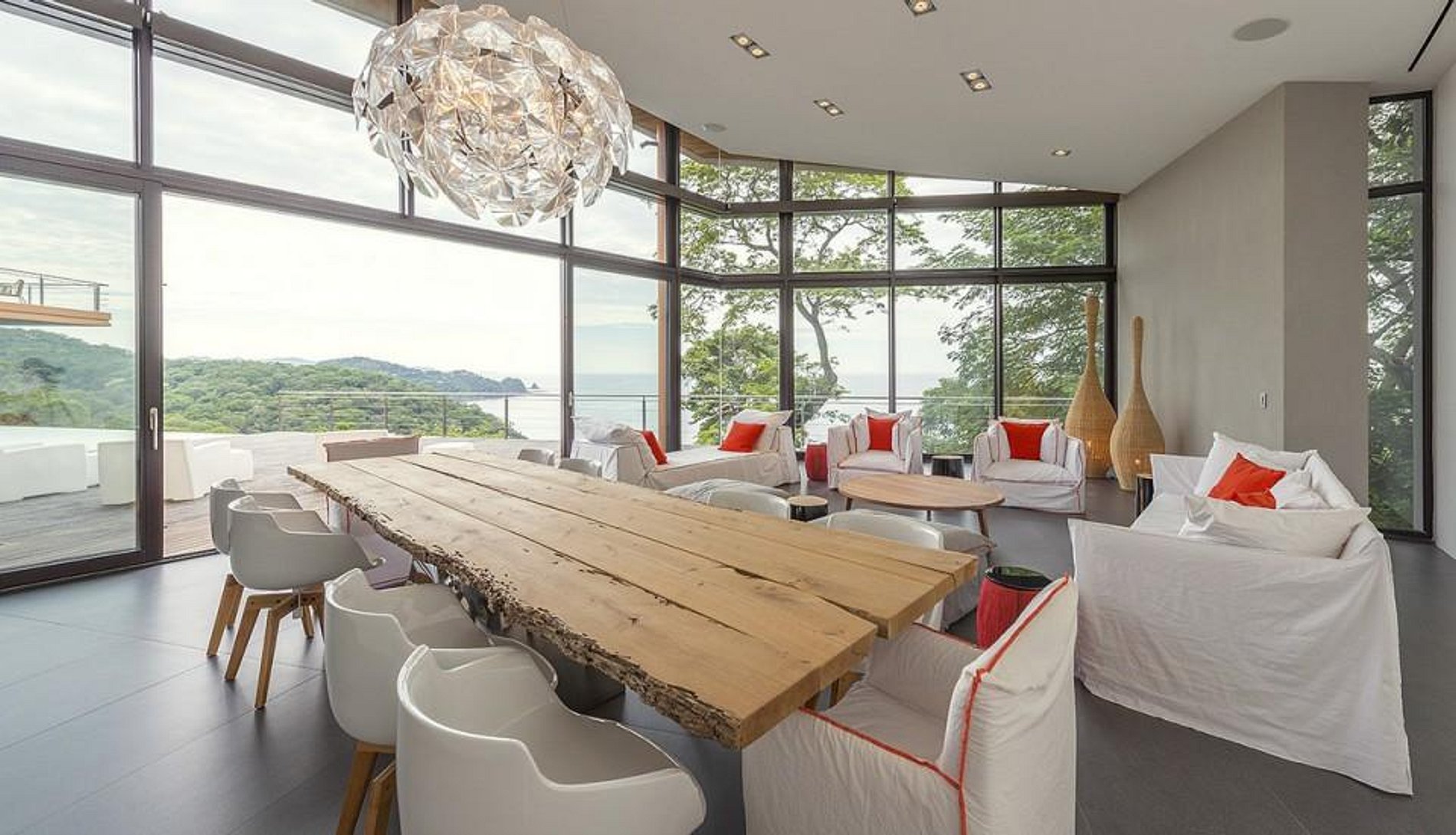 Com design contemporâneo, Cielomar permite maravilhosa vista para o mar. Pisos de madeira escura e tetos altos complementam as grandes janelas abertas e portas de vidro deslizantes. Ângulos retos são uma exceção e a casa é única com a maioria de suas paredes curvas.