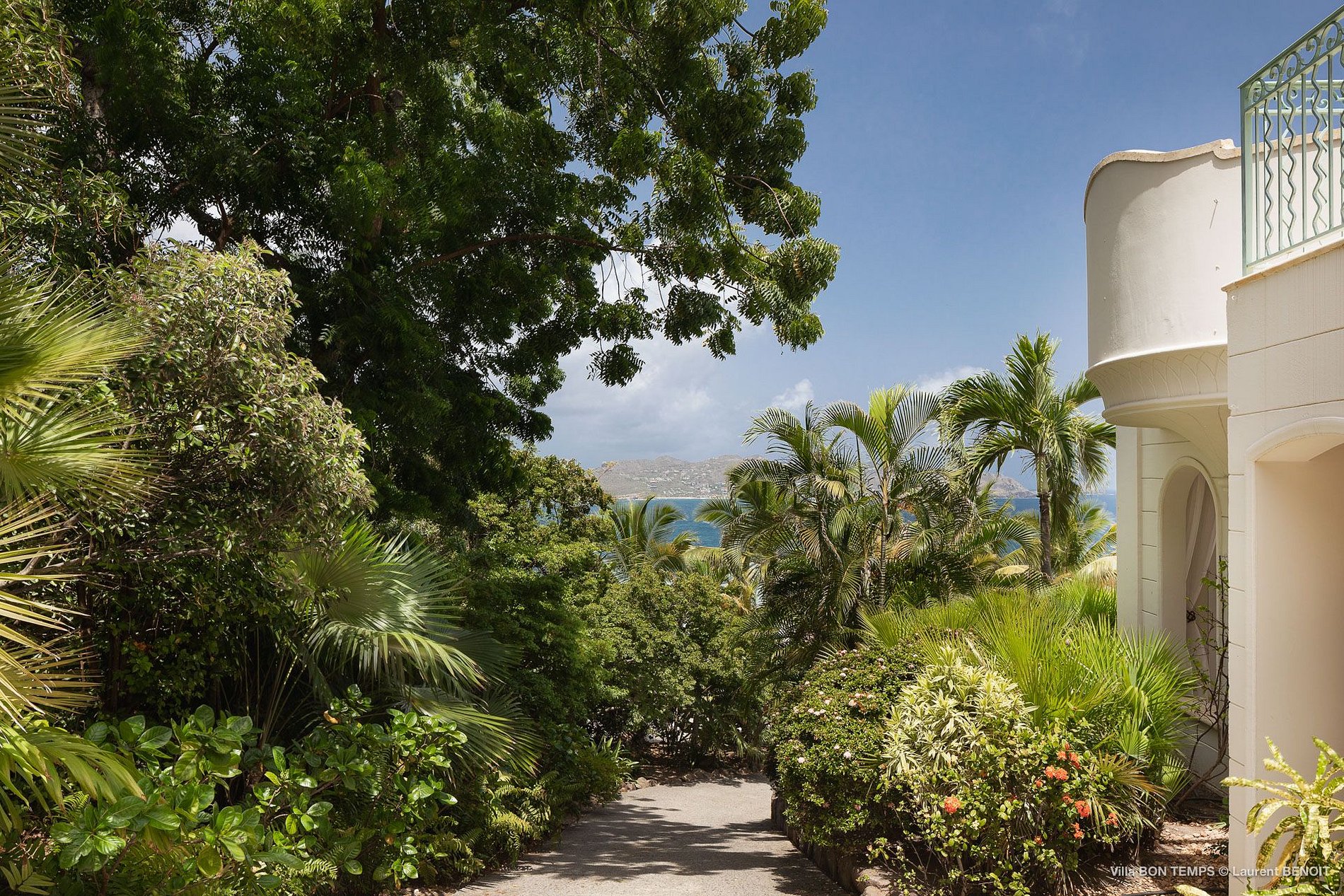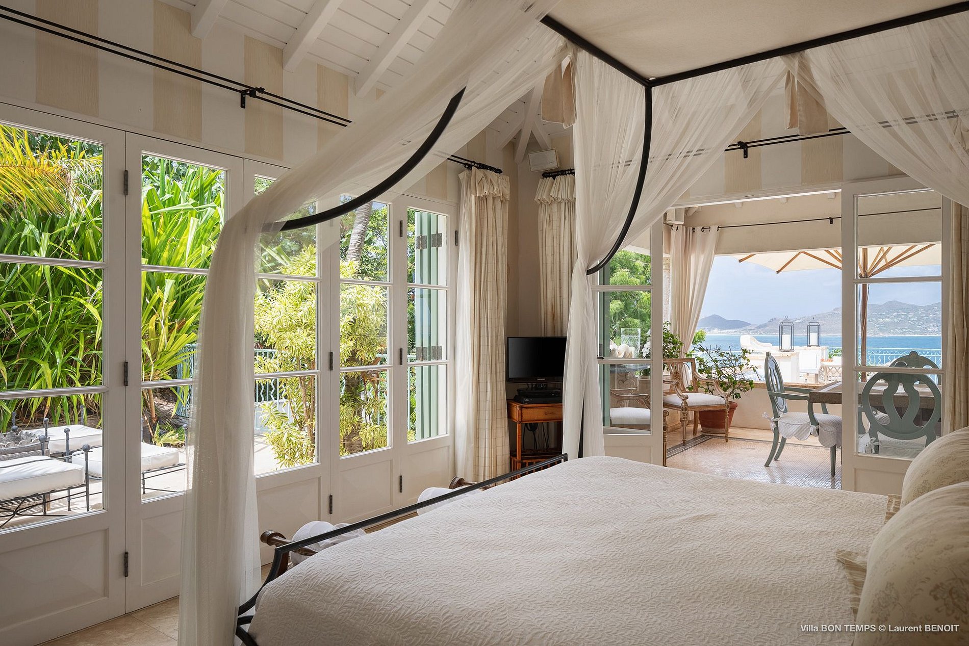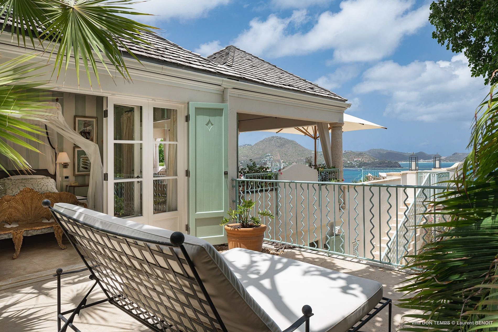 Villa Bon Temps é decorada em suaves tons naturais de azul e verde contra um fundo de creme e off-white. O piso de mosaico feito sob encomenda, os detalhes pintados à mão da telha e uma coluna de pedra que oferece sombra contra o sol dão a excepcional sensação mediterrânea a essa casa. Os seis quartos da villa são igualmente bem equipados, com tetos altos, banheiros em azulejos de travertino e vista para o mar. Quatro dos quartos estão no mesmo nível que a casa principal, enquanto os outros dois estão em um nível mais baixo e oferecem varandas cobertas privadas.