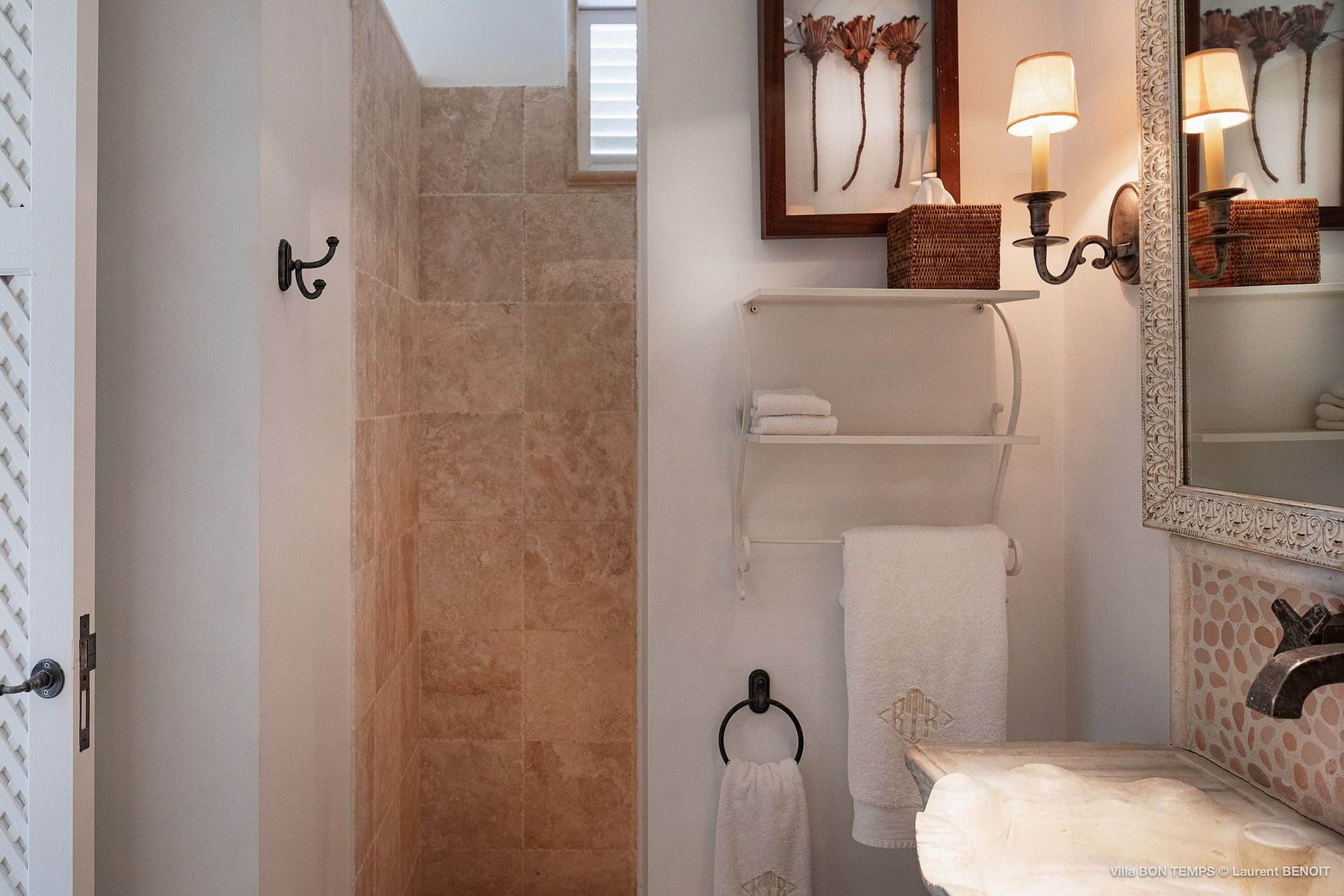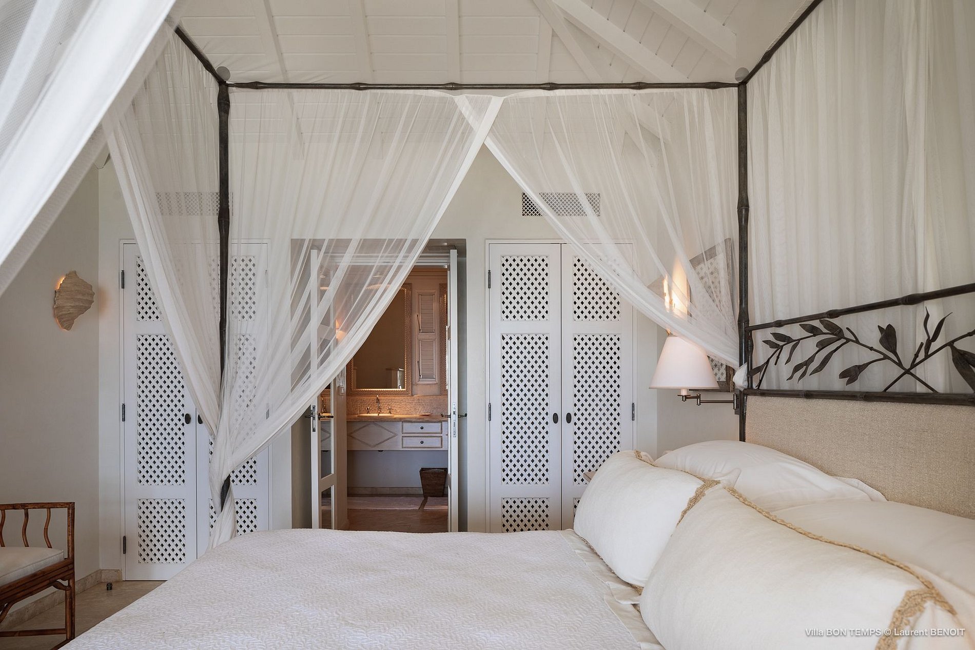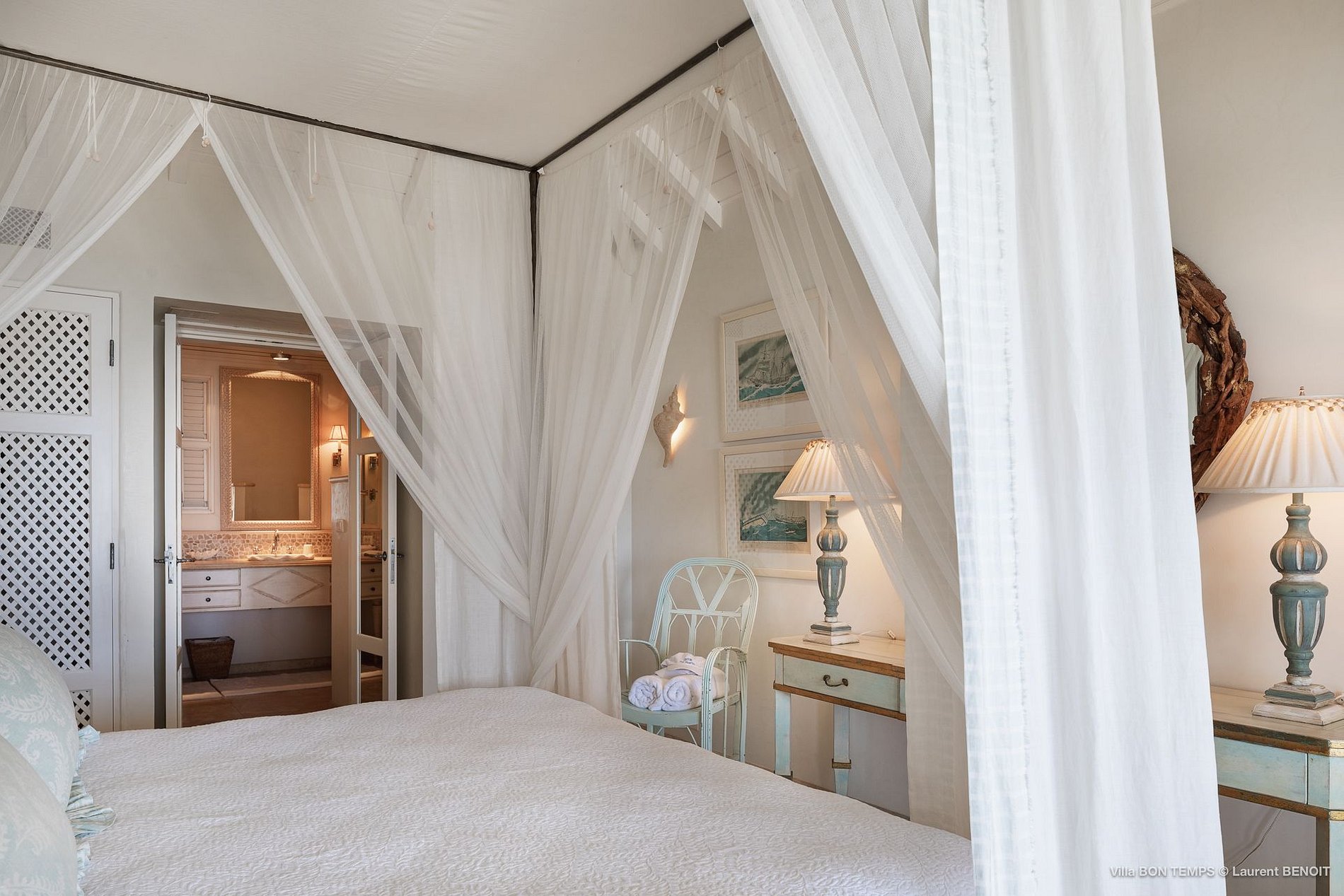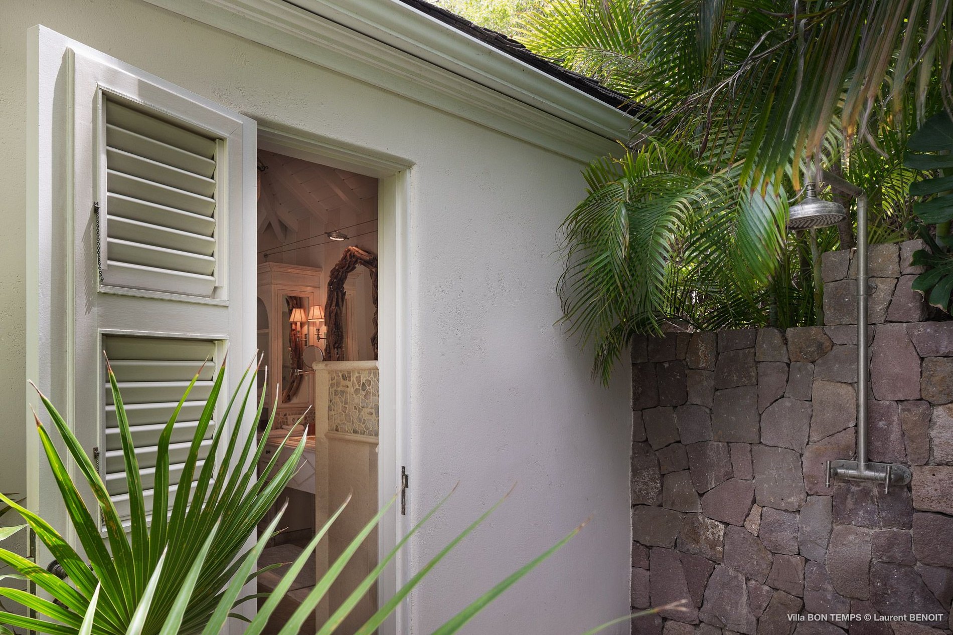 Villa Bon Temps é decorada em suaves tons naturais de azul e verde contra um fundo de creme e off-white. O piso de mosaico feito sob encomenda, os detalhes pintados à mão da telha e uma coluna de pedra que oferece sombra contra o sol dão a excepcional sensação mediterrânea a essa casa. Os seis quartos da villa são igualmente bem equipados, com tetos altos, banheiros em azulejos de travertino e vista para o mar. Quatro dos quartos estão no mesmo nível que a casa principal, enquanto os outros dois estão em um nível mais baixo e oferecem varandas cobertas privadas.