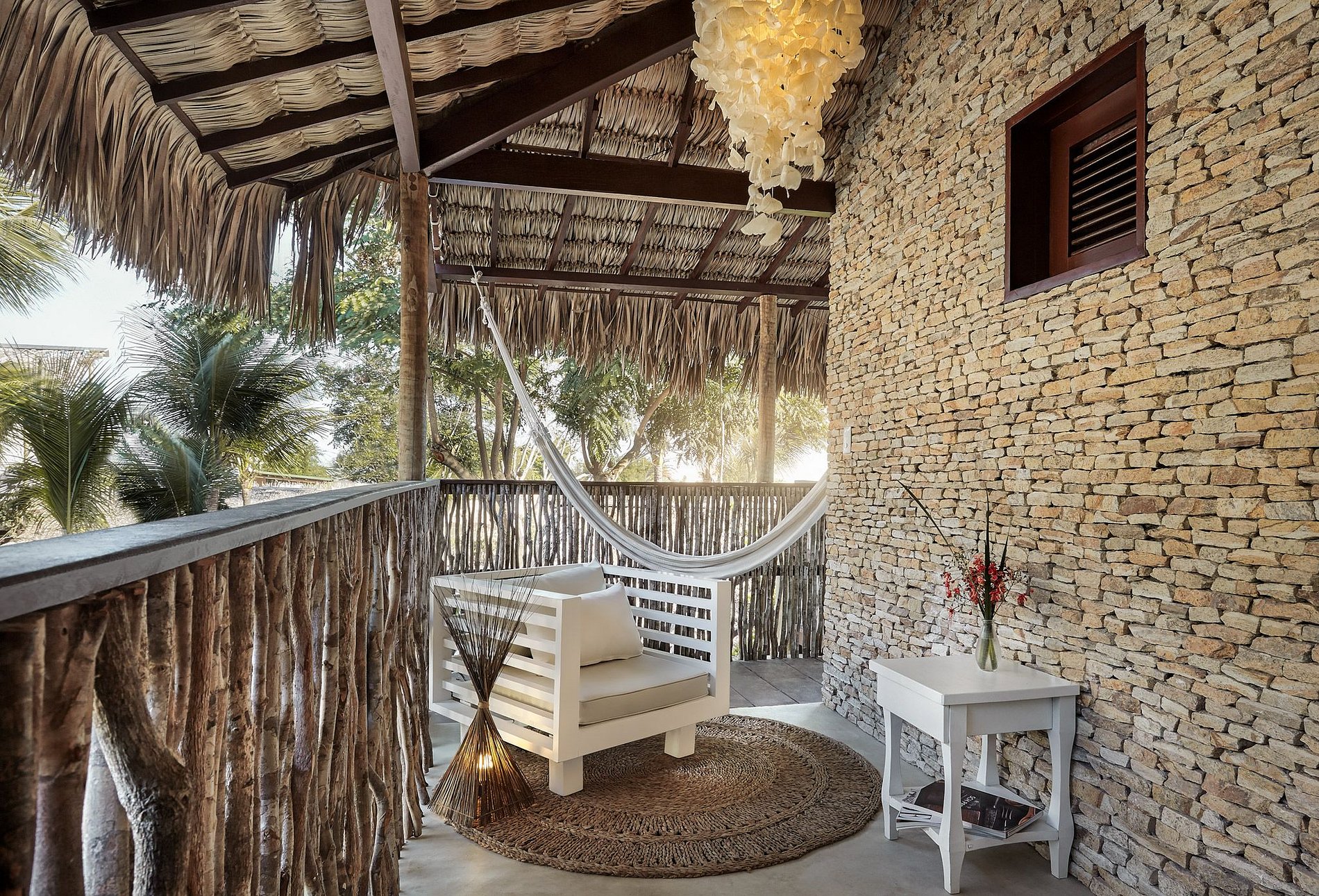 Idealizada por um arquiteto brasileiro, os espaços amplos são naturalmente paradisíacos, com areia, flores, coqueiros, madeira e palha. Conforto que emerge dos seus quartos trabalhados, de  sua grande piscina e bar.