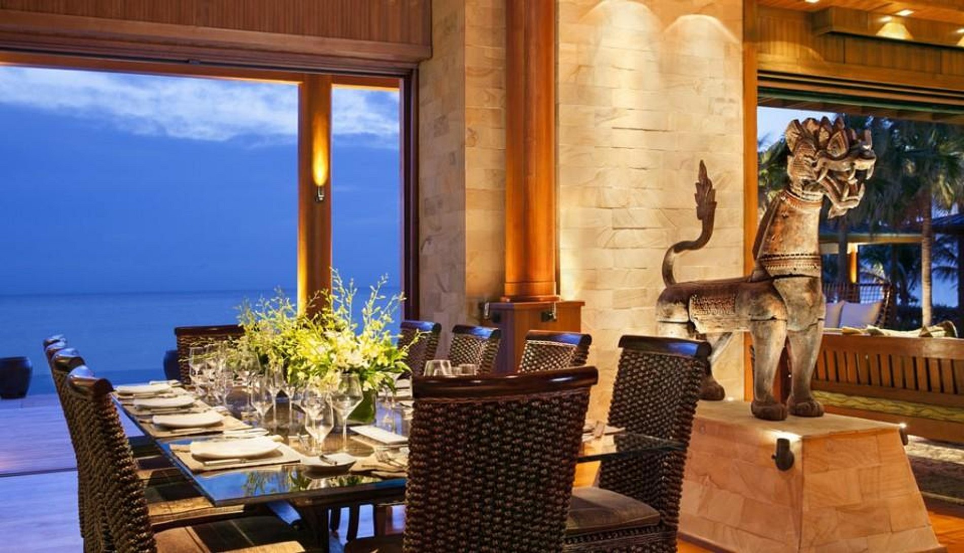 Um sistema de iluminação profissionalmente projetado foi instalado para enfatizar os muitos traços especiais da propriedade. O edifício principal é onde você vai encontrar os principais espaços de socialização, incluindo salas de estar, sala de jantar, cozinha, bar e uma adega de vidro fechada. Este luxuoso e extremamente privado complexo possui funcionários para até dez membros da família ou amigos. Nandana Private Resort vai além das férias tradicionais, oferecendo aos hóspedes uma vasta gama de serviços de resort de luxo, amenidades e atividades. Estes incluem cozinha gourmet, massagista no local, piscina infinita, jacuzzi, jet skis, ATV's, campo de golfe de 18 buracos, vôlei de praia e muito mais. A propriedade está situada em uma comunidade fechada com segurança 24/7; Além da própria propriedade possuir um sistema de alarme. Os edifícios localizados dentro do complexo Villa Nandana ficam em torno de uma piscina de borda infinita com cachoeira cujas águas caem em uma praia de areia privada. Uma grande jacuzzi exterior está localizada com vista para a praia e todo o composto é rodeado por mais de 300 palmeiras importadas e plantas tropicais. A propriedade é localizada entre o oceano com uma praia de areia protegida e um canal de águas profundas com instalações privadas de ancoragem para iates até 115 metros de comprimento. Coquetéis à beira da piscina ao pôr do sol ou um jantar à beira-mar para dois sob um dossel de estrelas são a maneira perfeita para completar qualquer dia. Juntas, as quatro suítes de quarto ricamente decorados e a tenda customizada em estilo safari podem acomodar grupos de até dez pessoas com total conforto.