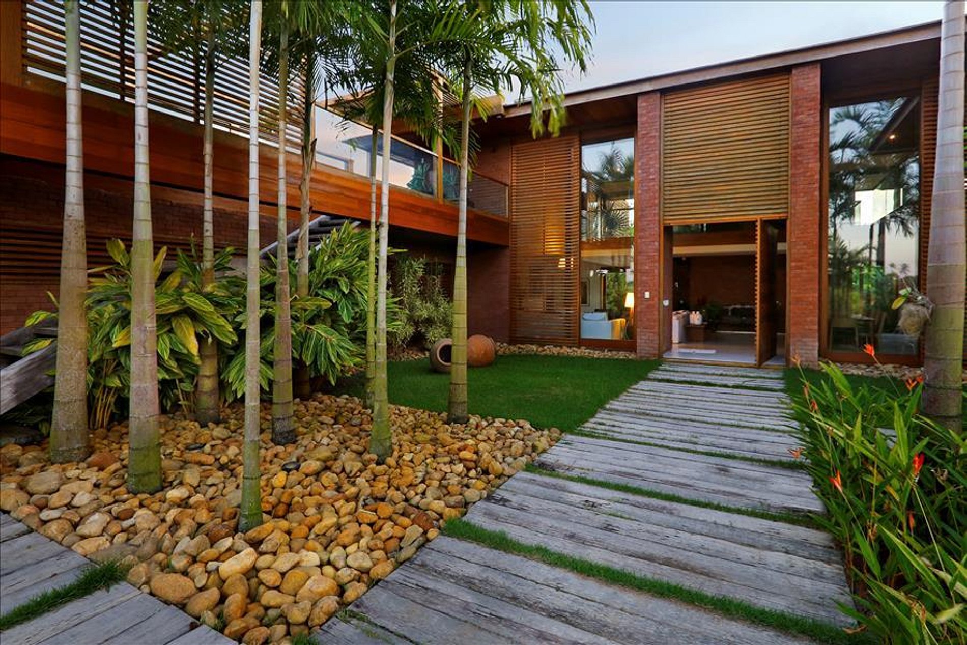 Na entrada, altas palmeiras dão boas vindas aos hóspedes e as áreas externas da casa são um convite para reunir família e amigos e contemplar o incrível céu de Trancoso. A noite é um espetáculo a parte, em que as luzes da piscina criam um visual mágico, ainda mais quando misturadas às luzes da casa.