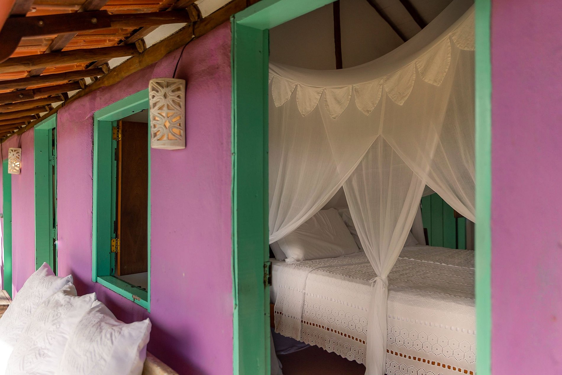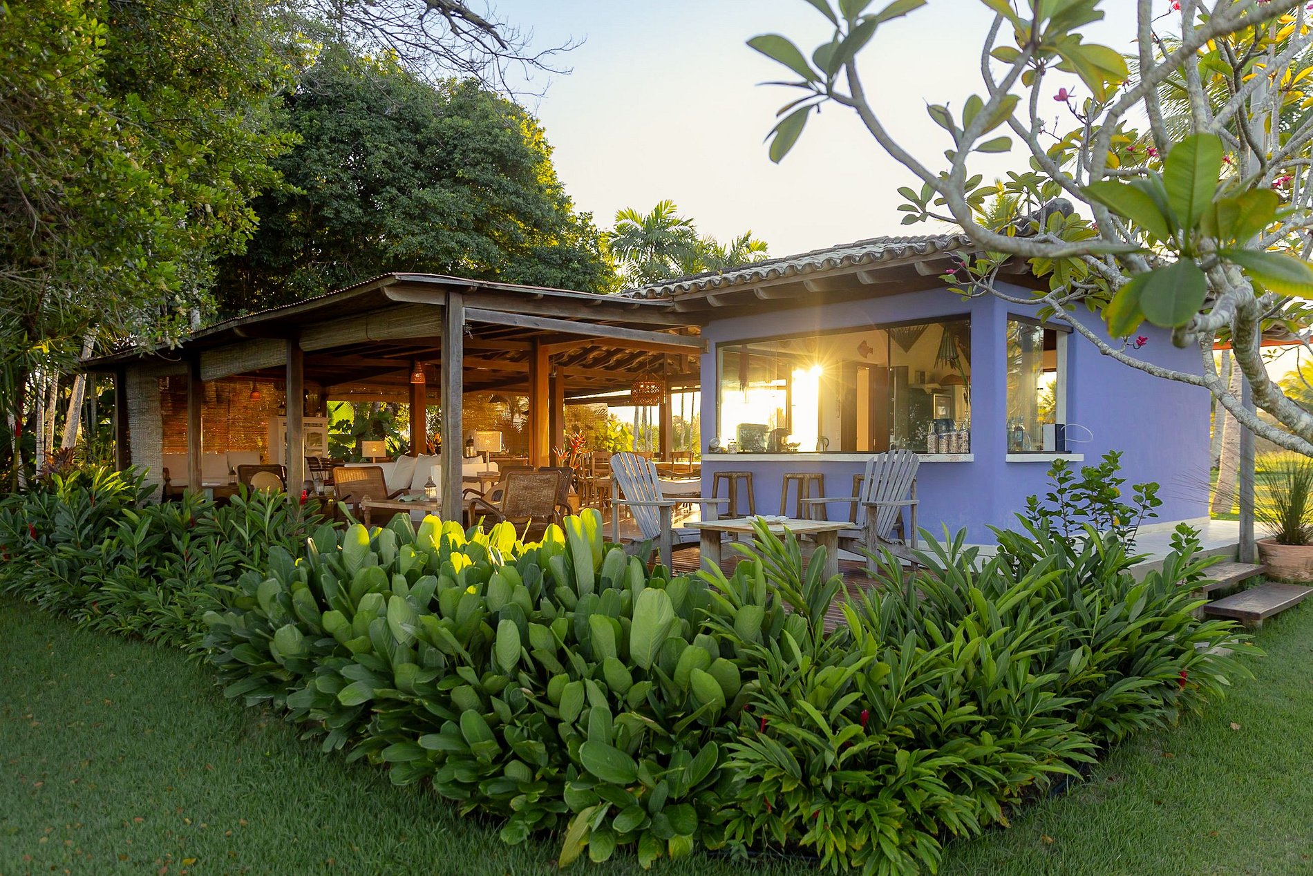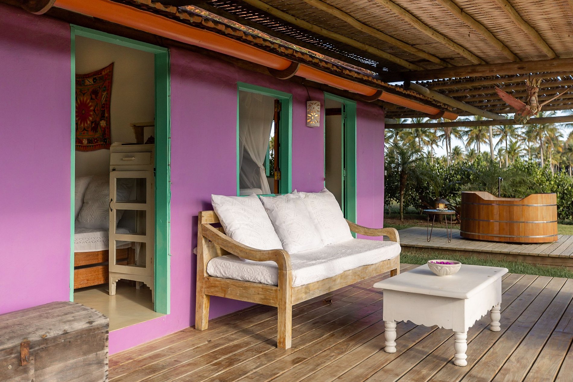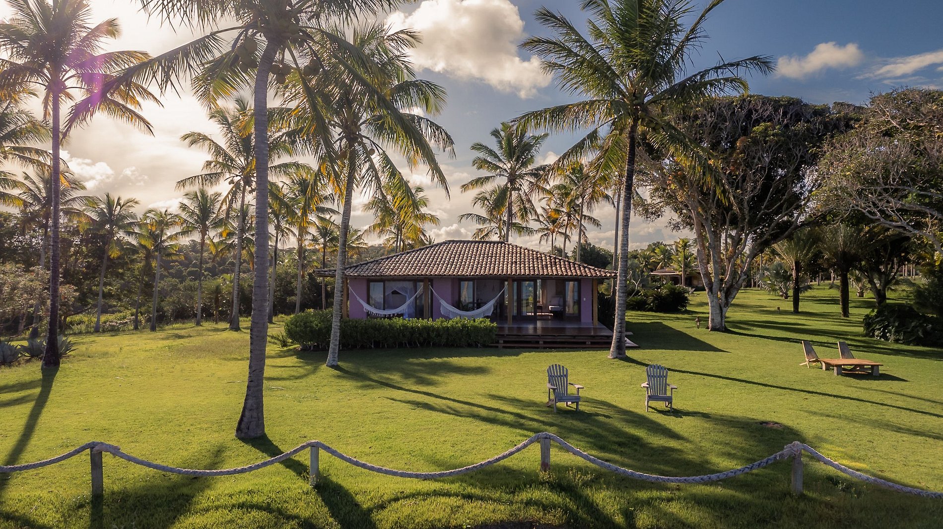 Com apenas quatro bungalows e uma casa rústico-chique a arquitetura é pra lá de elegante, em meio a um jardim de coqueiros e uma vista deslumbrante para o mar, avistando-se a Ponta de Juacema e Corumbau.