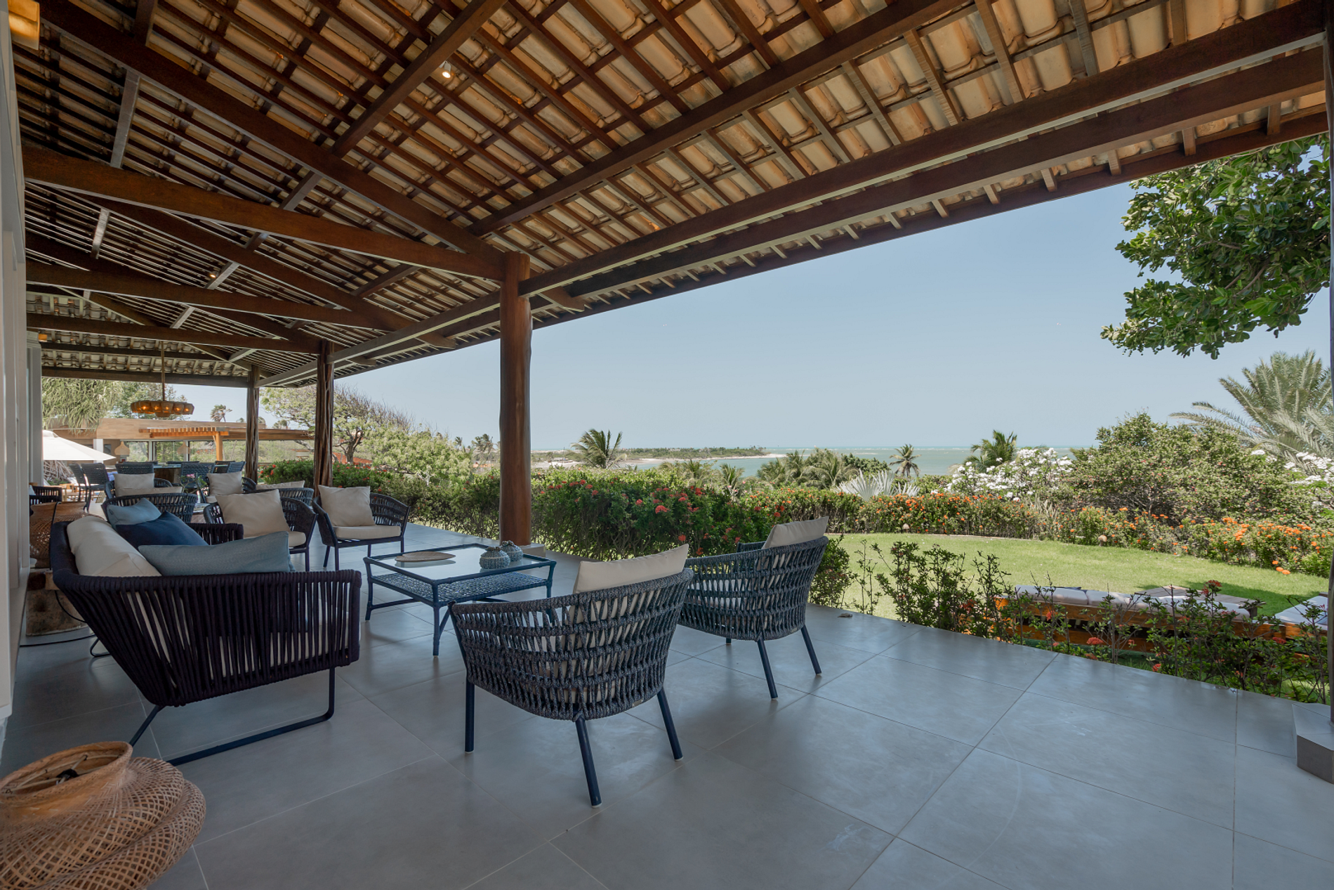 Com uma bela decoração, esta Vila pé na areia possui sete suítes, piscina com vista para o mar, quadra poliesportiva e apoio na areia, com cadeiras e mesas.