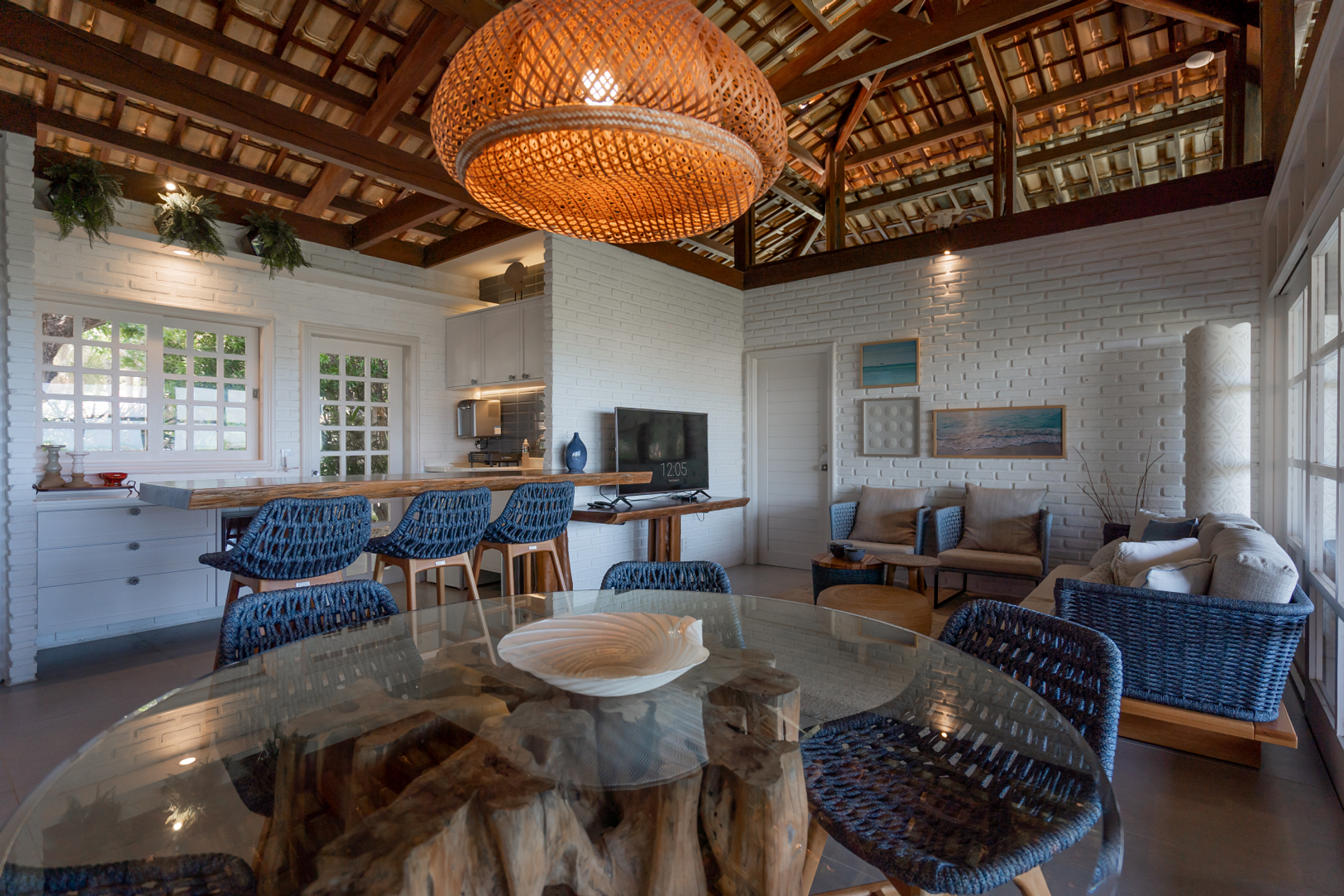 Com uma bela decoração, esta Vila pé na areia possui sete suítes, piscina com vista para o mar, quadra poliesportiva e apoio na areia, com cadeiras e mesas.