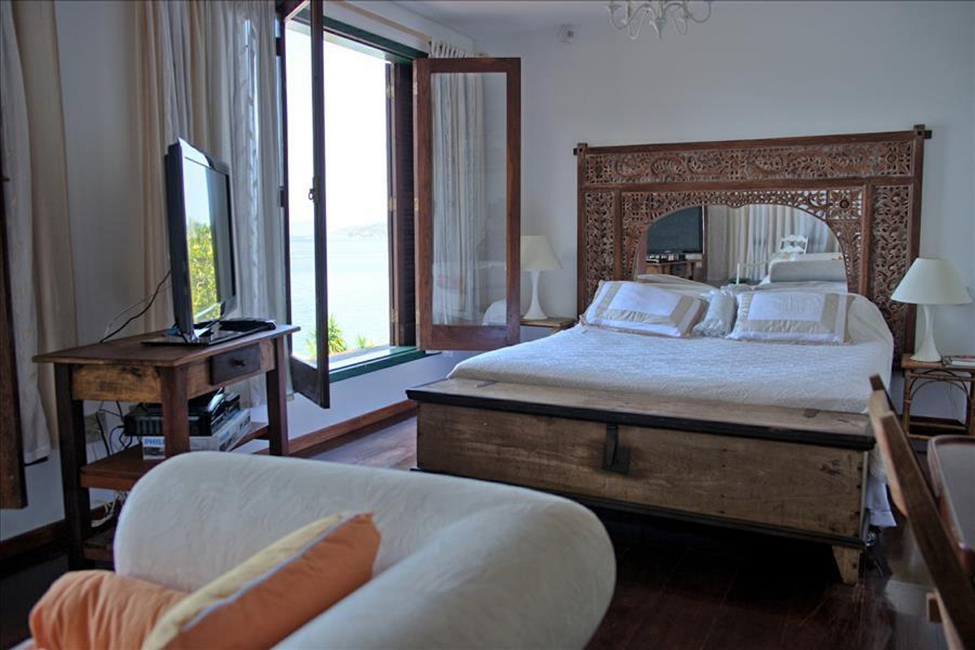 3- Em cima da casa principal, os 2 maiores quartos incluindo a Suíte Master (banheiro com banheira dupla e vista para a floresta e mar) e Suíte Junior (2 camas de casal e banheiro).