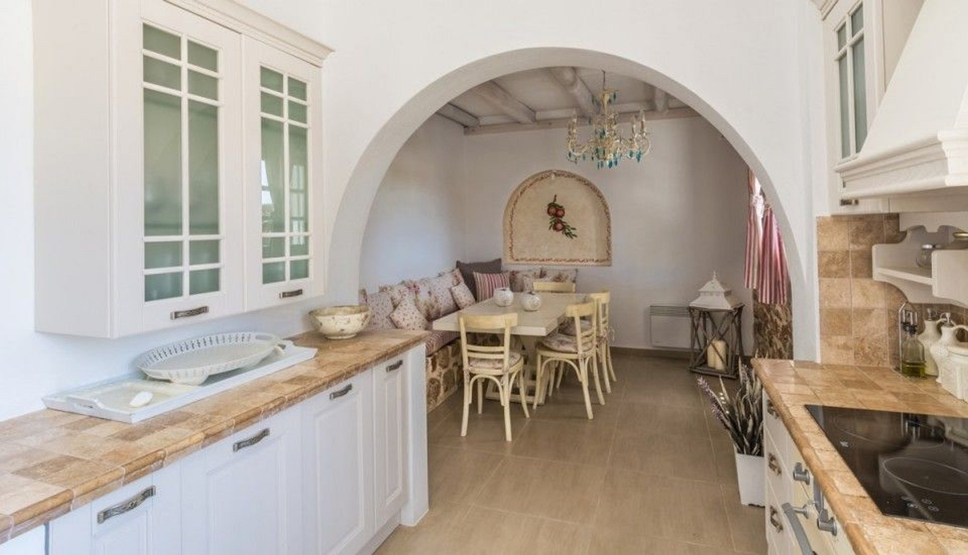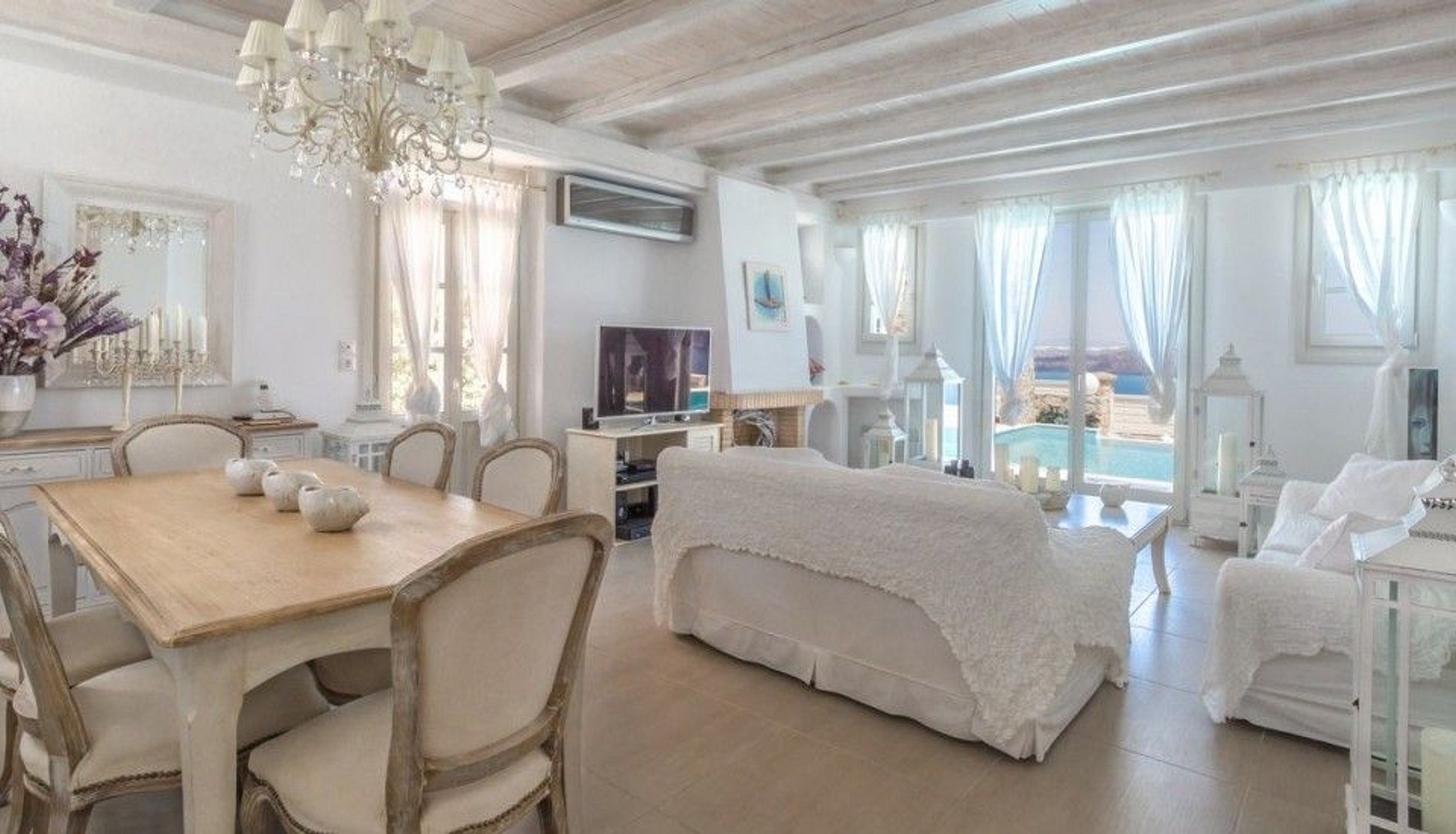 A área de estar interior da villa apresenta pintura colorida e objetos de arte, teto de madeira e lareira. Há também uma área de jantar com capacidade para oito pessoas e uma cozinha totalmente equipada.