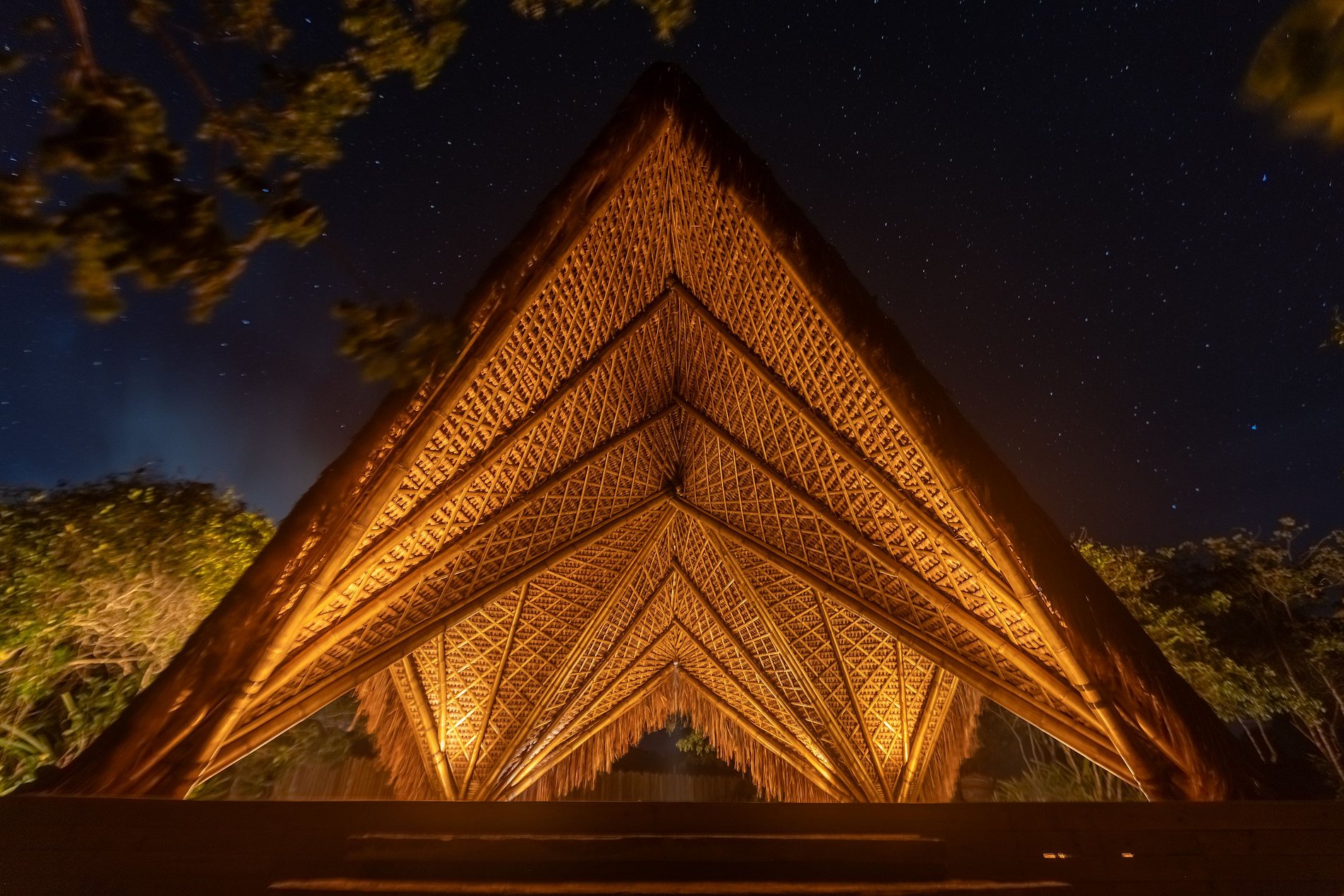 Mit den Füßen im Sand, ganz aus Bambus und wiederverwendetem Holz gebaut, verzaubert es auf einzigartige Weise. Der geräumige Hauptwohnbereich ist eine große, mit Piaçava-Palmblättern bedeckte Hütte, die sich zu einem Deck mit Pool und Meerblick öffnet.