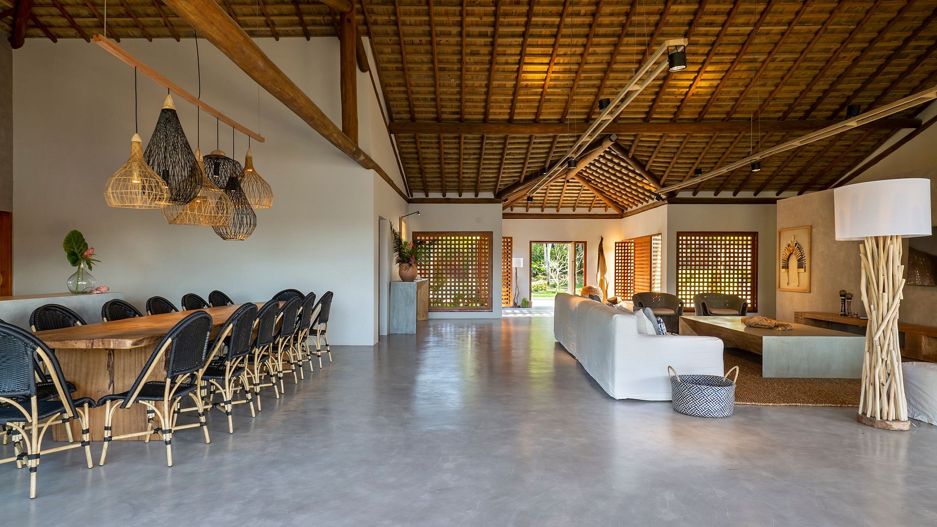 Seu projeto arquitetônico é a cara de Trancoso, desde os materiais de revestimento aos móveis e adornos de decoração, além de um paisagismo 100% tropical. A área total do terreno é de 2.793m2, sendo 1.237m2 de implantação e 1.556m2 de paisagismo.