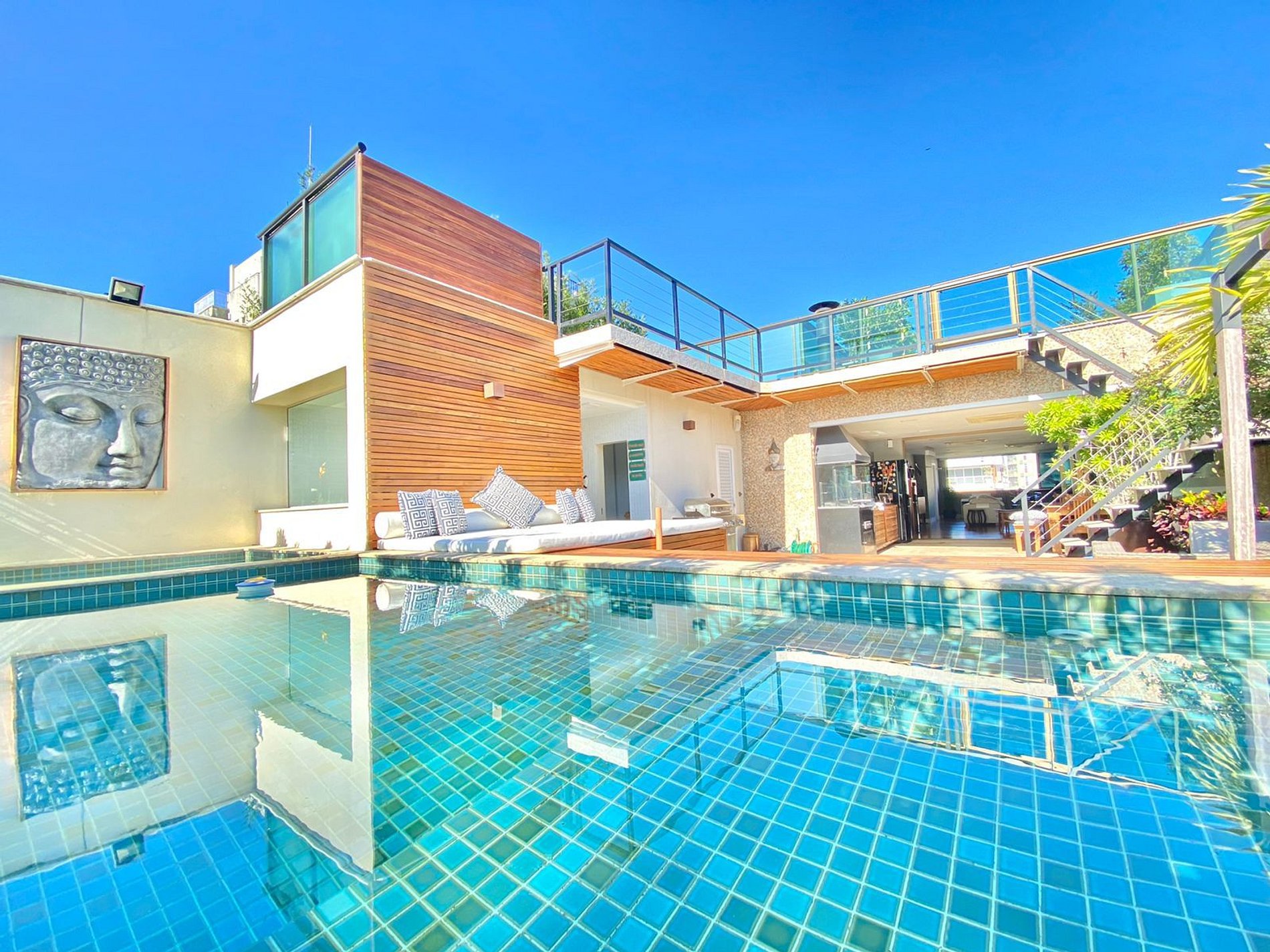 Oferece piscina, spa, hidromassagem, sauna a vapor, sistema de som com bluetooth e adega.