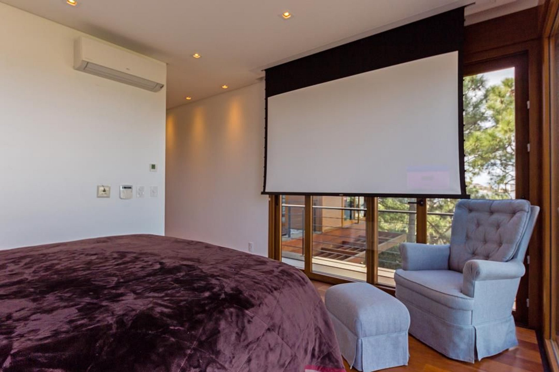 Além de sala 3 ambientes, espaço gourmet integrado à sala, escritório privativo, pé direito alto, com estilo clássico ao rústico, em madeiras e vidros. A piscina com pedras Hijau, uma tonalidade verde azulada criando um efeito de cores próximo da cor do mar, fazendo com que a piscina se integre à paisagem de forma natural. Hijau é uma pedra vulcânica, importada da Indonésia, bastante resistente, porosa, antiderrapante e por ser natural agrega muita beleza e um efeito especial na piscina, jacuzi e sauna.