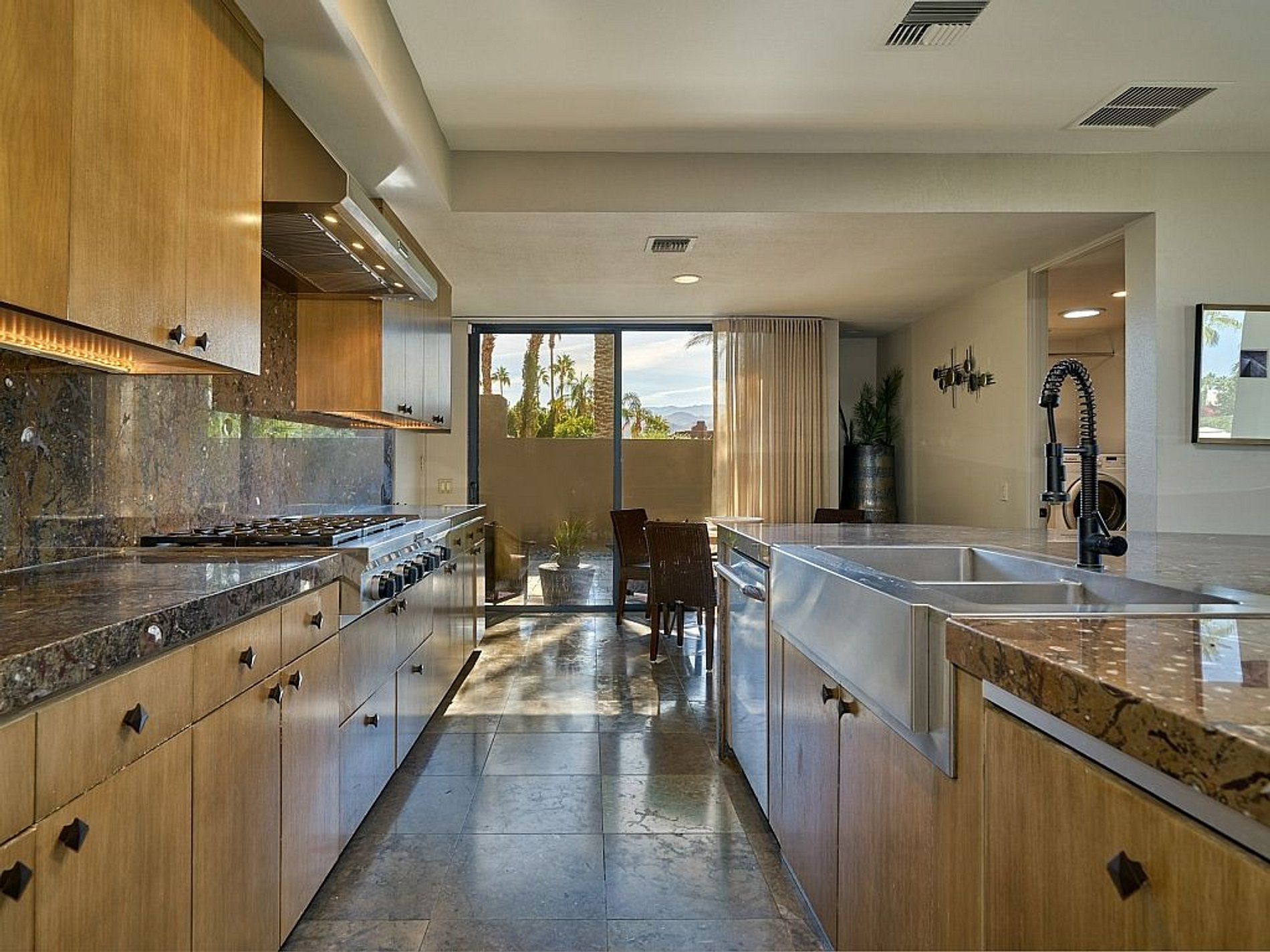 On a prime corner lot in the historic Tamarisk area of Rancho Mirage, this contemporary tennis estate sprawls over a half acre and showcases impressive scale and utmost privacy.
