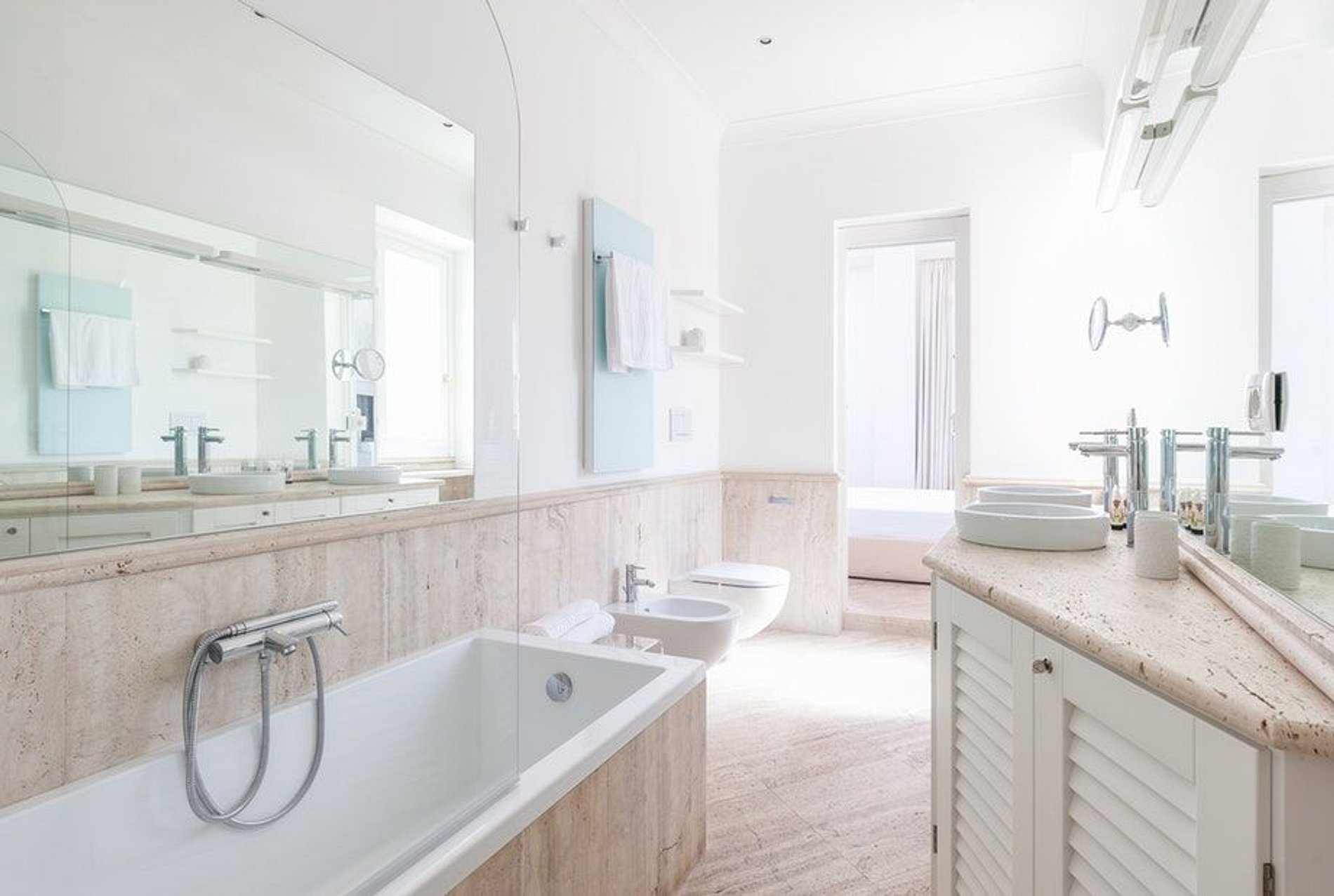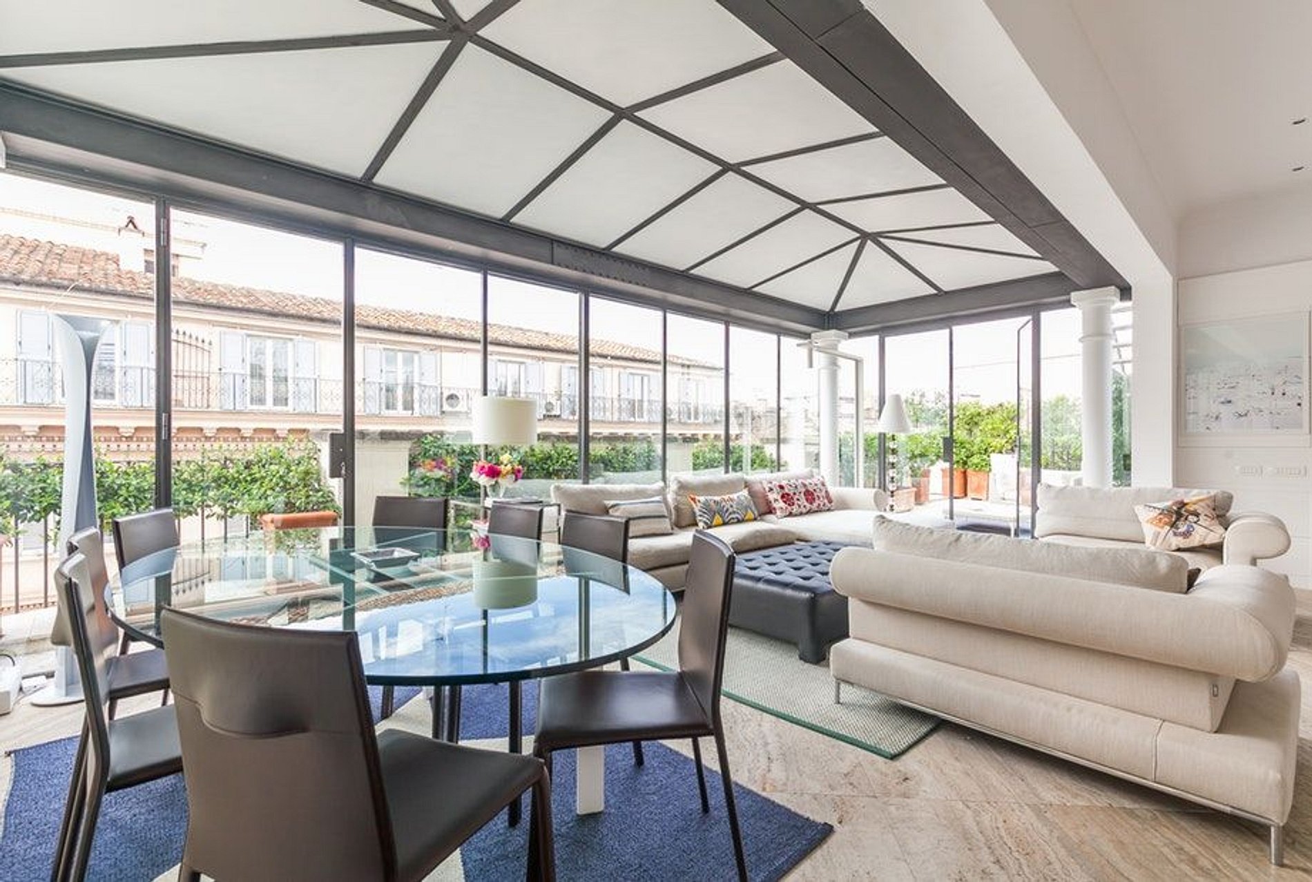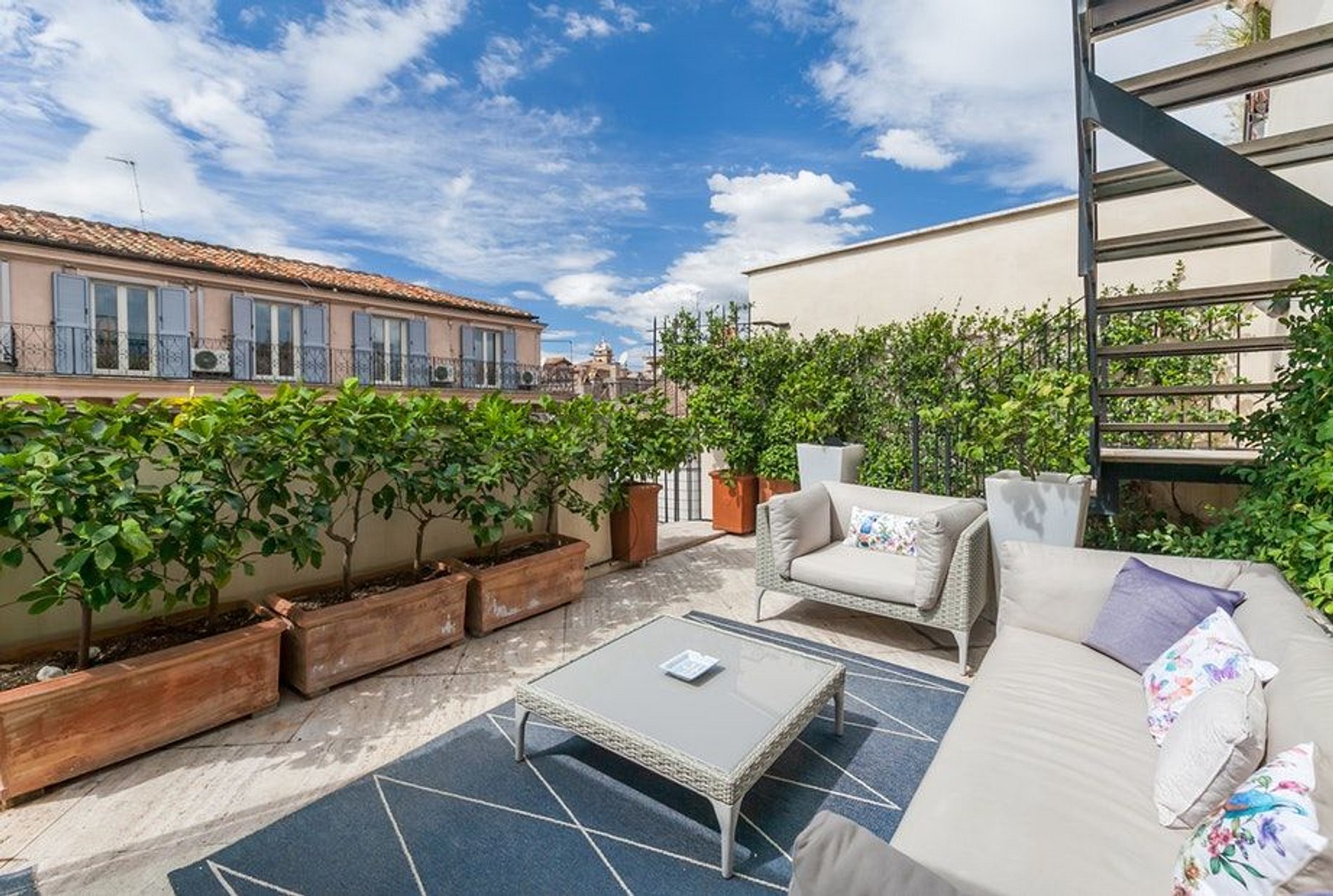 This splendidly situated home is elegant and inviting. Stepping inside, you enter a hallway, which leads straight to the open-plan living area. This room is impressively decorated, with marble floors and wide windows. It has a contemporary kitchen in one corner, opposite which you’ll spot a glass-topped dining table for eight. Then the sitting room has a white corner sofa and two matching armchairs, and opens onto a balcony through a column-flanked doorway. From there, a staircase runs up to the spectacular roof terrace, where a collection of sofas and tables face some of Rome’s finest sights.
