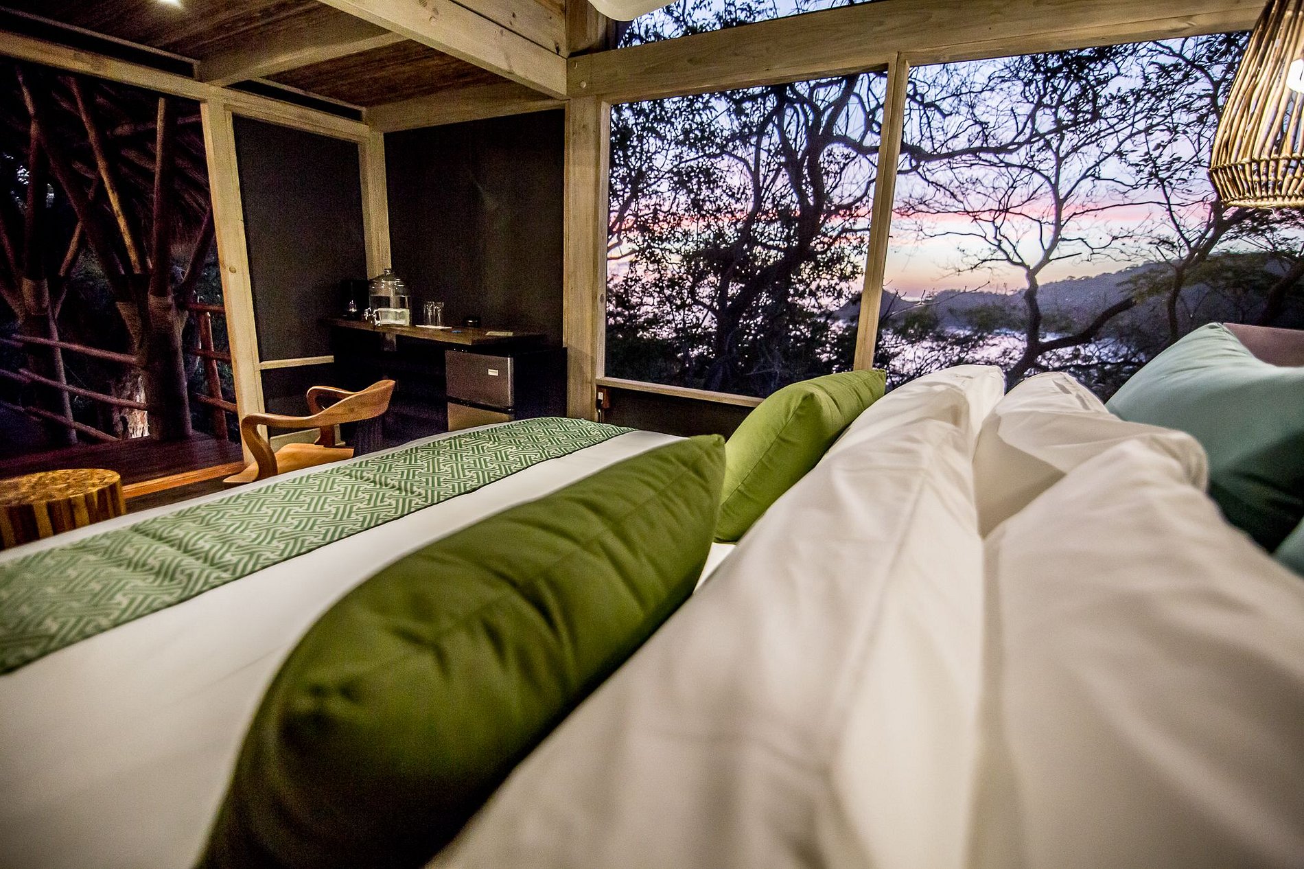 It also has a private plunge pool in each unit, which are located in cliffs on the treetops of the forest reserve and facing the Pacific Ocean. Each bungalow can accommodate up to five people. They have a queen size day bed suspended by ropes on the balcony, ideal for relaxing and enjoying the local beauty.