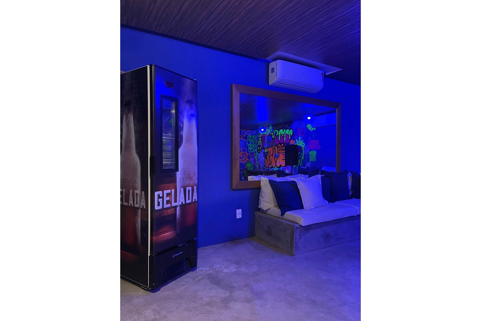 Piscina, área social fica no meio da propriedade com cozinha, churrasqueira a gás, bar e lavabo. No subsolo há uma boate subterrânea acústica.