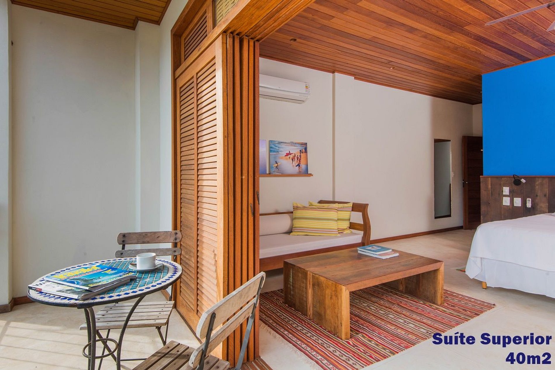 The Master Suite is the Hotel’s most special accommodation. There are 75sqm, enough space to offer a special experience for a couple or host a family, as if necessary, it is possible to connect this suit to another room. A spacious balcony places hammocks for a rest with an unique view of the fishing boats in the sea.