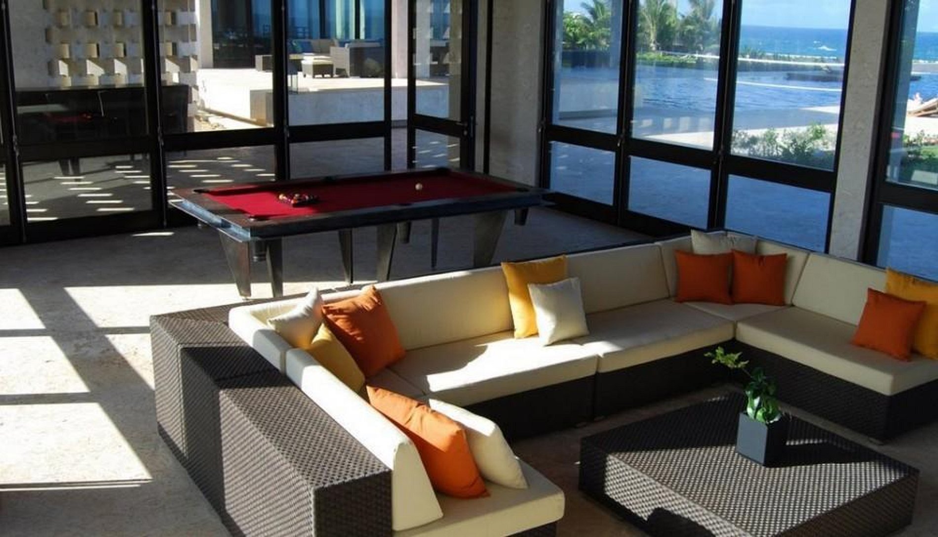 Indoors, the living area is the picture of simple sophistication, with seating areas grouped perfectly for conversation, and floor-to-ceiling windows that overlook the ocean. The dining area features ample seating for large parties, as well as plenty of open space for entertaining.