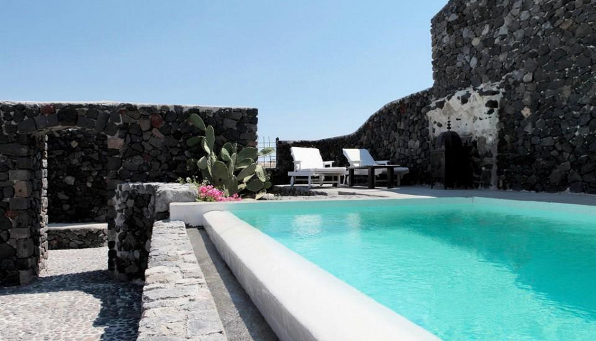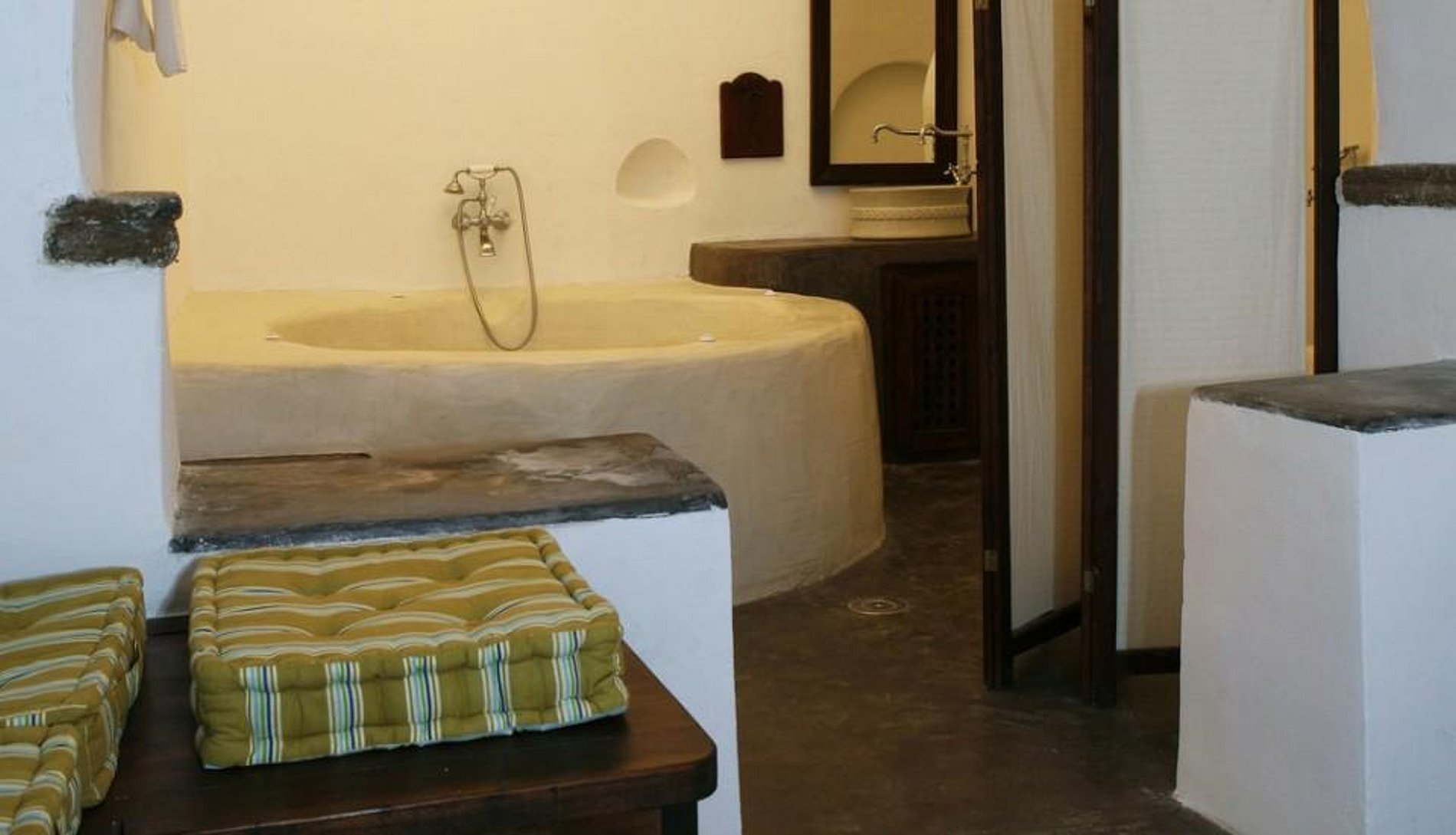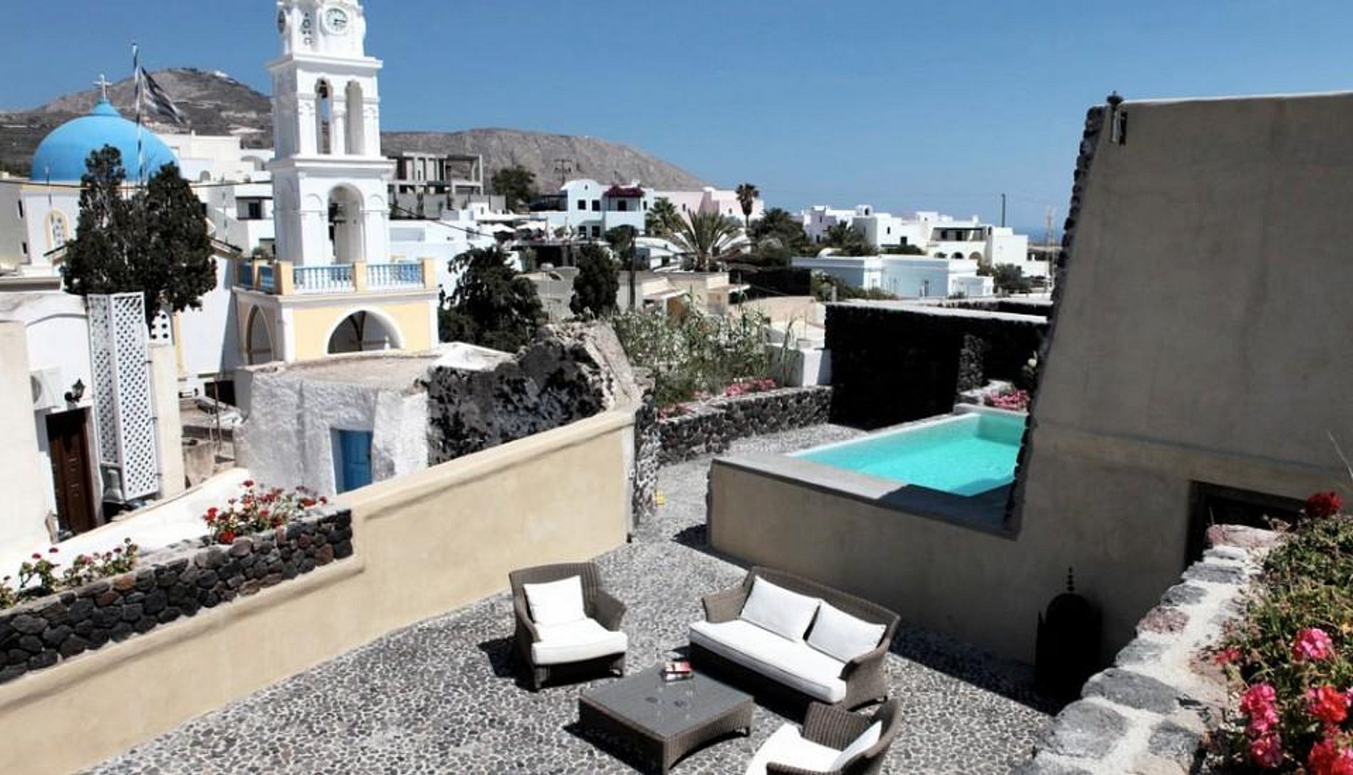From the charming town square, a meandering cobblestone footpath winds upward, where guests encounter the hand-laid cobblestone courtyard of Mansion Kyani. The three very private suites interconnect via an outside stone staircase.