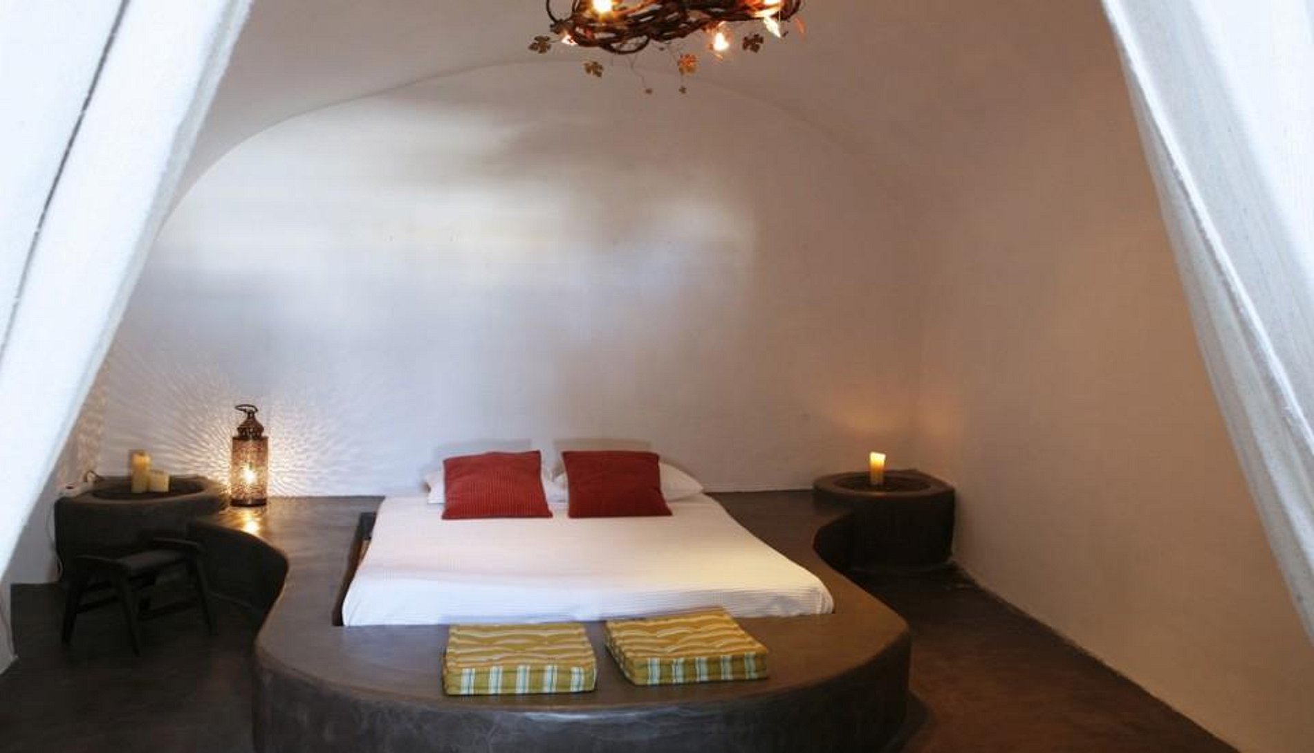 The ground floor offers an inviting infinity pool and volcanic rock sun deck, where guests can enjoy the views of Megalochori and the Aegean Sea beyond. In the evening, accent lighting beautifully illuminates this outdoor space for guests to lounge in the outdoor seating area. Also located on the ground floor is a compact, yet fully equipped, kitchen as well as the grand master bedroom. This dome-ceilinged master bedroom is rustically decorated to provide a peaceful and comfortable atmosphere, and enjoys an inviting tub in the en-suite bath. The second level also provides two additional bedrooms with their own bathrooms.