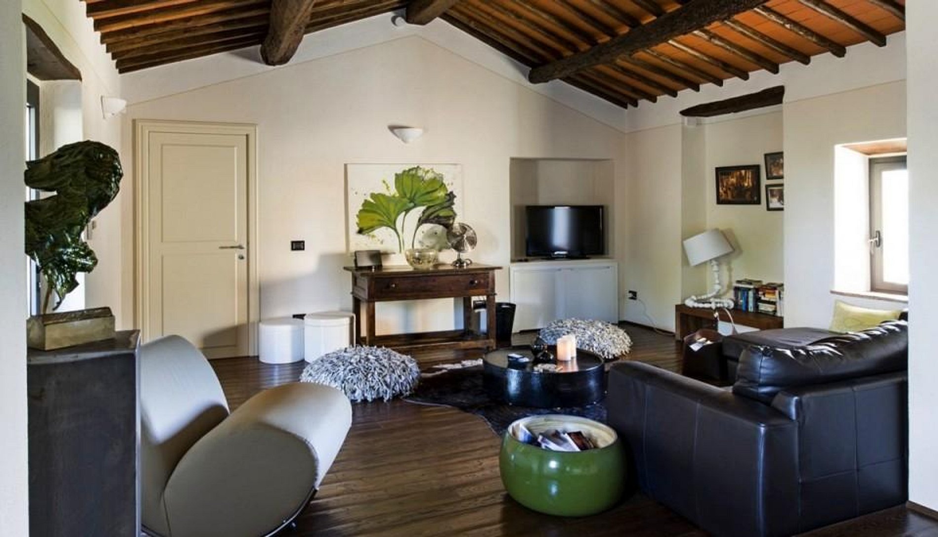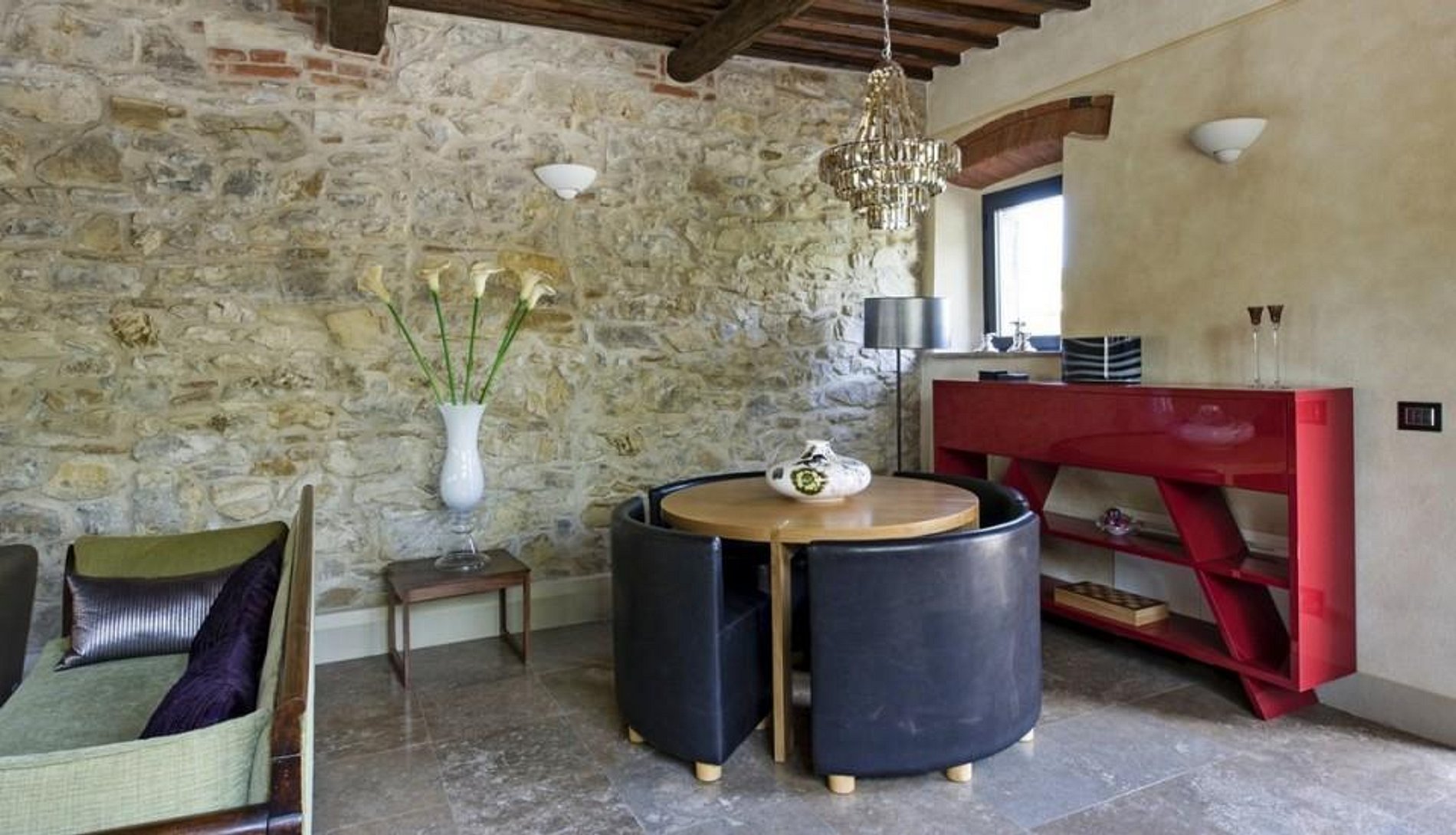 The four hundred year old farmhouse features traditional thick Tuscan walls, tiled roofs, massive fireplaces, beamed ceilings and exposed stonework. Lovingly restored, the home reflects the best of Italian style, contemporary decor and modern conveniences.