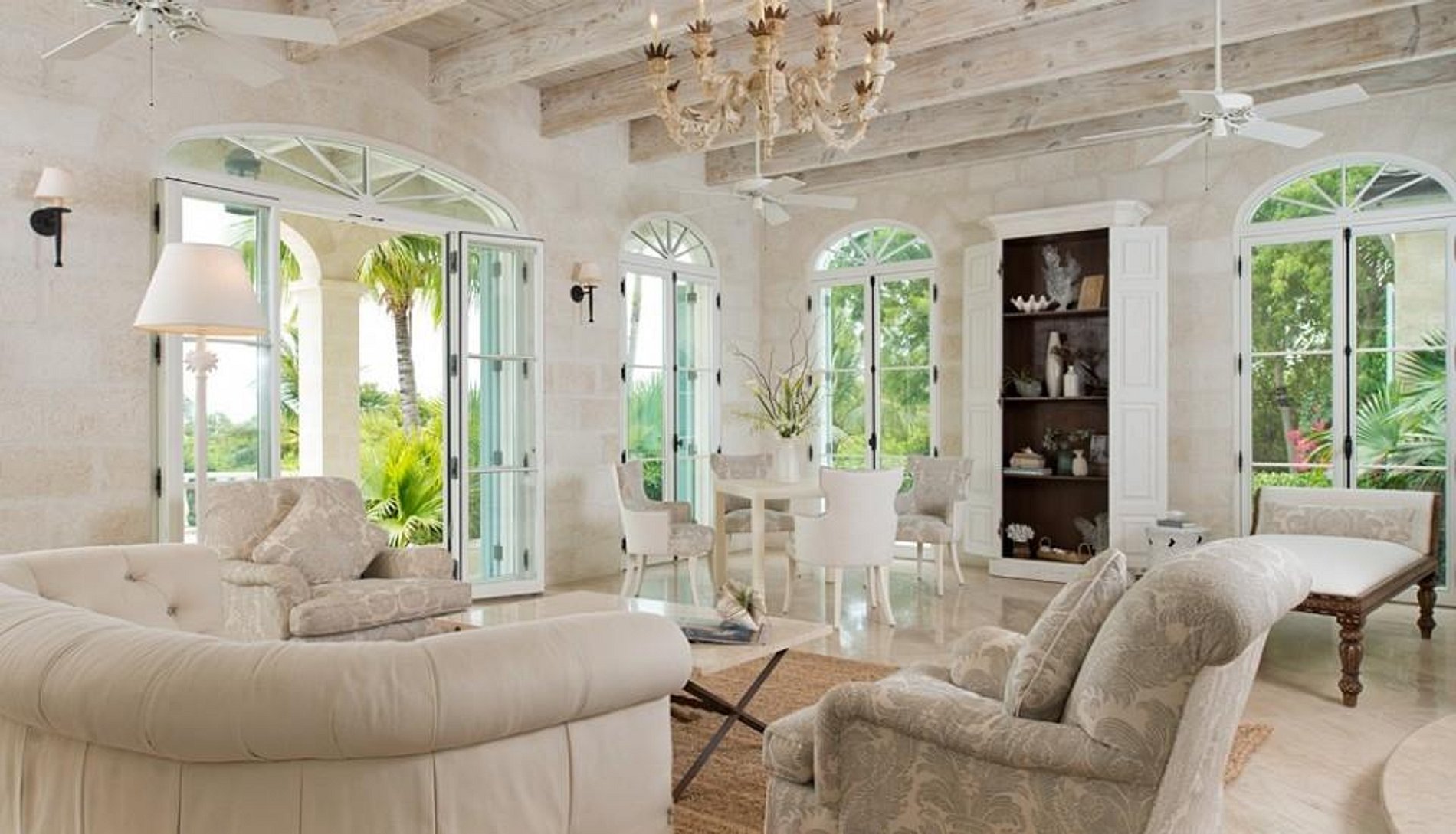 Inside, on the ground floor, the villa features calming colors and lovely Barbadian coral stone walls. The large family room provides great views and glass doors opening up to the terrace outside. A spacious kitchen can be found nearby. This kitchen overlooks the manicured front lawn and has rustic cupboards, modern appliances and lovely granite countertops. The kitchen is connected to the dining room by French doors. The dining room enjoys a table for 12 and views of the sea.