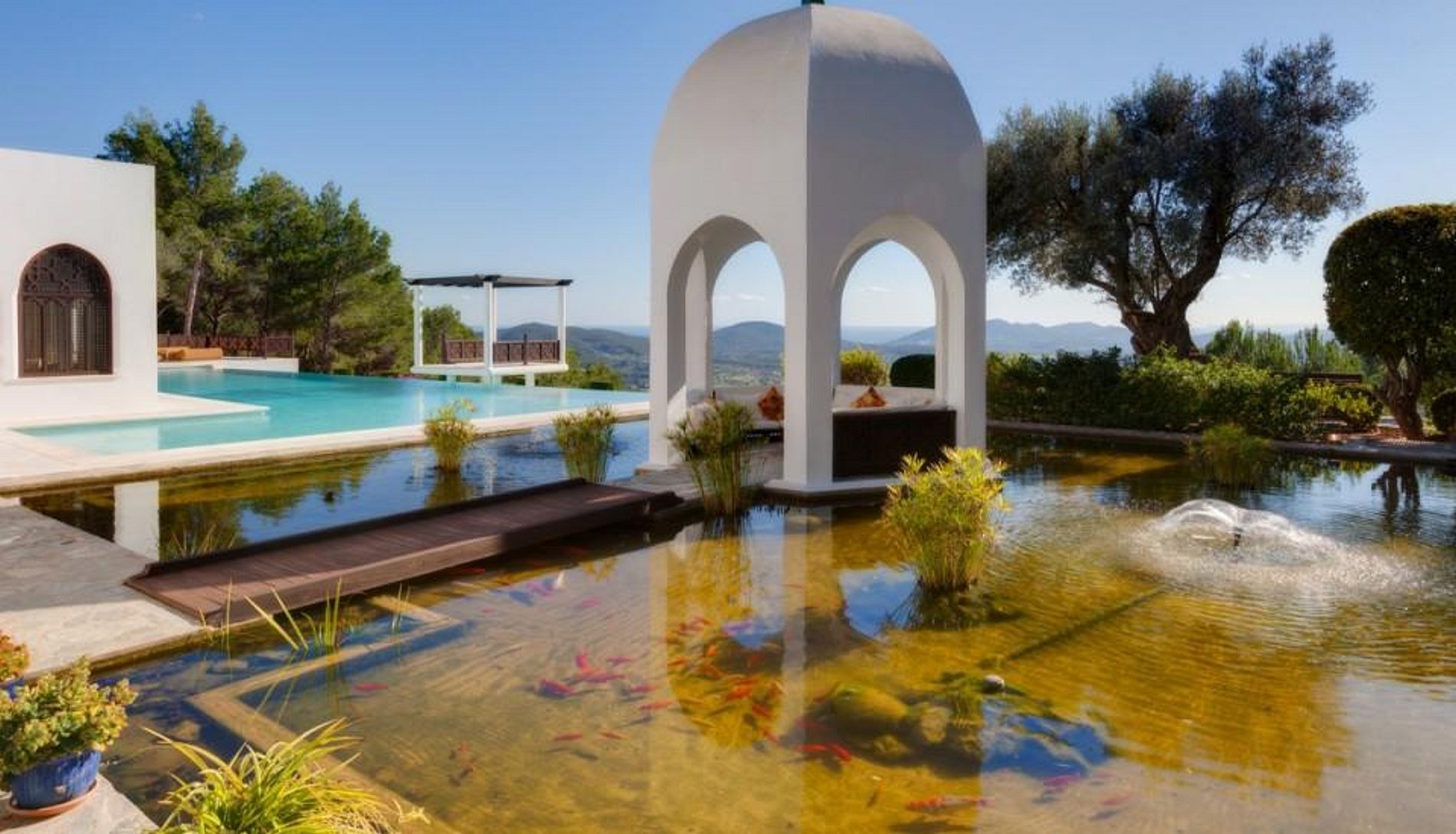 Villa Breeze is located on the south side of Ibiza behind the beaches of Sa Caleta and Cala Jondal. Surrounded by gardens, with the forested hills and the turquoise sea and blue horizon beyond, the villa offers a unique experience in a spectacular location. Just a ten minute walk from the beach and four kilometers from Ibiza Town, guests may choose the party life at such renowned establishments as the Blue Marlin on Casa Jondal or relax in the comfort and quiet of their private villa. This ultra-modern villa, with its avant-garde furnishings and design, showcases the stunning views. Everywhere are details that engage the senses. Floor to ceiling and wall to wall windows frame the bucolic scenery and overlook a twenty-three by four point five meter salt-water infinity pool. Contemporary furnishings express imagination and and make a provocative statement in every room. The villa ho..