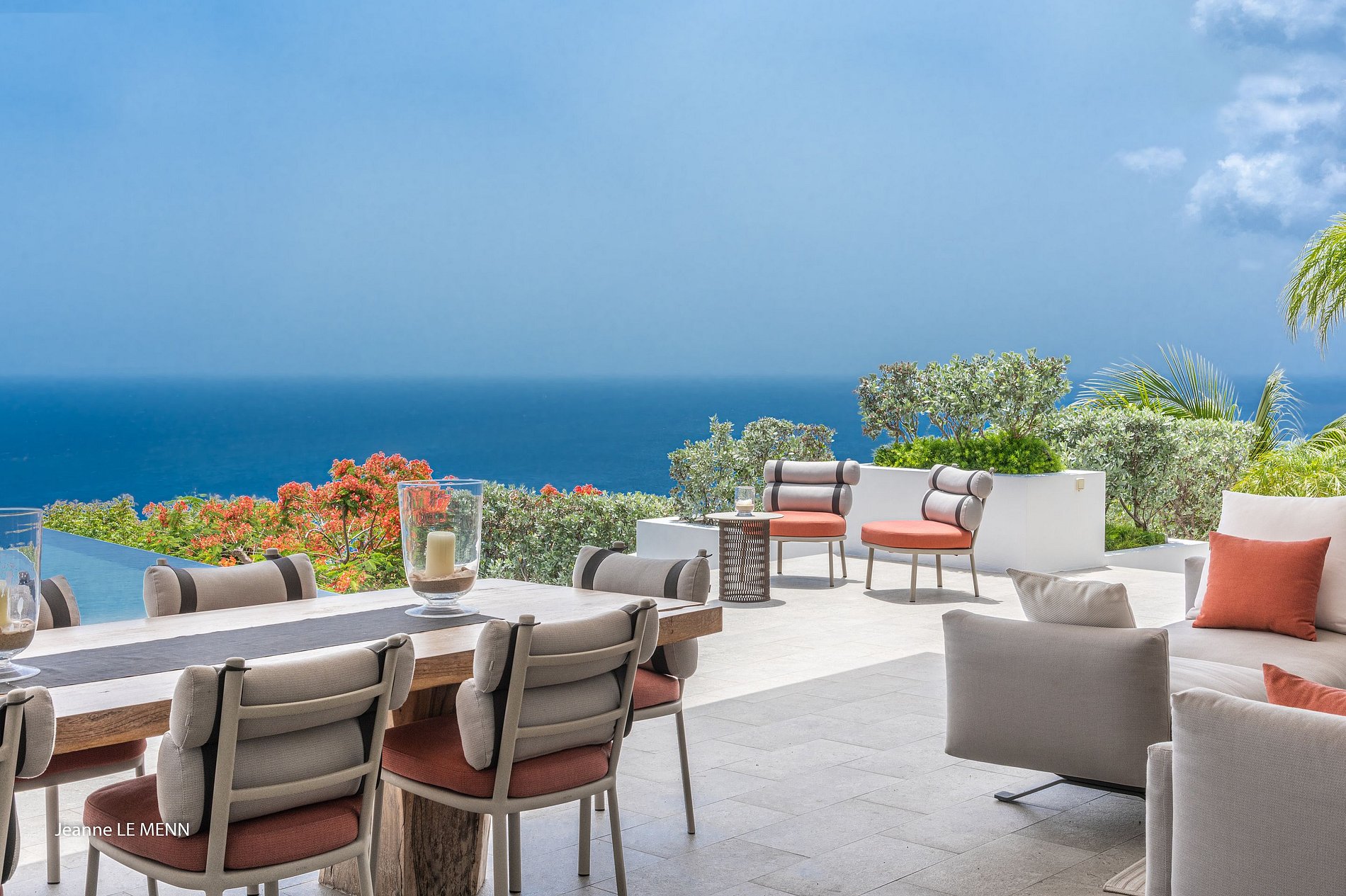 Villa GEM's large living area and kitchen are completely open to the terrace, pool, and spectacular view of the Caribbean Sea, thanks to an ingenious system of floor-to-ceiling sliding glass doors. Two entire walls vanish out of sight without any supporting columns remaining, breaking down the definitions of indoor and outdoor. Just outside the living area, a hardwood dining table seating ten is sheltered by a cantilevered roof. During the morning, the living area and the convenient and open kitchen appear as a cool refuge from the sun, while they are fully illuminated by sunlight throughout the afternoon. In the evening, well-placed recessed and indirect lighting give the space a warm and welcoming ambiance. The wide deck around the infinity pool offers the comfort of chaises in the sun as well as a shaded seating area beside the garden of bougainvillea and coconut palms.