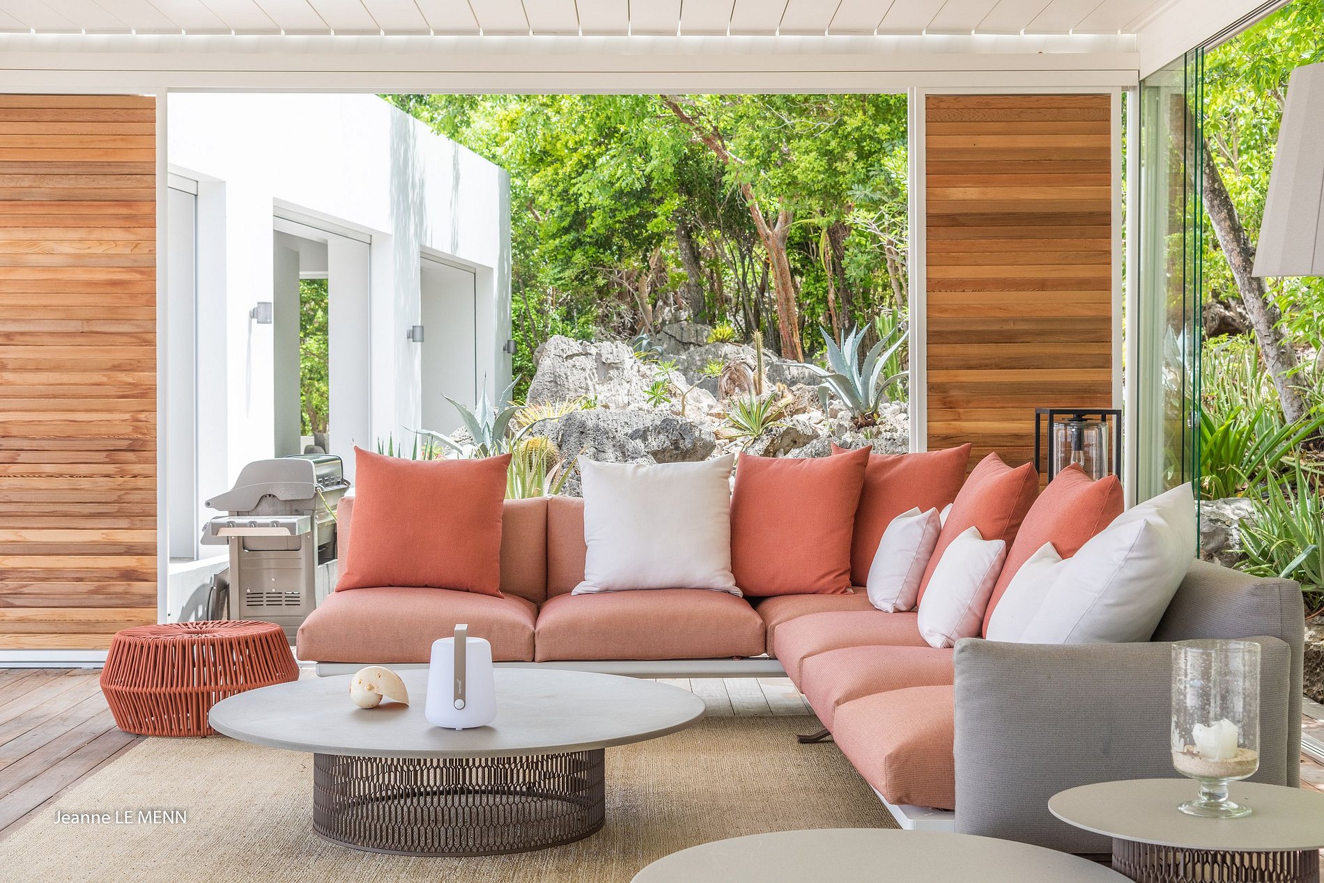 Villa GEM's large living area and kitchen are completely open to the terrace, pool, and spectacular view of the Caribbean Sea, thanks to an ingenious system of floor-to-ceiling sliding glass doors. Two entire walls vanish out of sight without any supporting columns remaining, breaking down the definitions of indoor and outdoor. Just outside the living area, a hardwood dining table seating ten is sheltered by a cantilevered roof. During the morning, the living area and the convenient and open kitchen appear as a cool refuge from the sun, while they are fully illuminated by sunlight throughout the afternoon. In the evening, well-placed recessed and indirect lighting give the space a warm and welcoming ambiance. The wide deck around the infinity pool offers the comfort of chaises in the sun as well as a shaded seating area beside the garden of bougainvillea and coconut palms.
