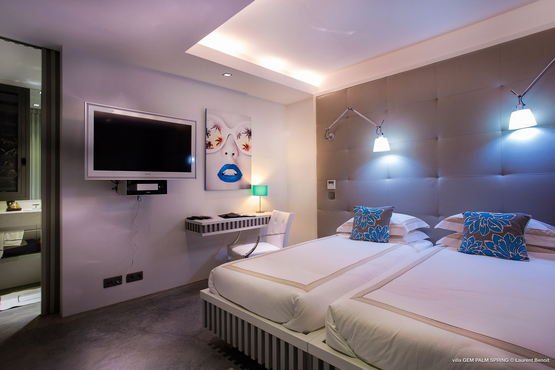 The master bedroom suite continues the same level of design consciousness, with custom cabinetry in Brazilian wenge wood, polished concrete floors and carefully planned lighting. The ensuite bath offers facing Jack and Jill vanities and a pebble-stone tiled, rain-head shower. Villa Springs' three other bedrooms, each with its own private bath, reflect the stylistic influence of the master bedroom re-imagined in different color schemes. The woodwork and upholstery throughout evoke an updated sense of 1960's lines and form, perfectly adapted to a tropical setting. In a crowning touch right out of a Bond film, one of the bedrooms provides a picture-window view into the crystal-clear water of the infinity heated pool. Also on the lower level is an air-conditioned fitness room with treadmill and step machine, as well as a secluded outdoor space perfect for yoga or massage.