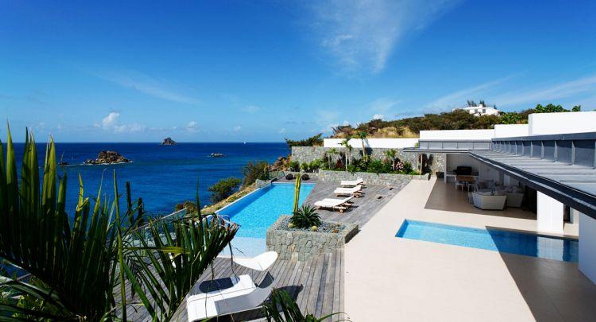 The bright and open main living area includes a fully equipped gourmet kitchen with a long breakfast bar, making it perfect for entertaining. Decorated in a minimalist yet comfortable fashion, this room opens directly onto the terrace, large infinity pool and the view beyond. An outdoor dining table seats ten or more (in addition, another large table is available), and on the terrace by the pool are plentiful chaises for sunning. The master bedroom opens onto the terrace and view, while the other bedrooms, all luxuriously appointed, are in a separate building with ocean views from the second floor and garden views from the first.