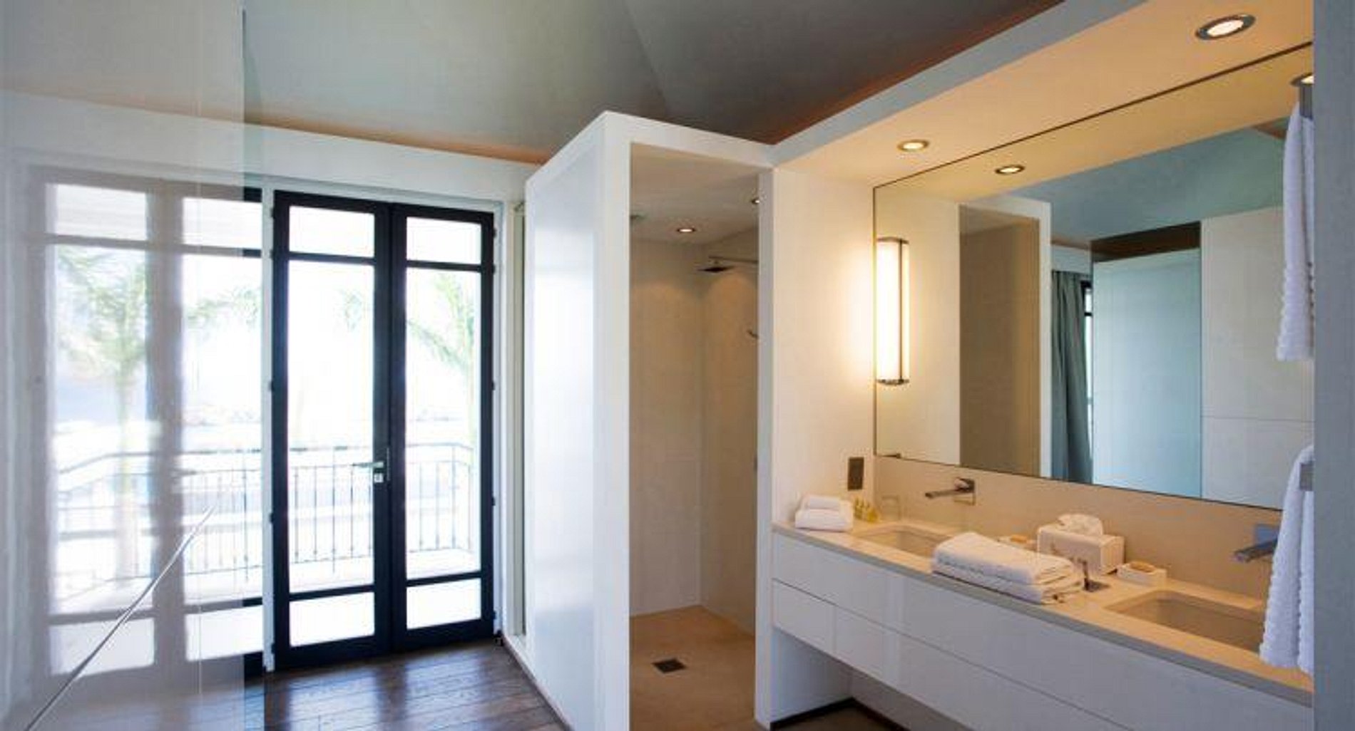 The bright and open main living area includes a fully equipped gourmet kitchen with a long breakfast bar, making it perfect for entertaining. Decorated in a minimalist yet comfortable fashion, this room opens directly onto the terrace, large infinity pool and the view beyond. An outdoor dining table seats ten or more (in addition, another large table is available), and on the terrace by the pool are plentiful chaises for sunning. The master bedroom opens onto the terrace and view, while the other bedrooms, all luxuriously appointed, are in a separate building with ocean views from the second floor and garden views from the first.