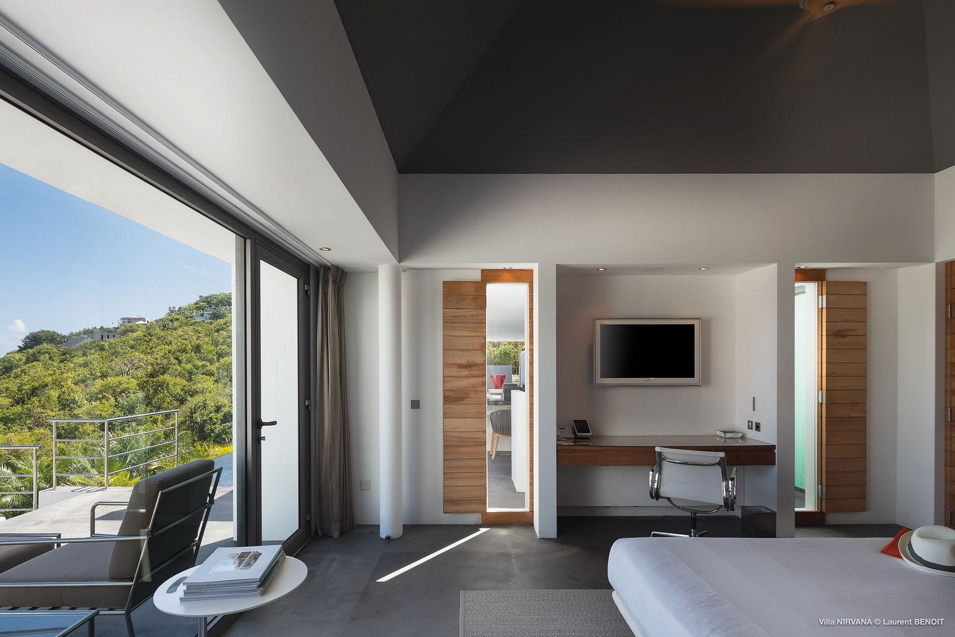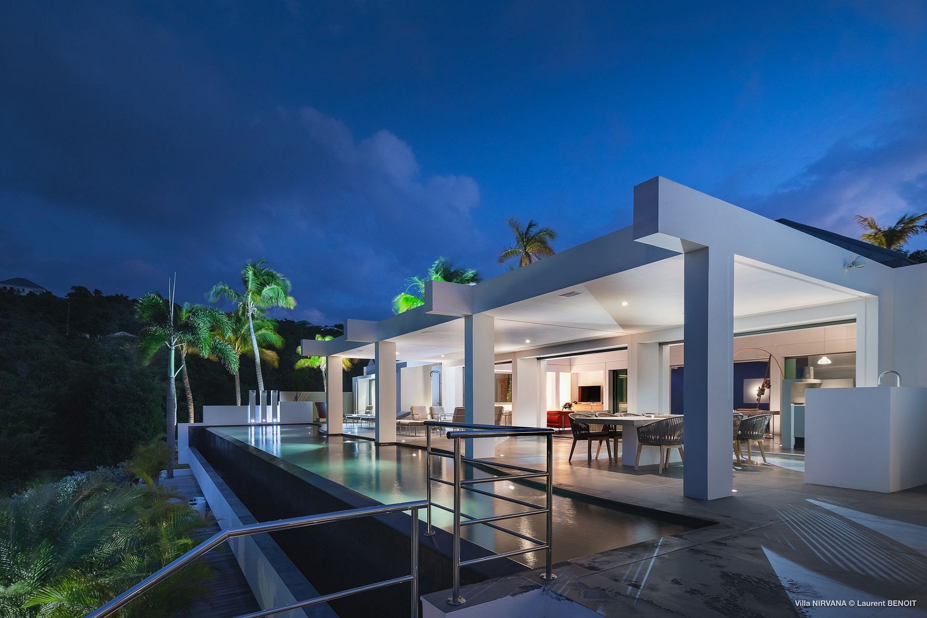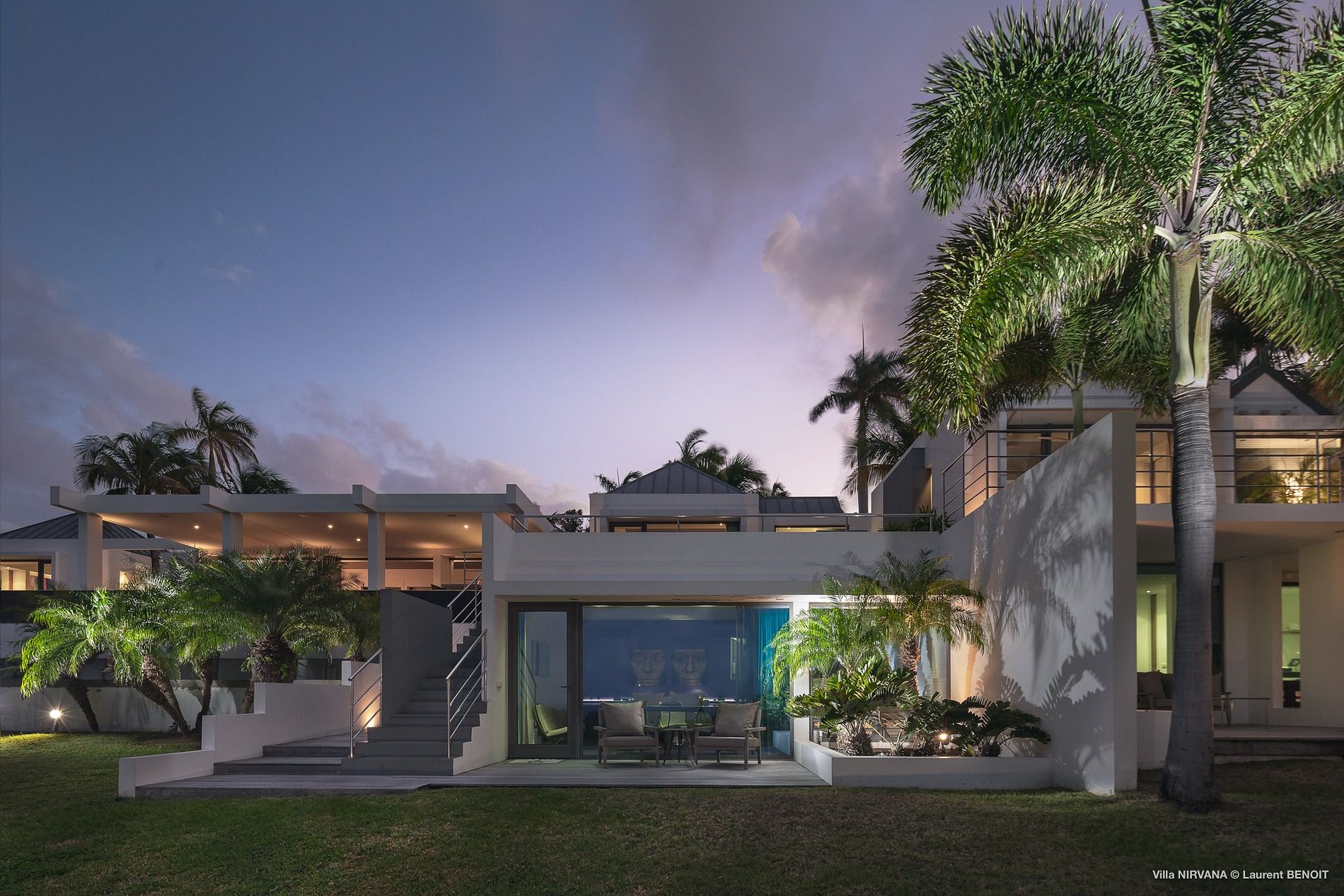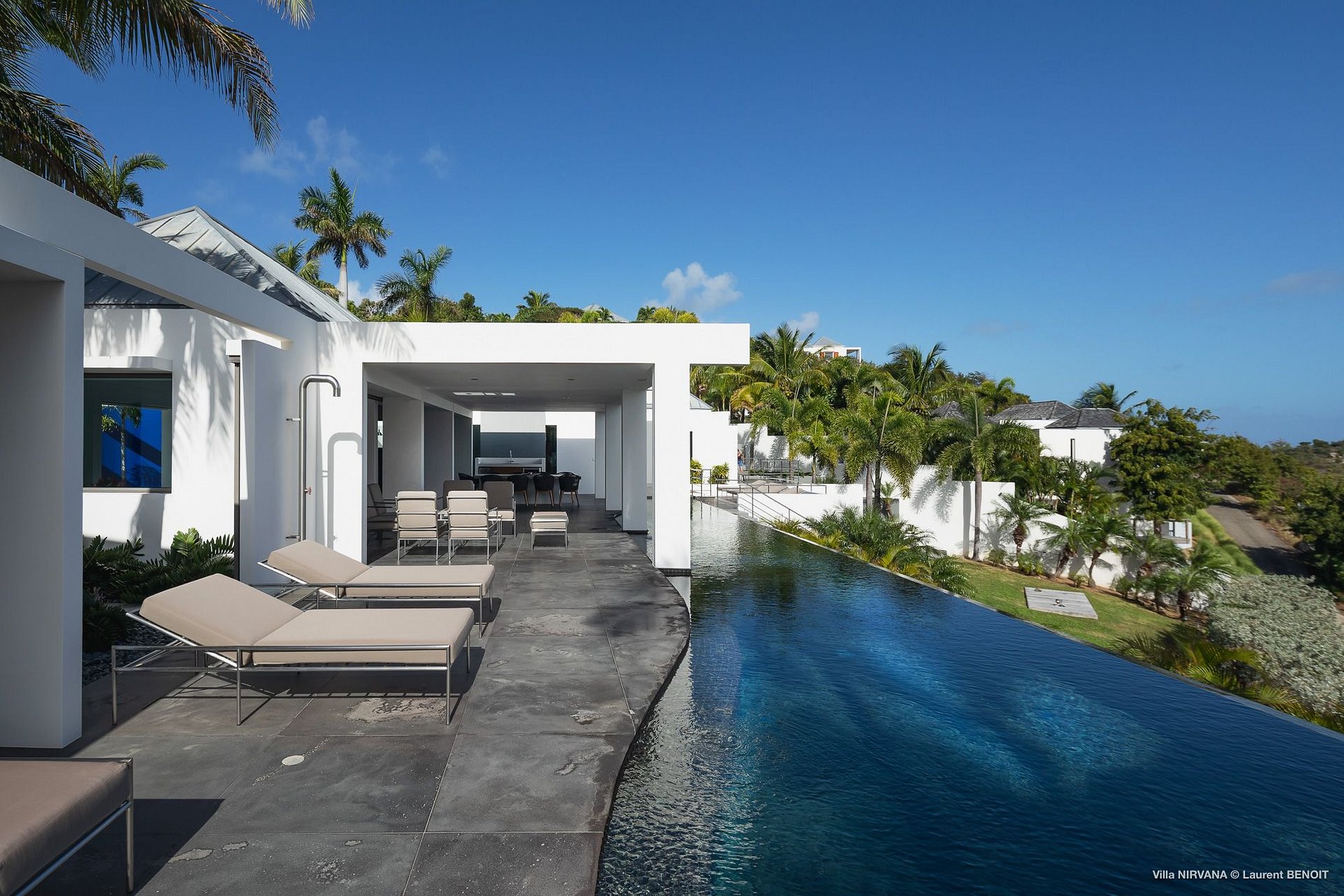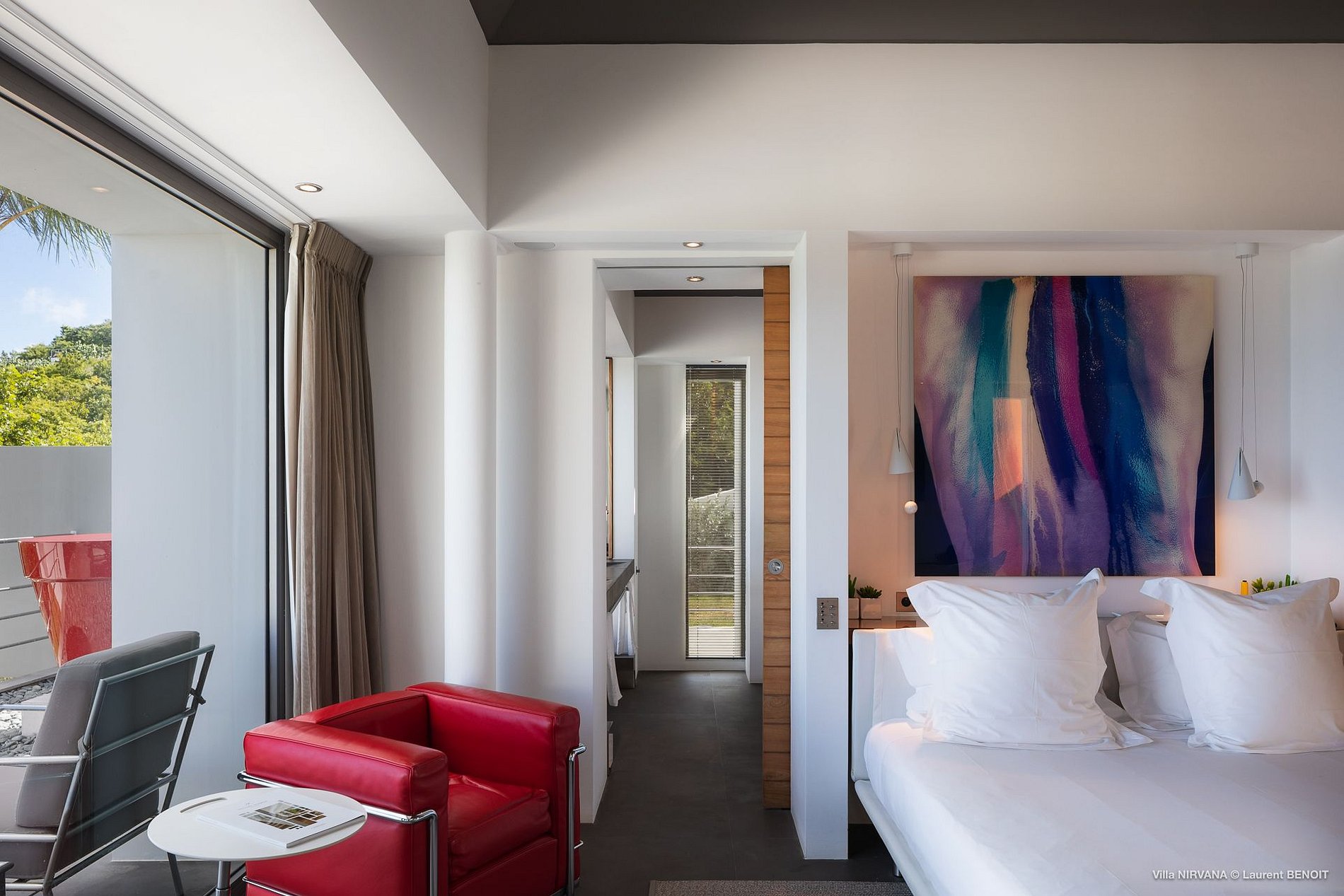 In Buddhist teachings, Nirvana is the ultimate peace of mind. In Hinduism, it is the union with the divine and the experience of bliss. In St. Barth, Villa Nirvana (NIR) is a serene temple of design, where bliss and peace are easily realized. In the uniquely 21st-century rental property, unusual architecture and contemporary art set the stage for a visual audacity unprecedented in St. Barth and probably in all the Caribbean. An almost monochromatic universe creates an air of contemplation, until splashes and touches of color interrupt like the unexpected sound of laughter. Chic and yet comfortable, Villa Nirvana is a level above.