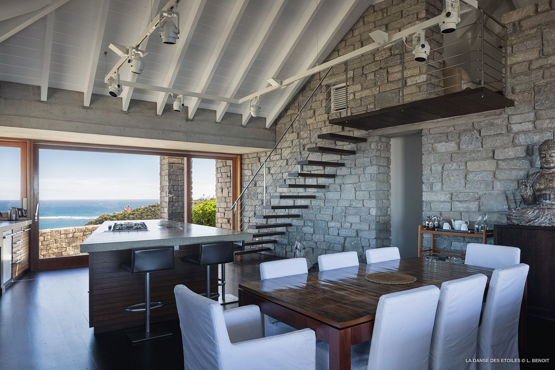 La Danse des Etoiles (Villa DOL) is an extraordinary achievement of design and craftsmanship. The exquisite melding of wood and stone throughout this home creates a cool and relaxing atmosphere and combines with the carefully selected furnishings to make Villa DOL one of the finest properties in St. Barth. Nearly two years of painstaking work by stone cutters and carpenters brought to fruition this extraordinary vision from the New York architectural firm of Barnes and Coy.