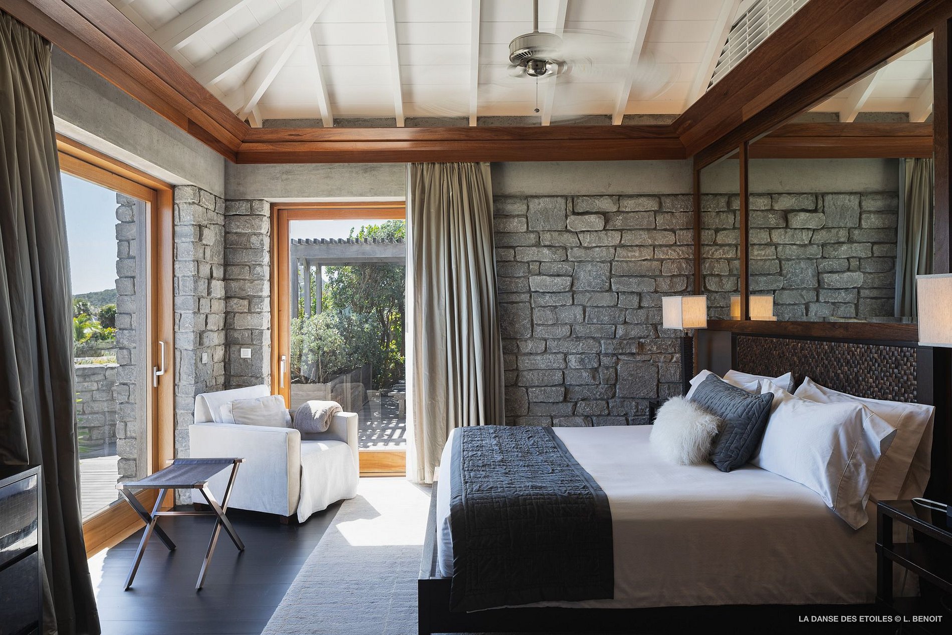 La Danse des Etoiles (Villa DOL) is an extraordinary achievement of design and craftsmanship. The exquisite melding of wood and stone throughout this home creates a cool and relaxing atmosphere and combines with the carefully selected furnishings to make Villa DOL one of the finest properties in St. Barth. Nearly two years of painstaking work by stone cutters and carpenters brought to fruition this extraordinary vision from the New York architectural firm of Barnes and Coy.