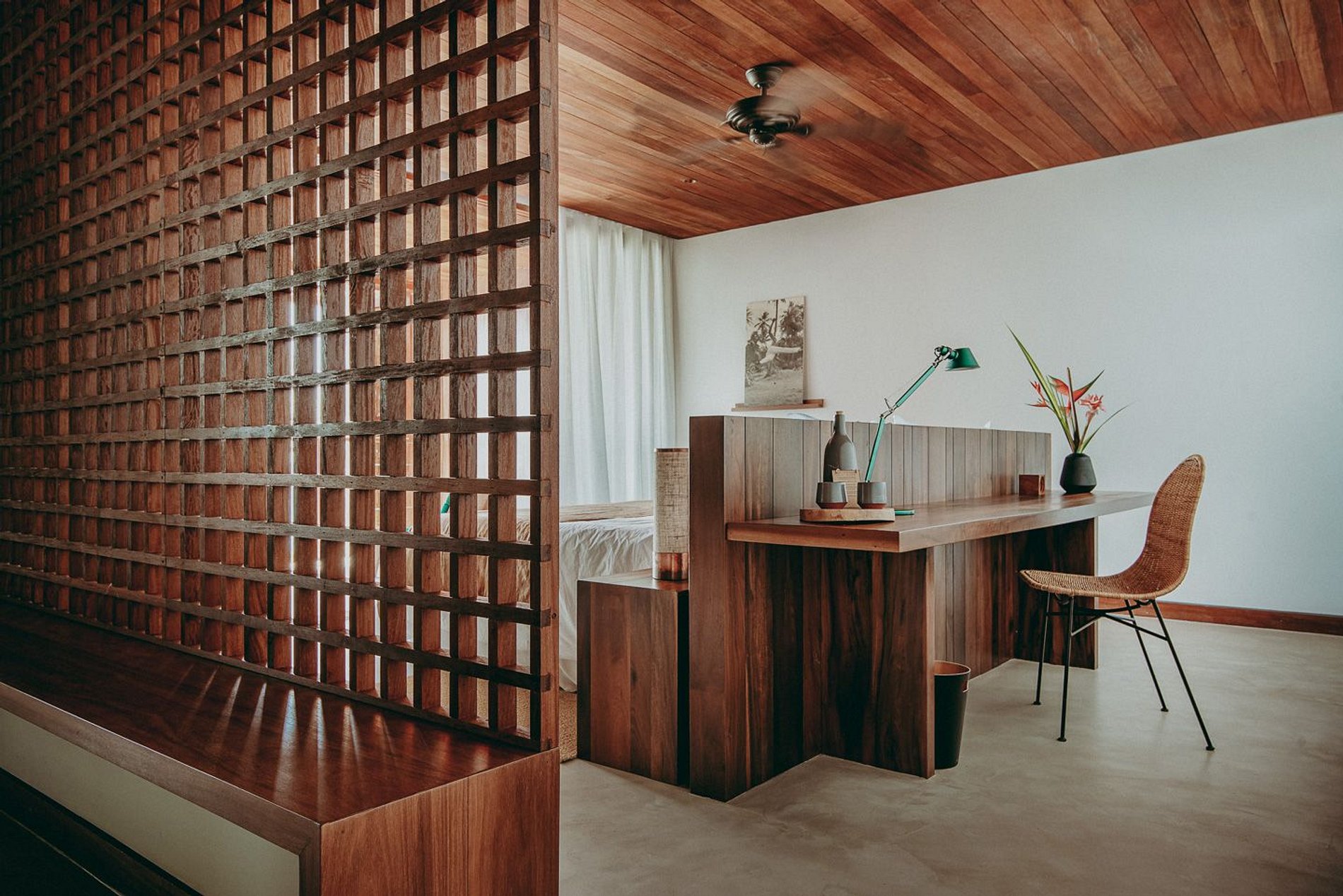 Bright, airy and cozy, The Barracuda Suites with 62m2 have views of the sea and the Atlantic Forest. They are modern and decorated with natural tones and textures. Photographs and portraits of Itacaré bring a little of the history of local life into the suites.