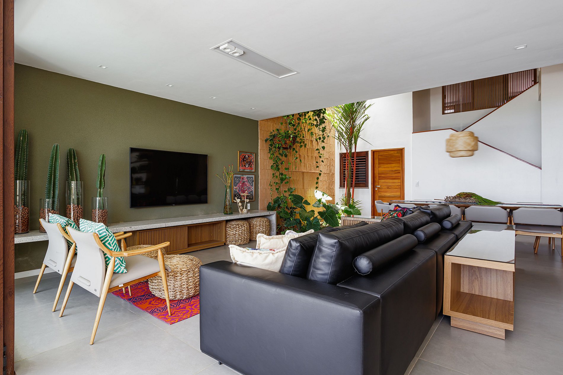 As salas dispõem de uma mesa de jantar, sofás e uma televisão smart para entretenimento familiar. A abertura das esquadrias proporcionam uma ventilação fresca e constante.