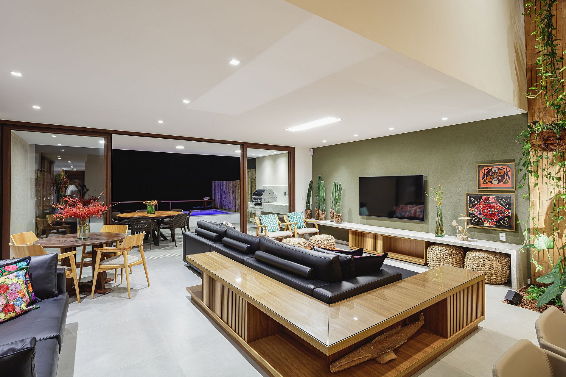 As salas dispõem de uma mesa de jantar, sofás e uma televisão smart para entretenimento familiar. A abertura das esquadrias proporcionam uma ventilação fresca e constante.