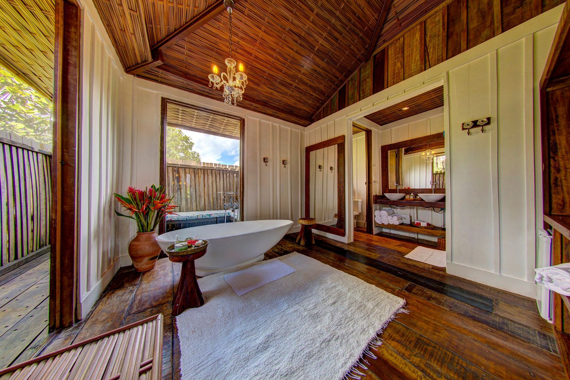 The bathroom/closet stands out for the ‘limestone’ volcanic rock bathtub, in Italian design, facing a glass window, overlooking the sunset. On the back porch, outdoor shower and private area to enjoy a sunbath.
