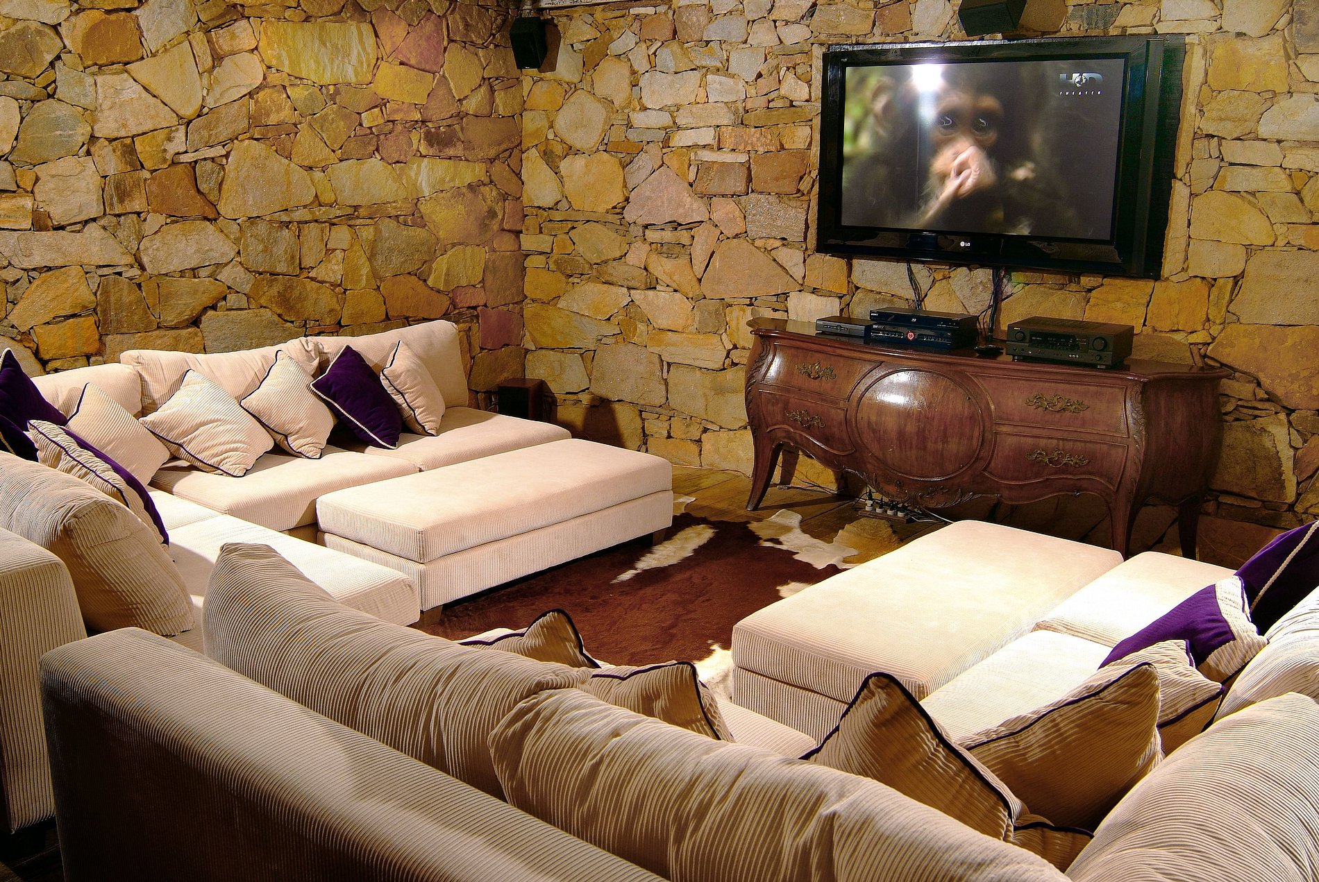 The common space comprises an internal patio, dining room, TV room, living room with piano and fireplace.