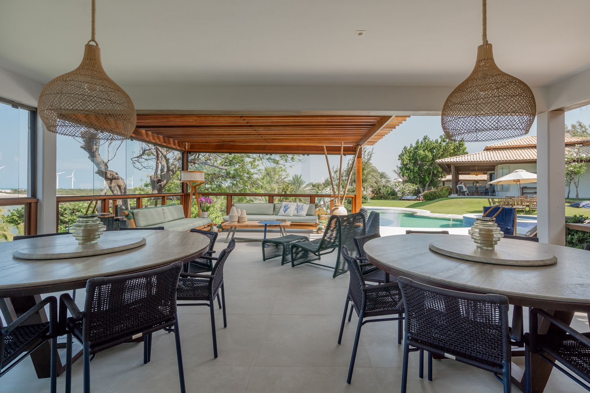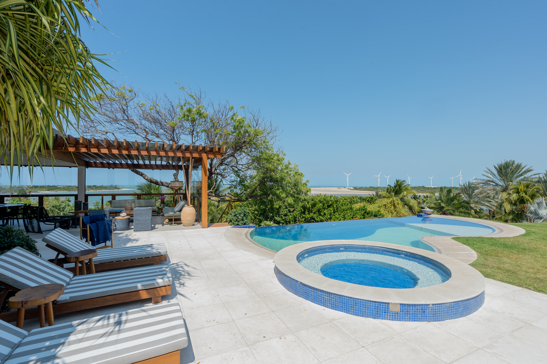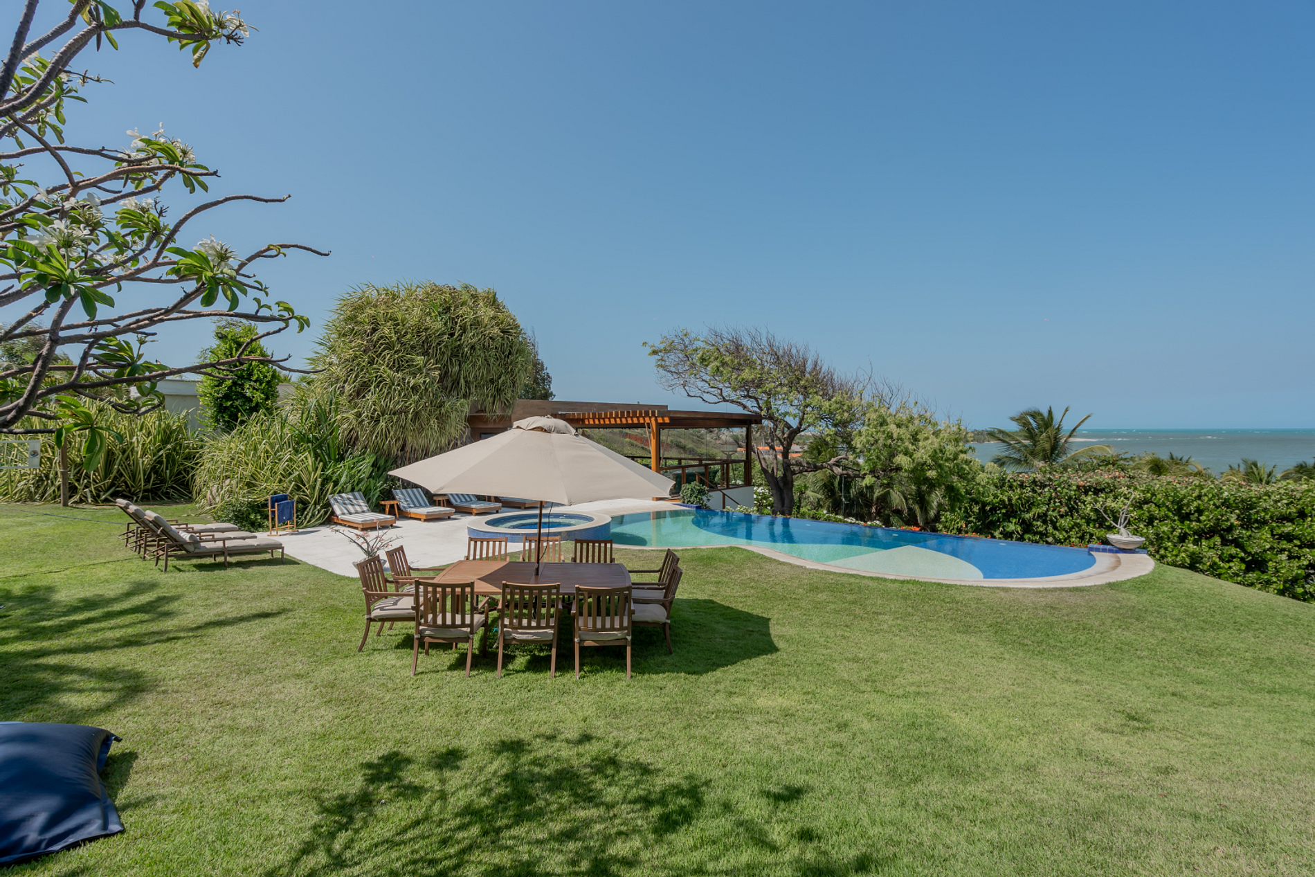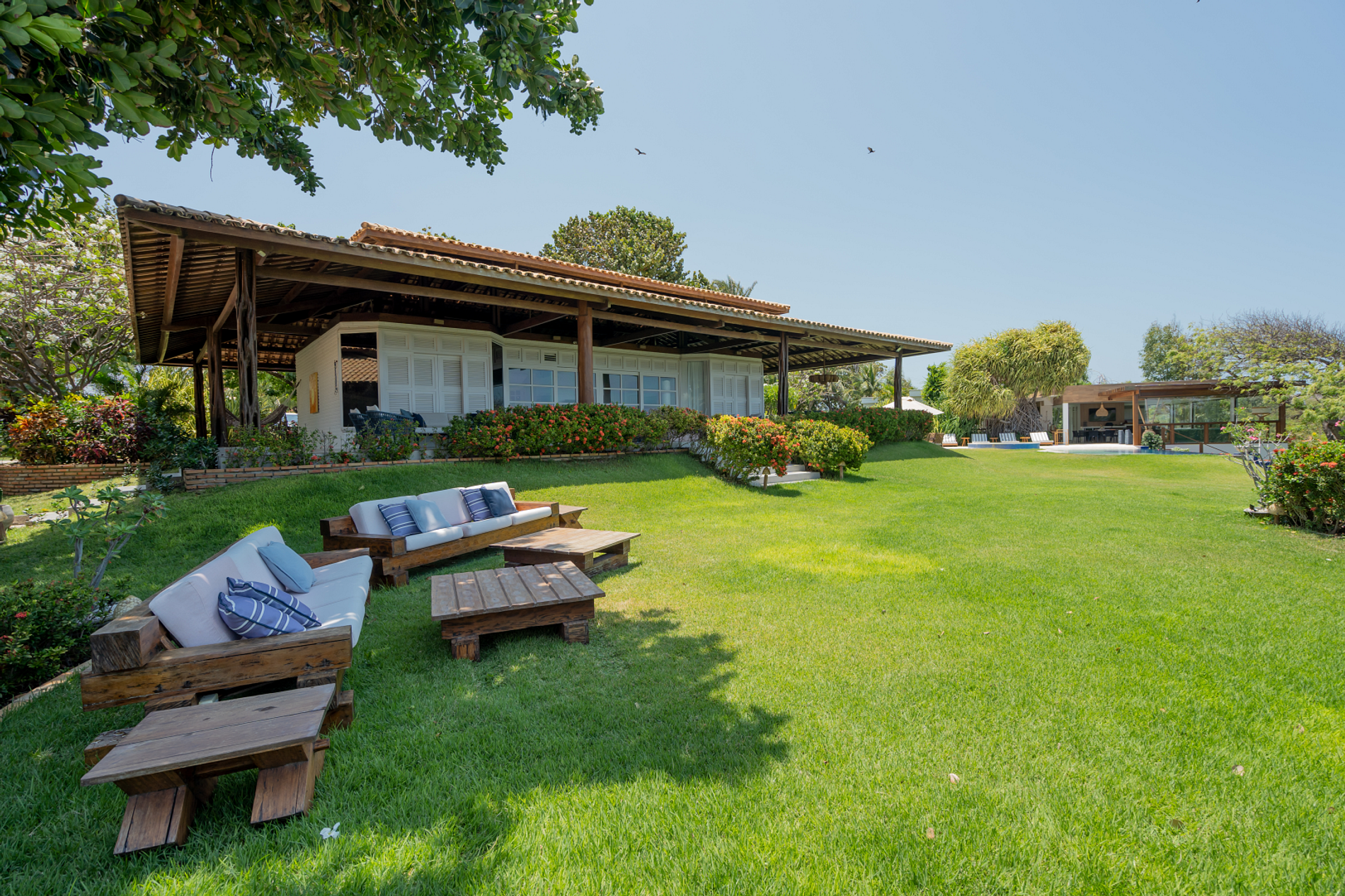 With a beautiful decoration, this beachfront villa has seven suites, a swimming pool overlooking the sea, a sports court and support on the sand, with chairs and tables.