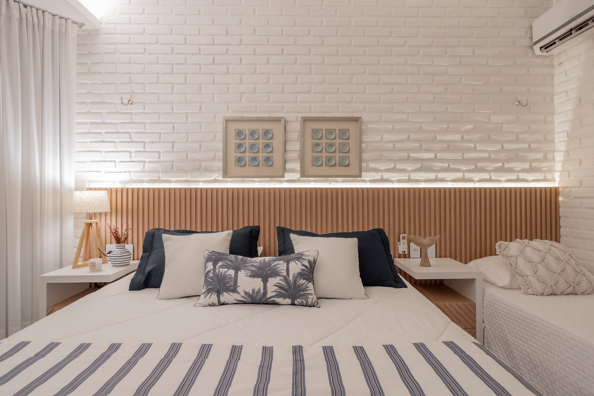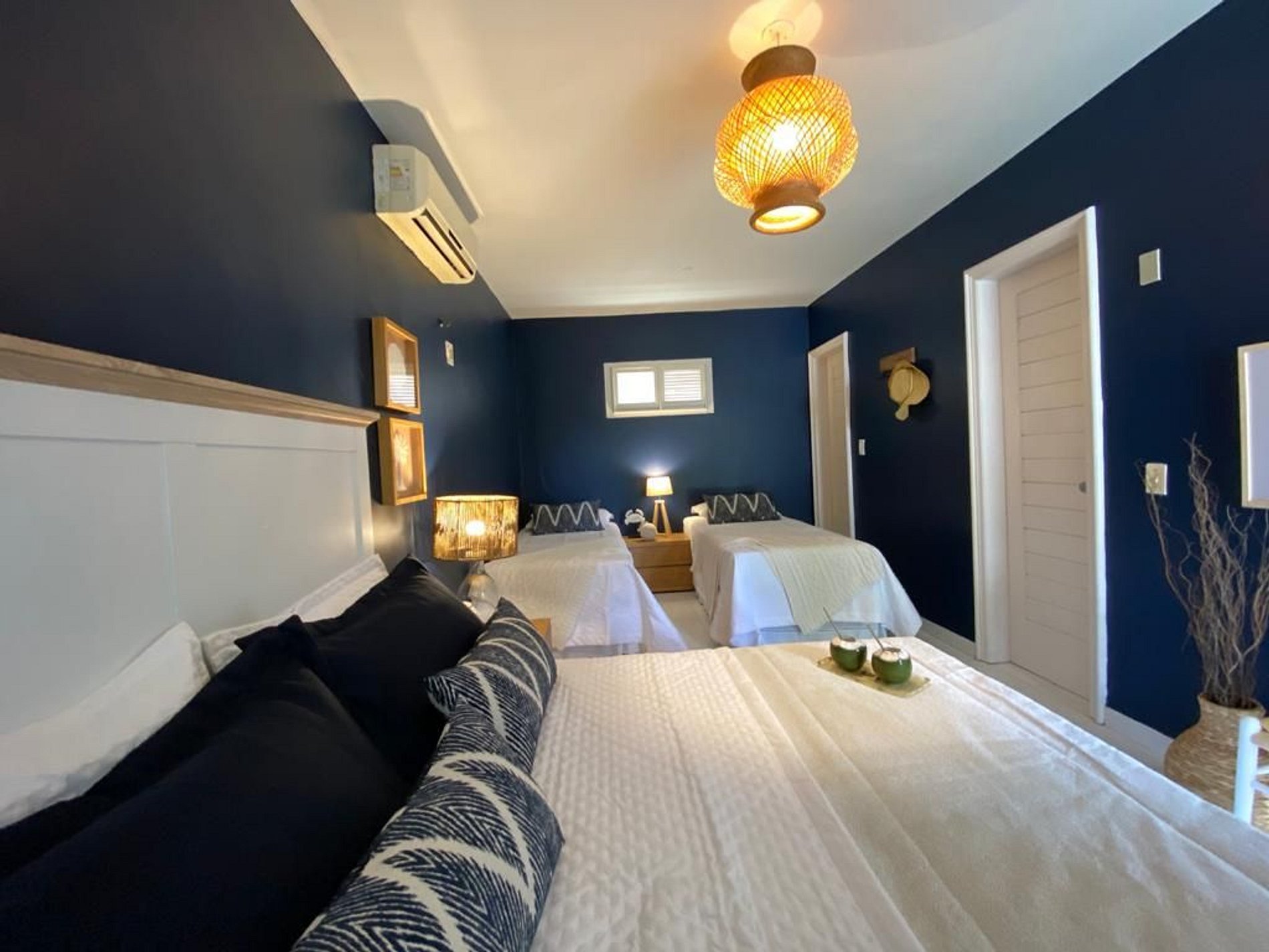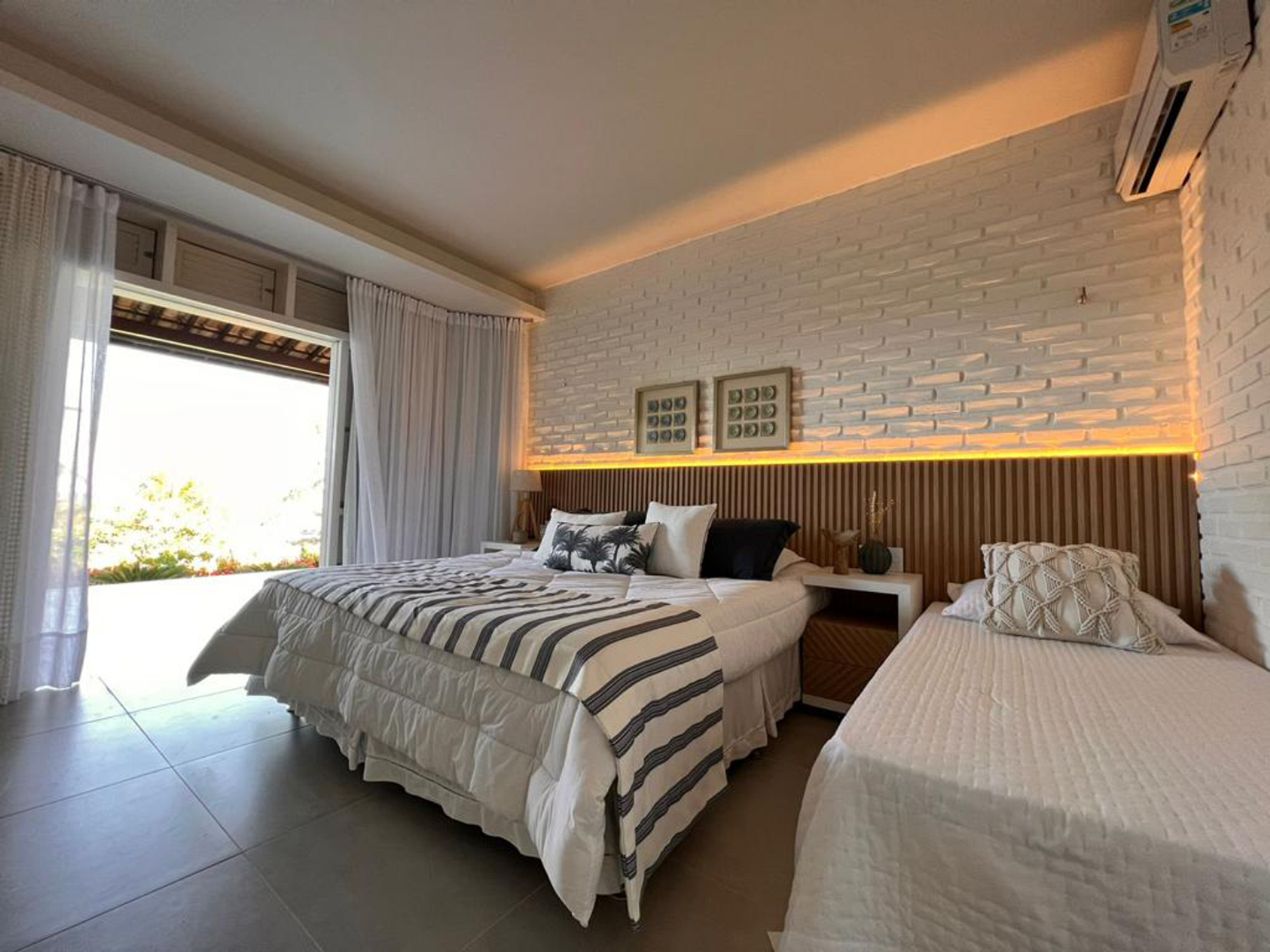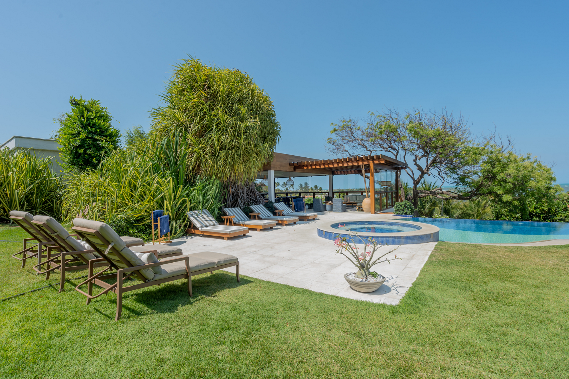With a beautiful decoration, this beachfront villa has seven suites, a swimming pool overlooking the sea, a sports court and support on the sand, with chairs and tables.