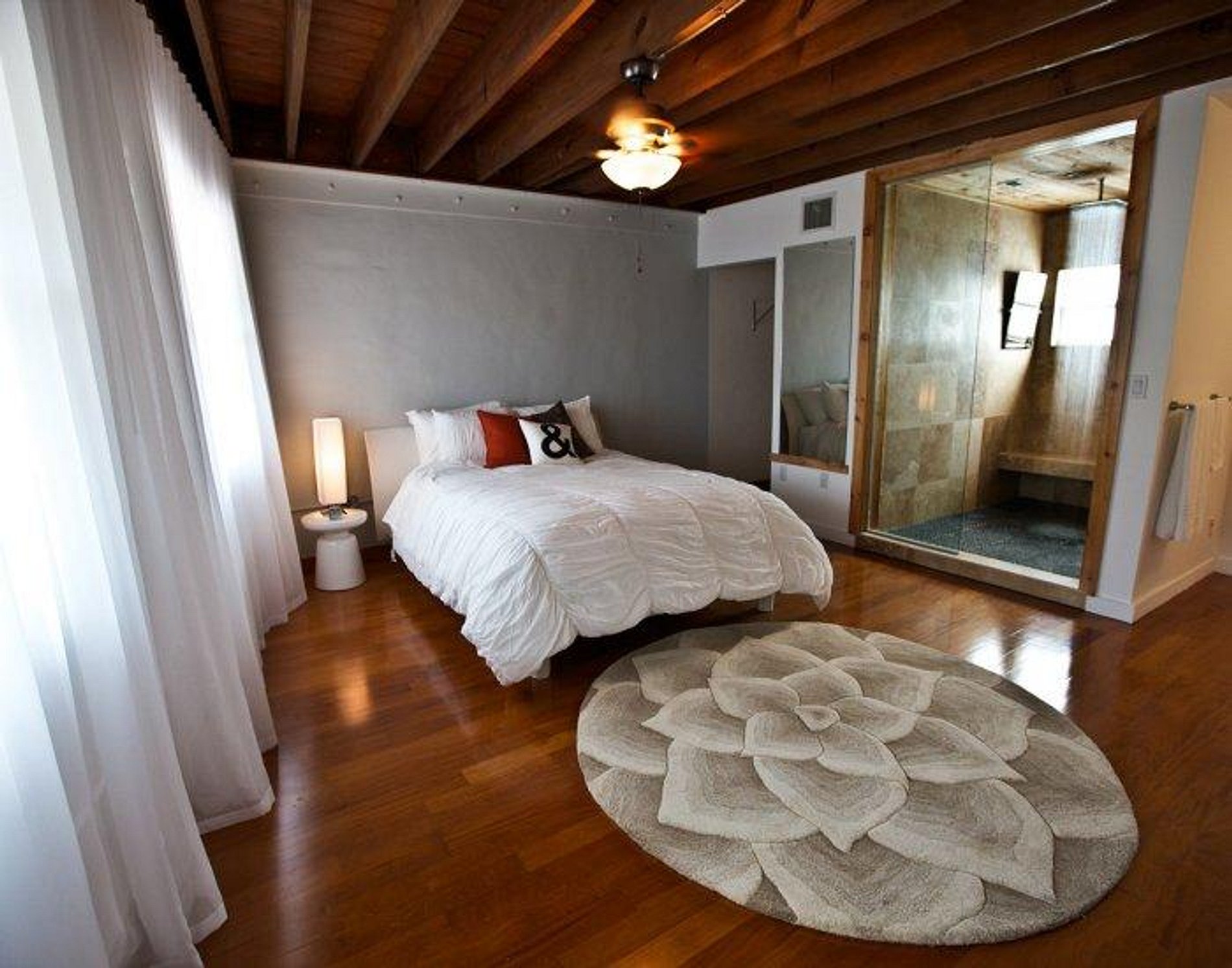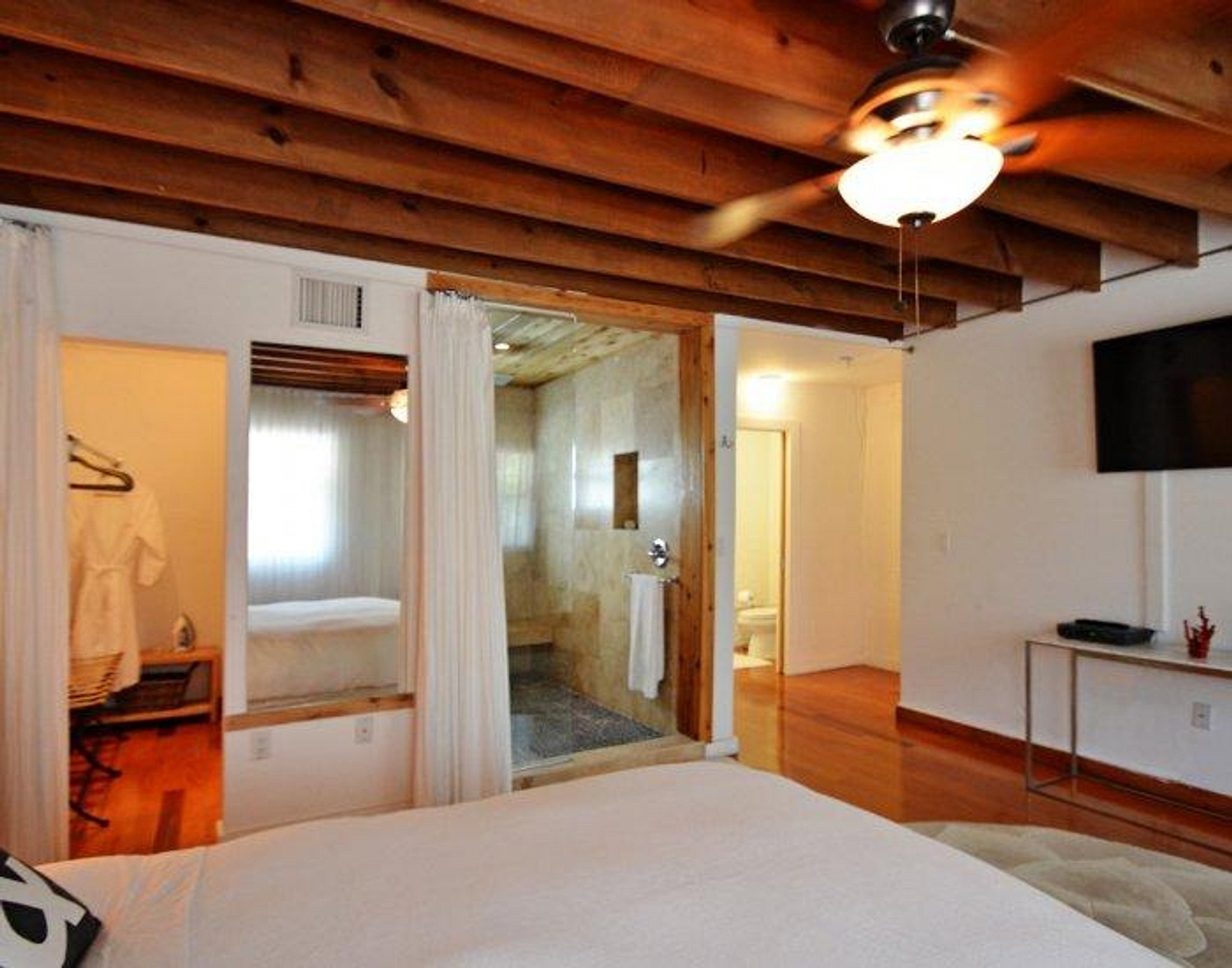 Upon entering, you will find a smartly styled living room and kitchen with décor featuring a mix of wooden panels and white walls, giving the space a homey yet modern feel. The sofa doubles as a comfortable queen-size bed with a half bathroom (sink and toilet) on the ground floor – a great addition if you have Guests spending the night. Follow the stairs up to the spacious master bedroom that boasts an alluring walk-in shower room.