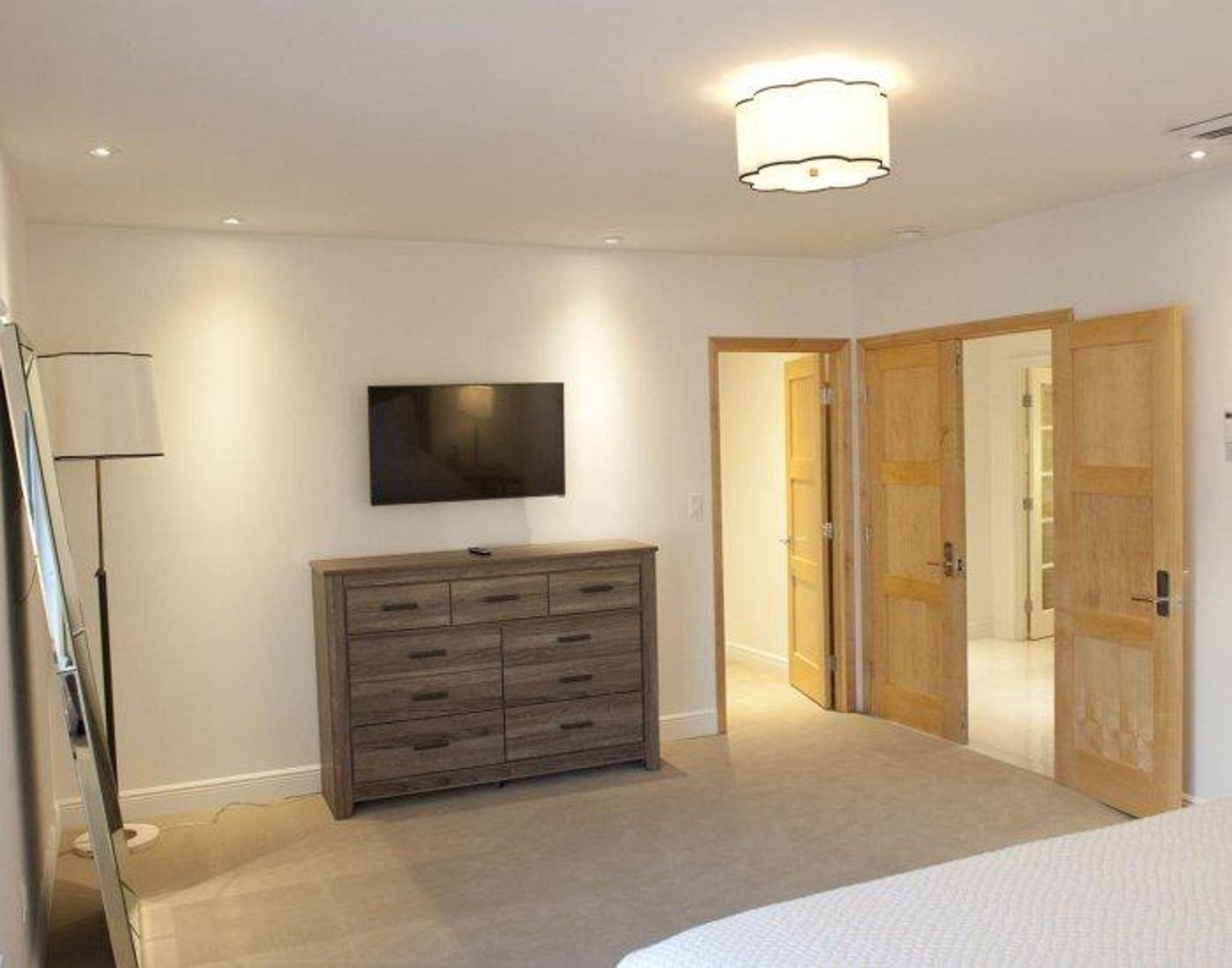 The master bedroom has a king-size bed and a plush carpet. The master bathroom is nearly a full room unto itself, with a vanity mirror, bathtub and all of the essentials. A cavernous walk-in closet, adjacent to the master bedroom, has enough space for all of your things and then some. The second bedroom has a queen-size bed, a walk-in closet and more plush carpeting.