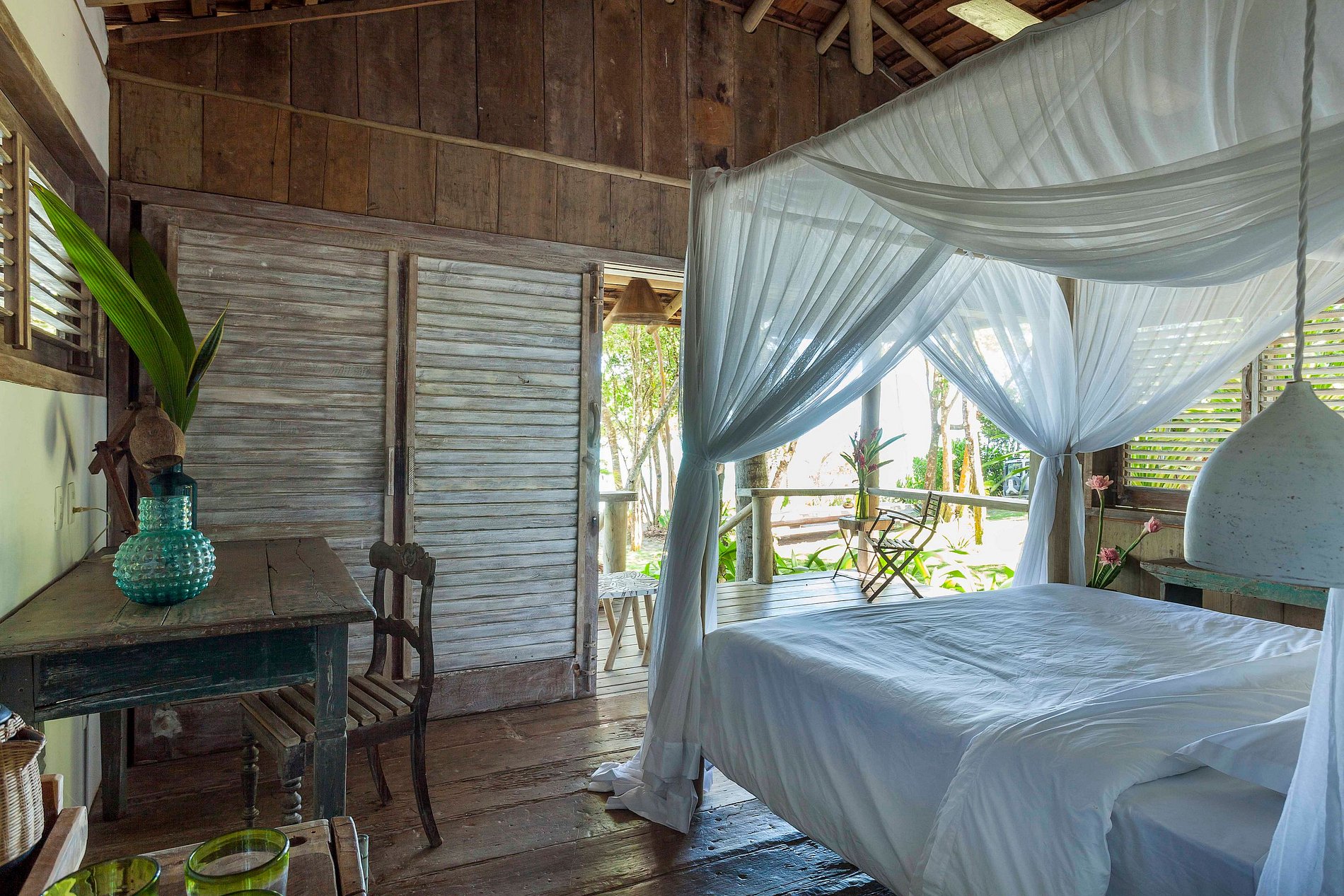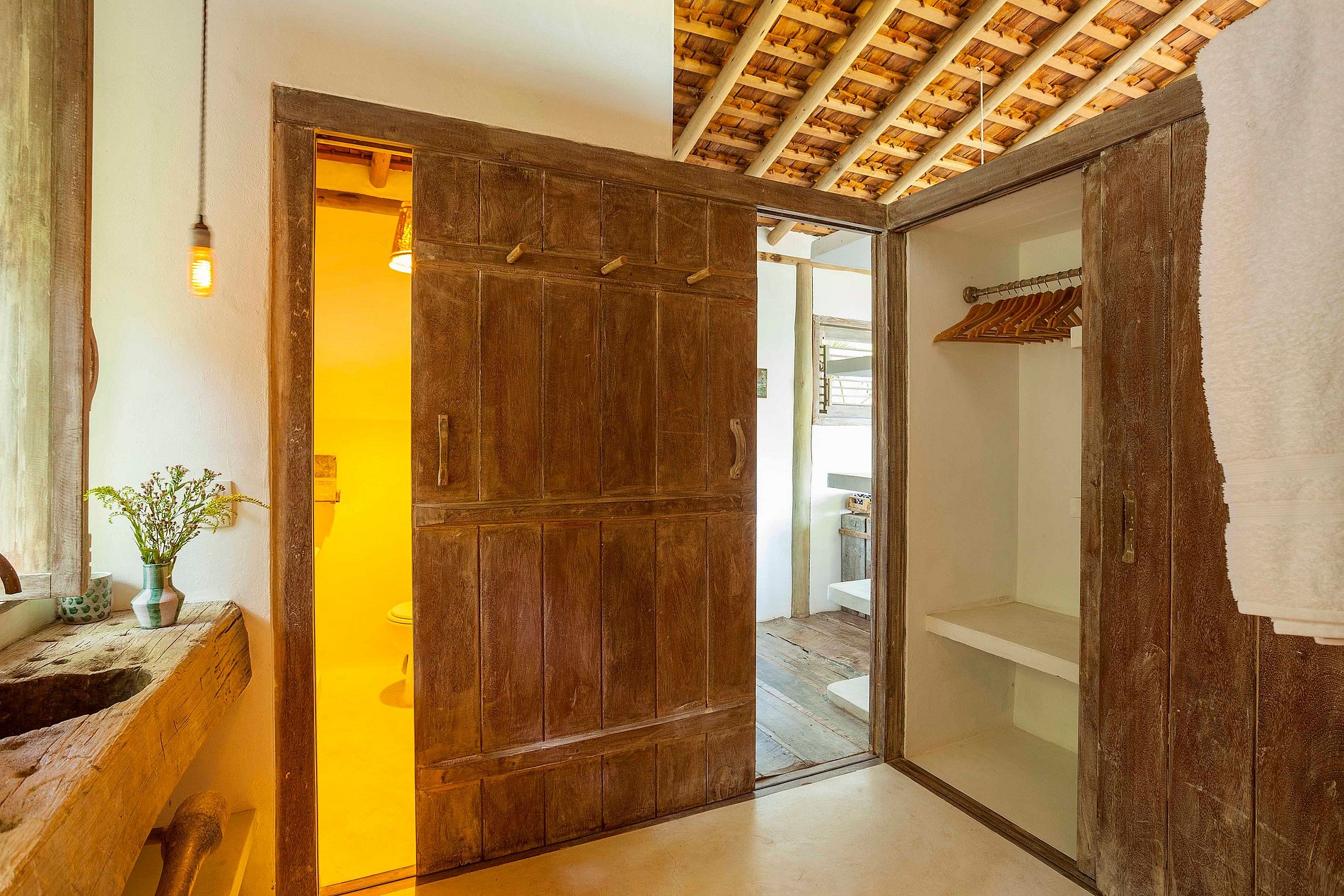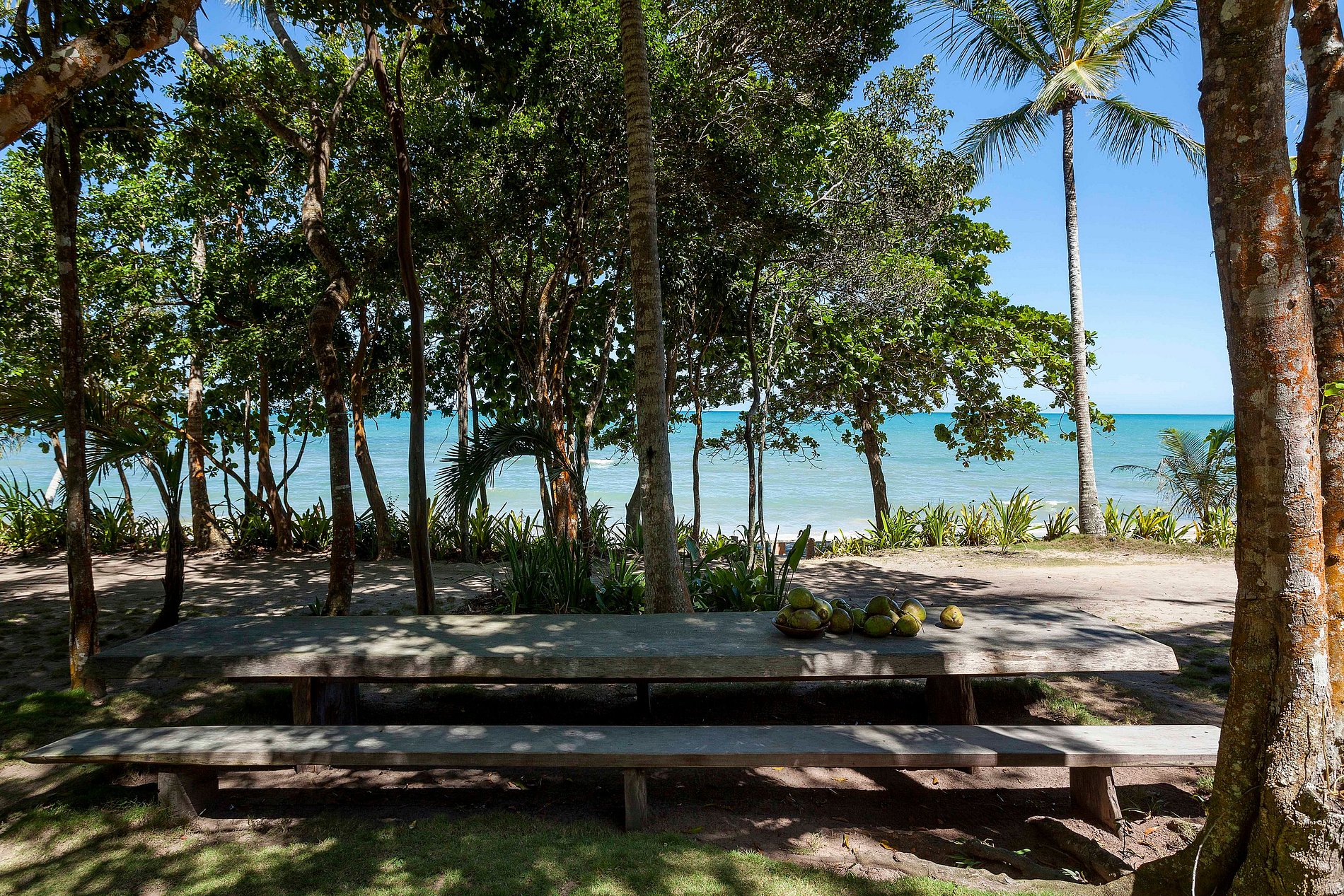 This 300m² house has a private garden on the sand, outdoor vintage shower and bathtub, sea views from the terrace, kitchen, dining rooms, living room, master suite and outdoor bungalow, rustic dining table in the garden facing the beach.